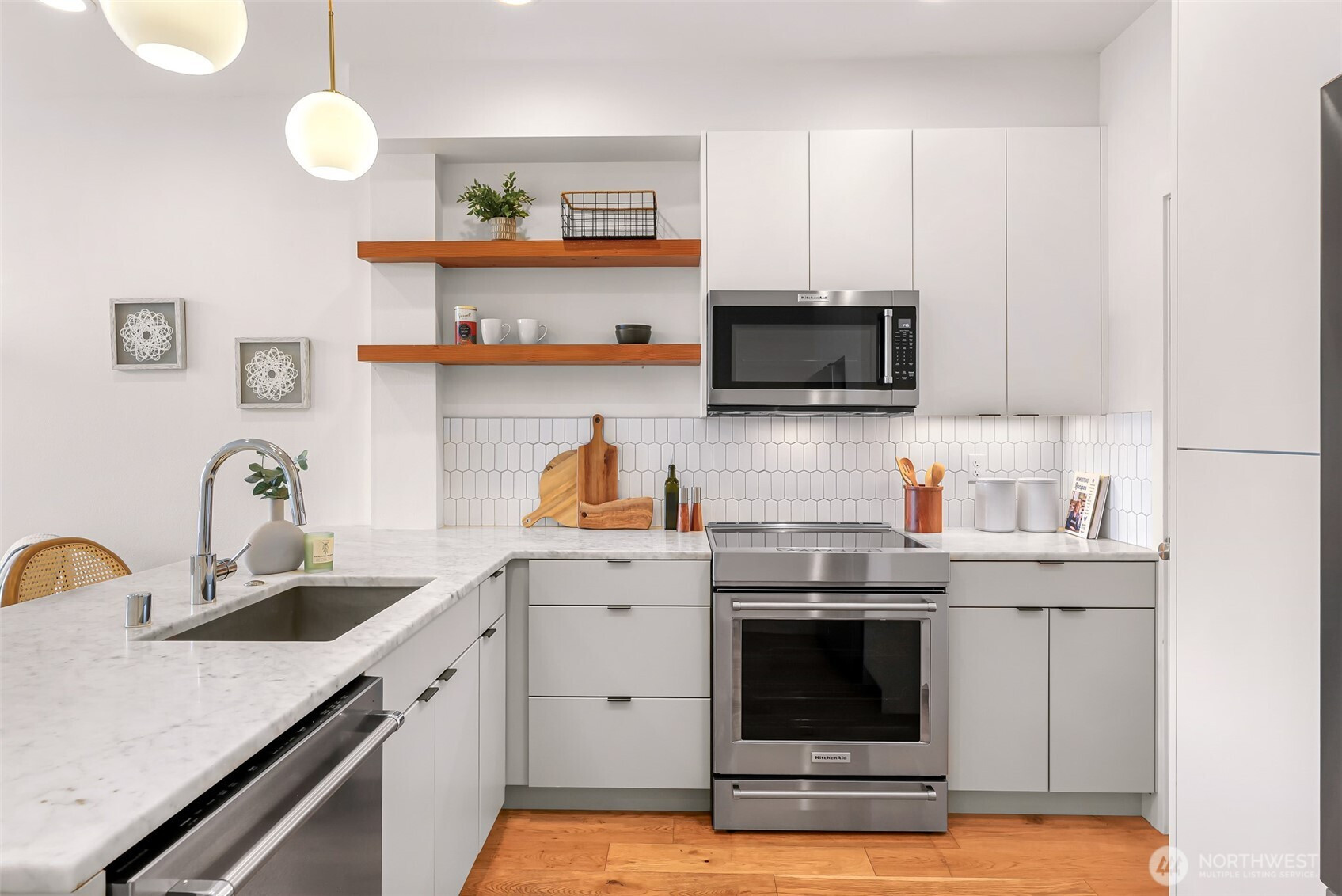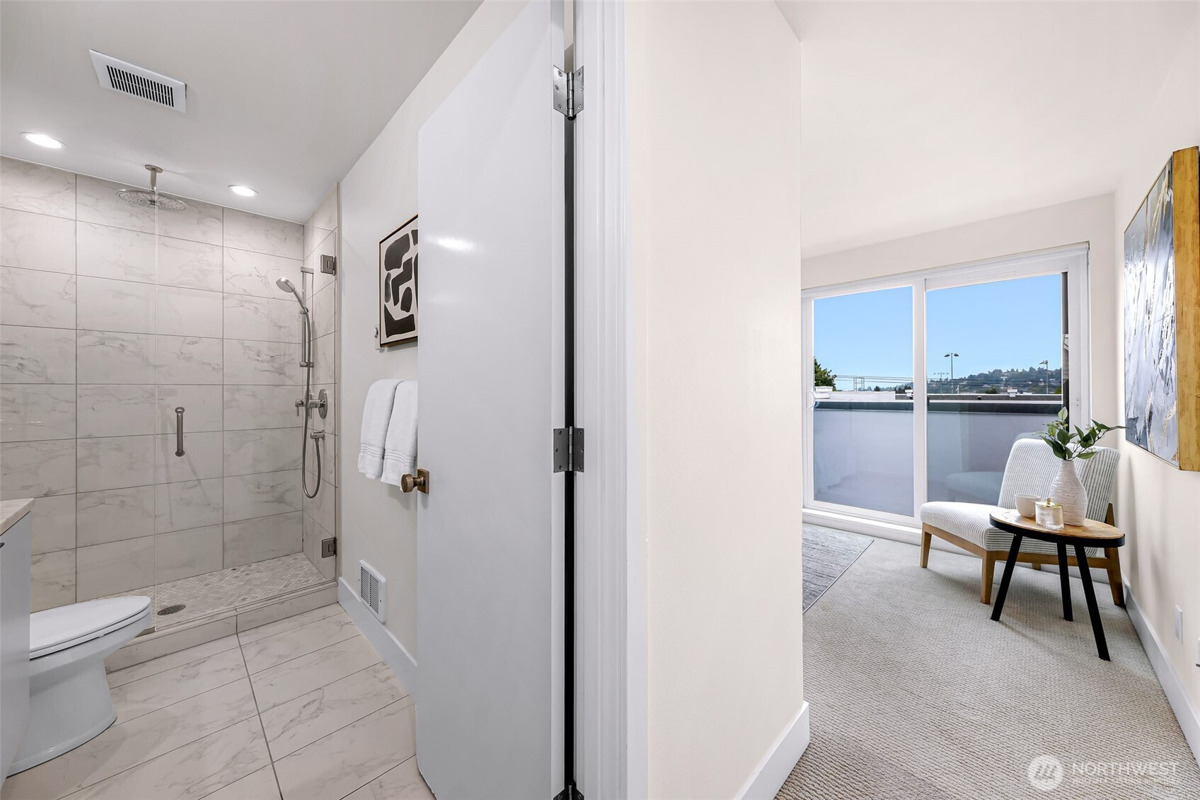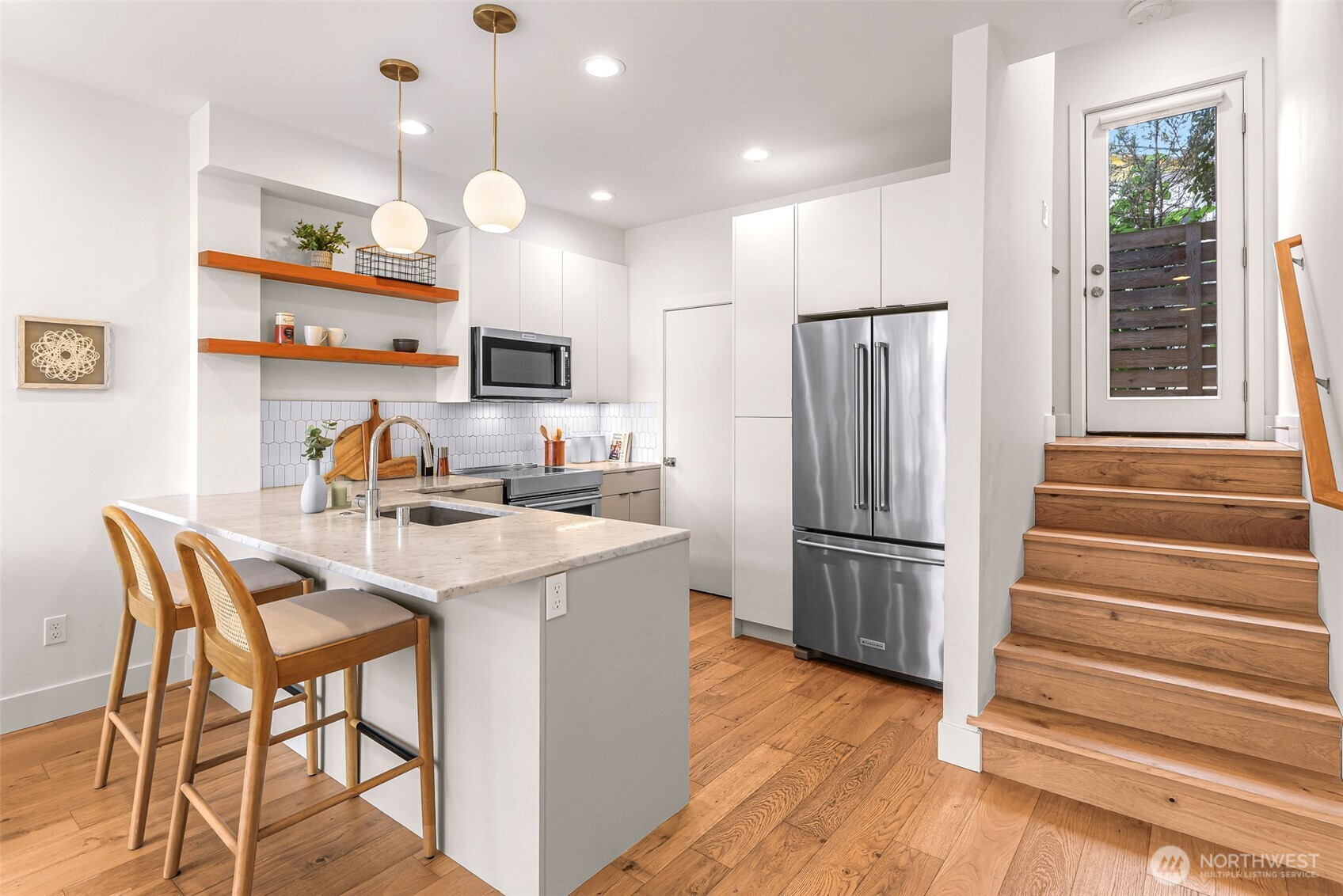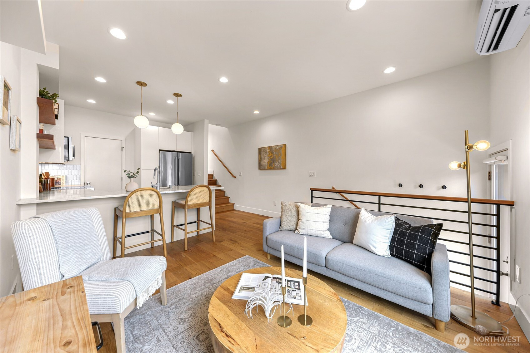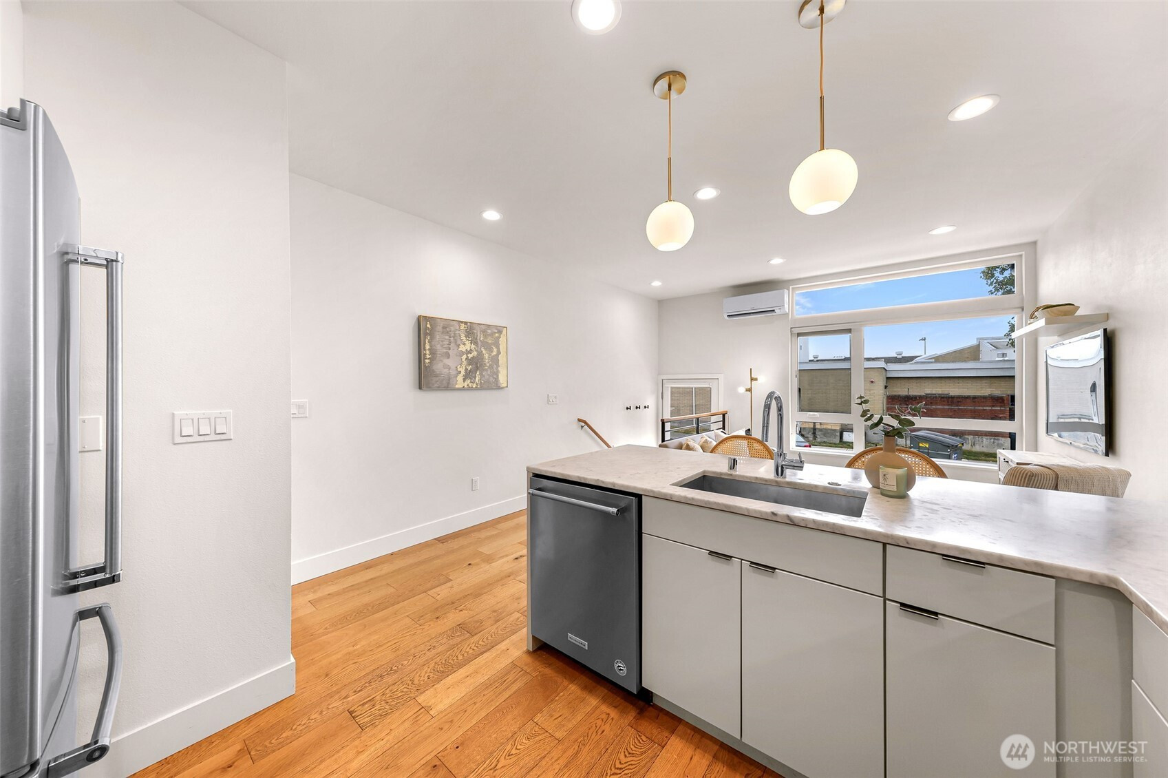 Modern stylings, masterfully built, & a sophisticated touch are what you’ll find here! Step inside to an elevated & optimized floor plan w/engineered hardwoods & perfect lighting. The kitchen offers marble counters, SS appliances, tile backsplash, & plenty of space to inspire the chef in anyone. Upstairs you’ll find a well sized bedroom, full bath, & laundry all well-spaced out. Up one floor is the beautiful primary bedroom w/en-suite bath, ample closet space, & a balcony. Head up to the private rooftop deck made for entertaining with gorgeous territorial & peek-a-boo mountain views. Many transit options & a high walk/bike score + 1 designated parking = the perfect mix! Near all the best amenities Ballard has to offer – truly a must see!