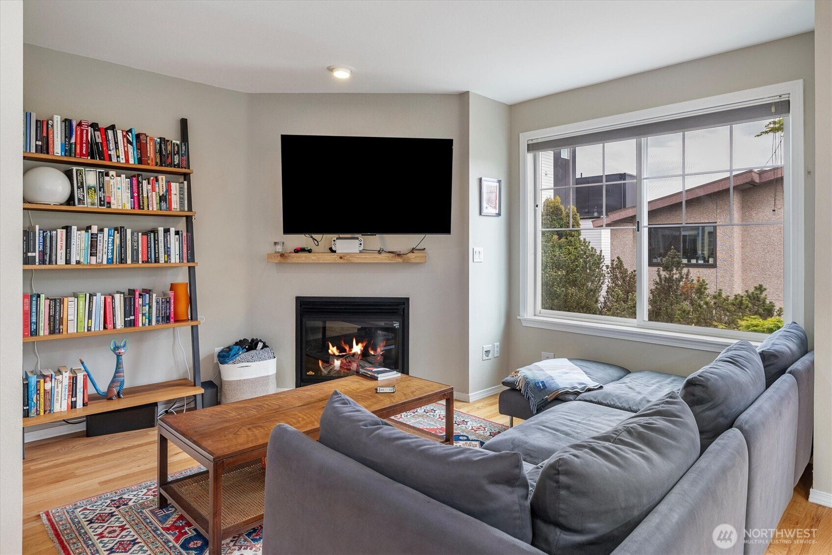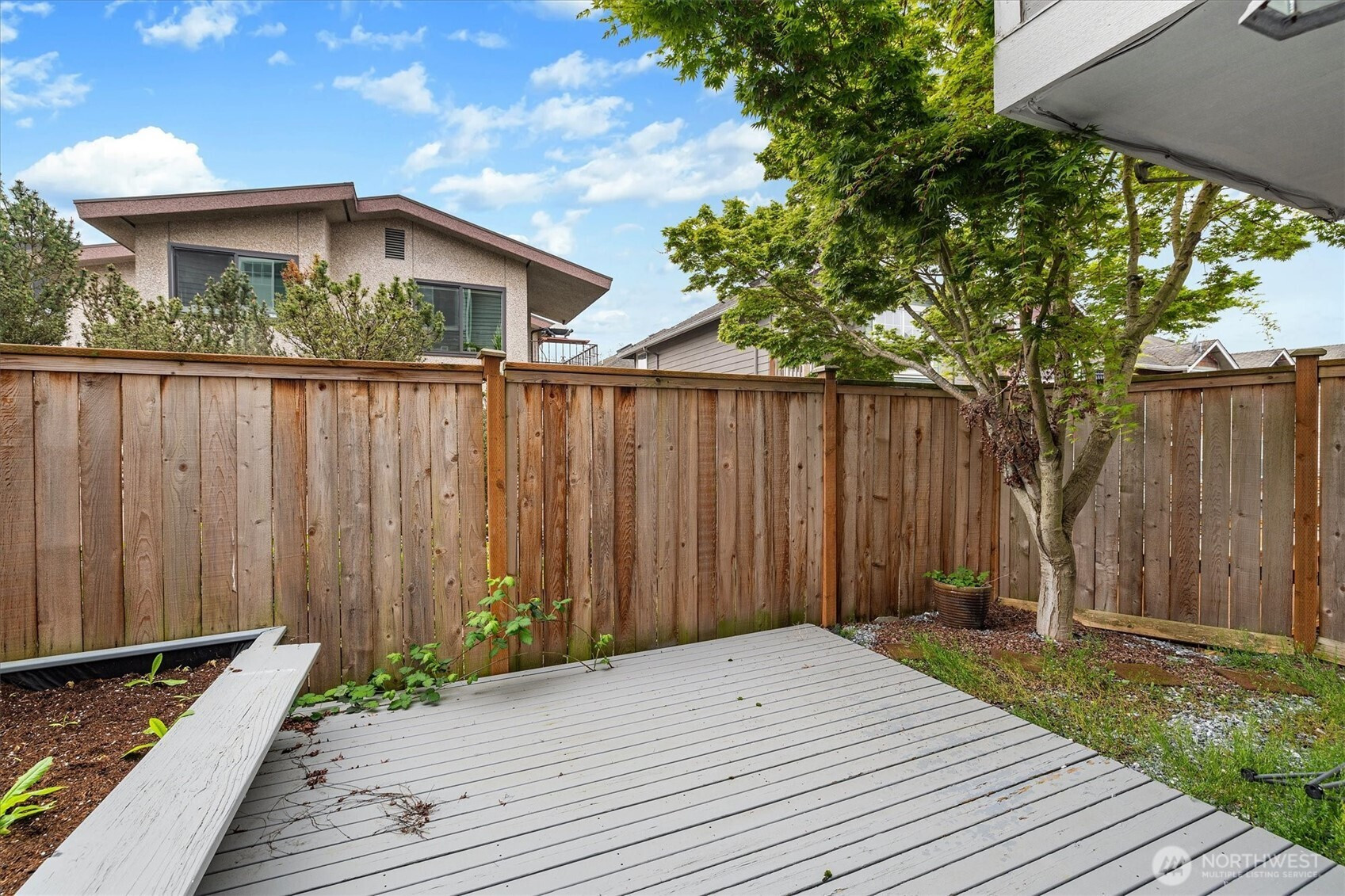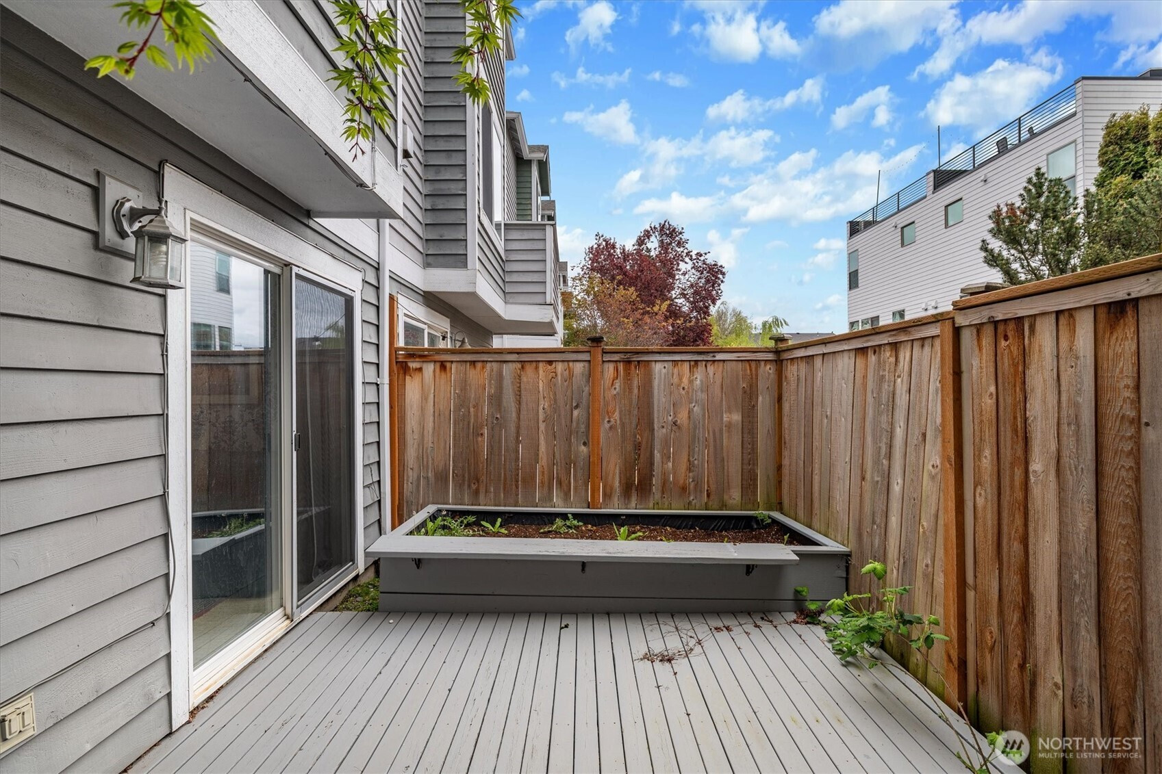 Welcome to this bright, thoughtfully designed 3-bedroom, 2-bath Ballard townhome offering 1,320 square feet of stylish living just blocks from the Ballard Locks, Golden Gardens, and the vibrant shops and restaurants that make this neighborhood one of Seattle's most sought-after. The great room layout features beautiful hardwood floors, a spacious living room with gas fireplace, and seamless access to a private deck — perfect for relaxing or entertaining. The kitchen is a standout with white quartz countertops, stainless steel appliances, a Wolf gas range, and a generous breakfast bar. Upstairs, two large bedrooms with vaulted ceilings share a Jack & Jill bath, with the convenience of an in-unit laundry room. The entry level offers a versatile third bedroom or home office with a slider opening to a fully fenced backyard — an urban oasis ideal for al fresco dining and gardening. A garage provides parking or additional storage. Walk to the Ballard Farmers Market on Sundays, stroll the Locks on a summer evening, or hit the sand at Golden Gardens — this is Ballard living at its best.