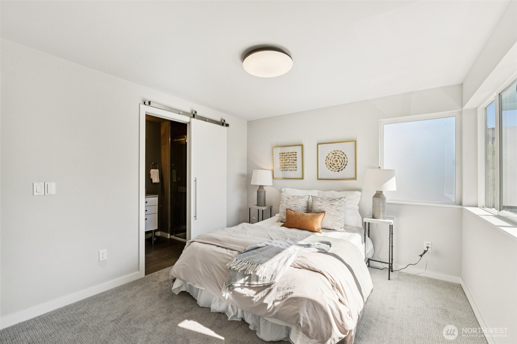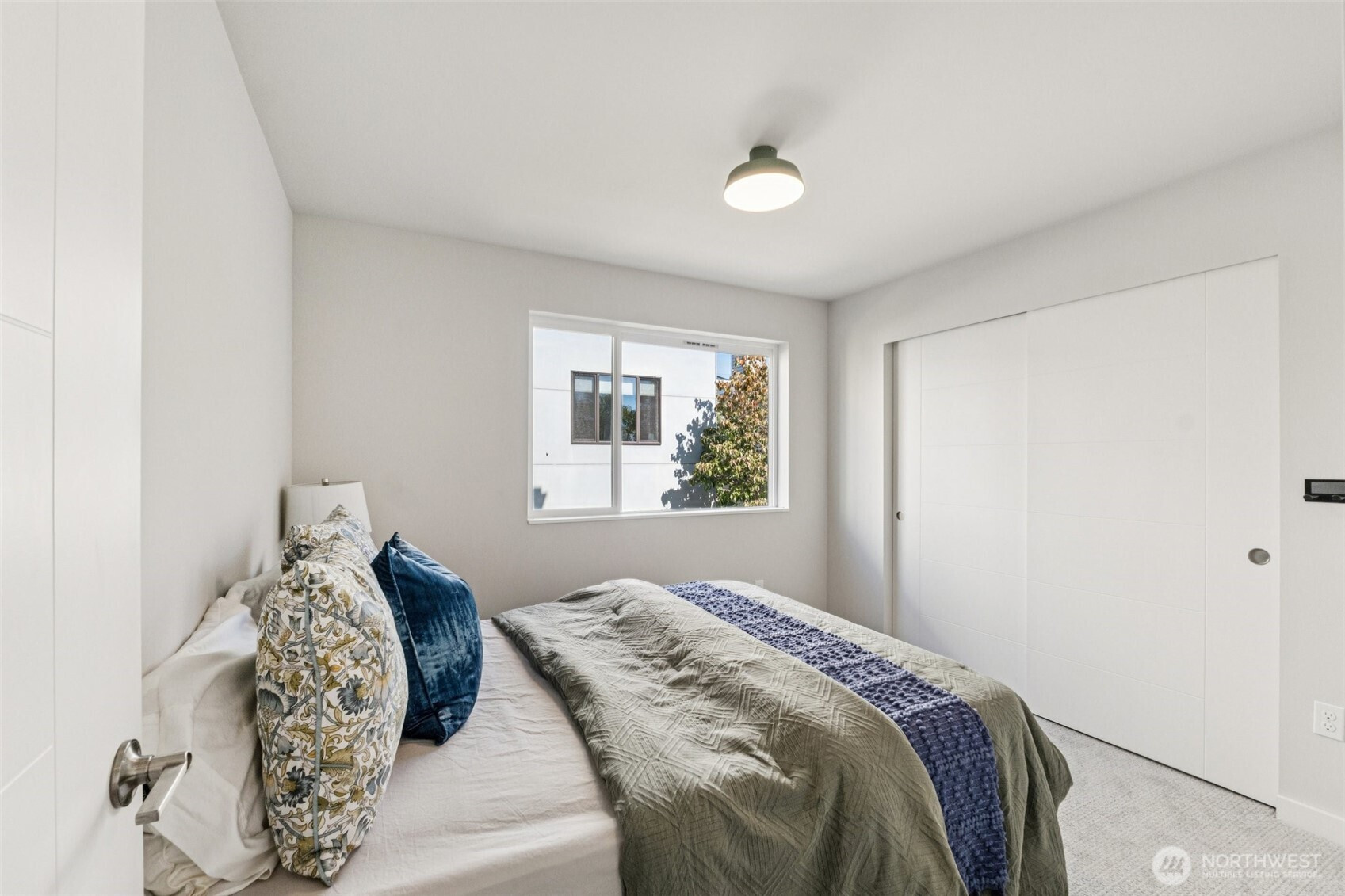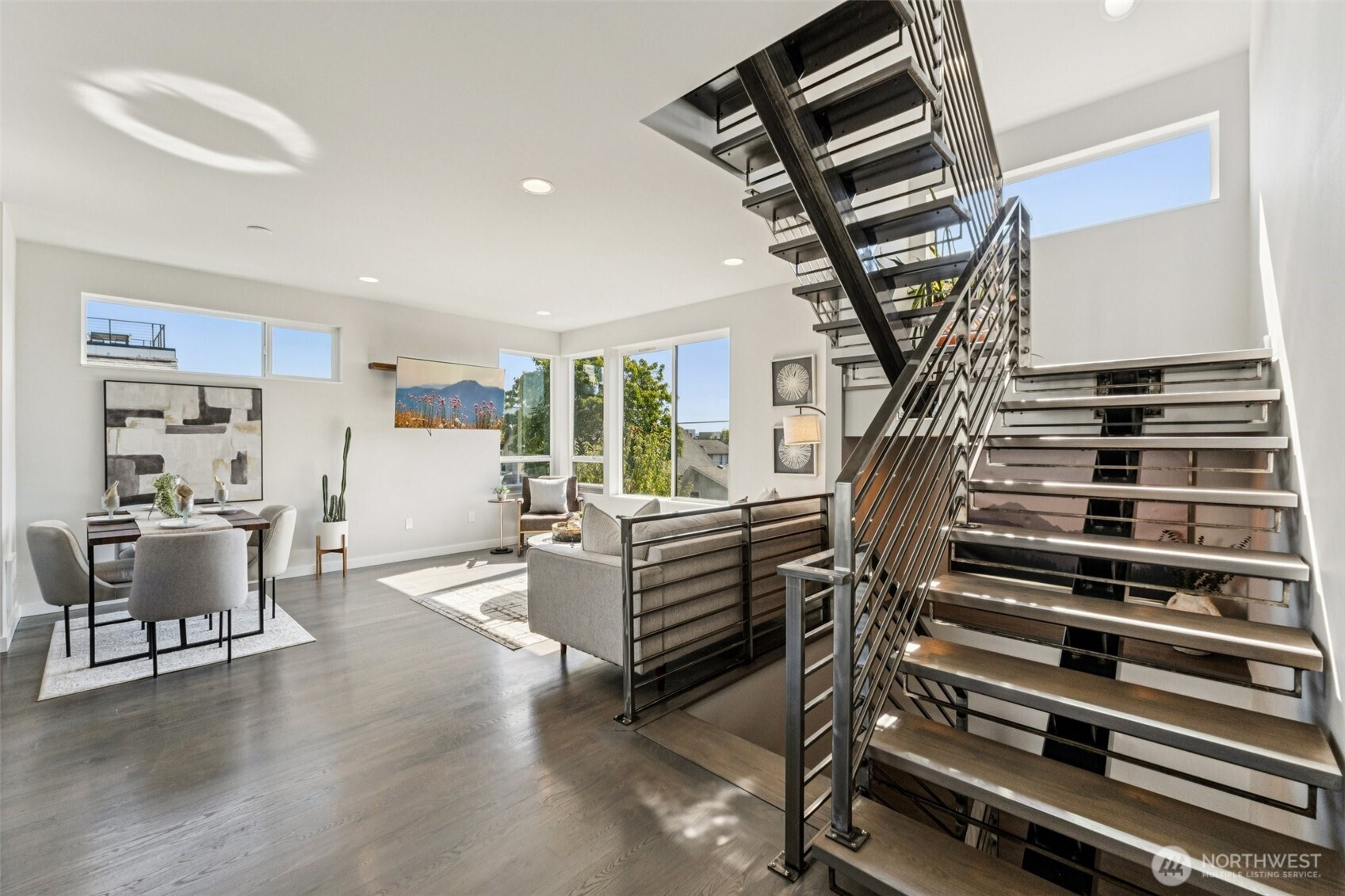 Discover modern living in the heart of Ballard. This light-filled 3-bed, 2-bath townhome sits on a quiet, tree-lined street & features oversized windows, fresh paint, new carpet, & designer-stained oak hardwoods. The entry level offers a welcoming foyer with a custom steel staircase, bdrm, bth, & W/D. The 2nd level hosts a spacious primary suite & add’l 3rd bdrm. Upstairs, enjoy open-concept living with a chef’s kitchen featuring quartz counters, stainless appliances, & ample storage. Radiant floor heating & a Nest smart system add comfort & efficiency. Relax on the large south-facing view deck with sweeping views. Perfectly situated near the Locks, Discovery Park, Golden Gardens, and all the Ballard has to offer!—with designated parking.