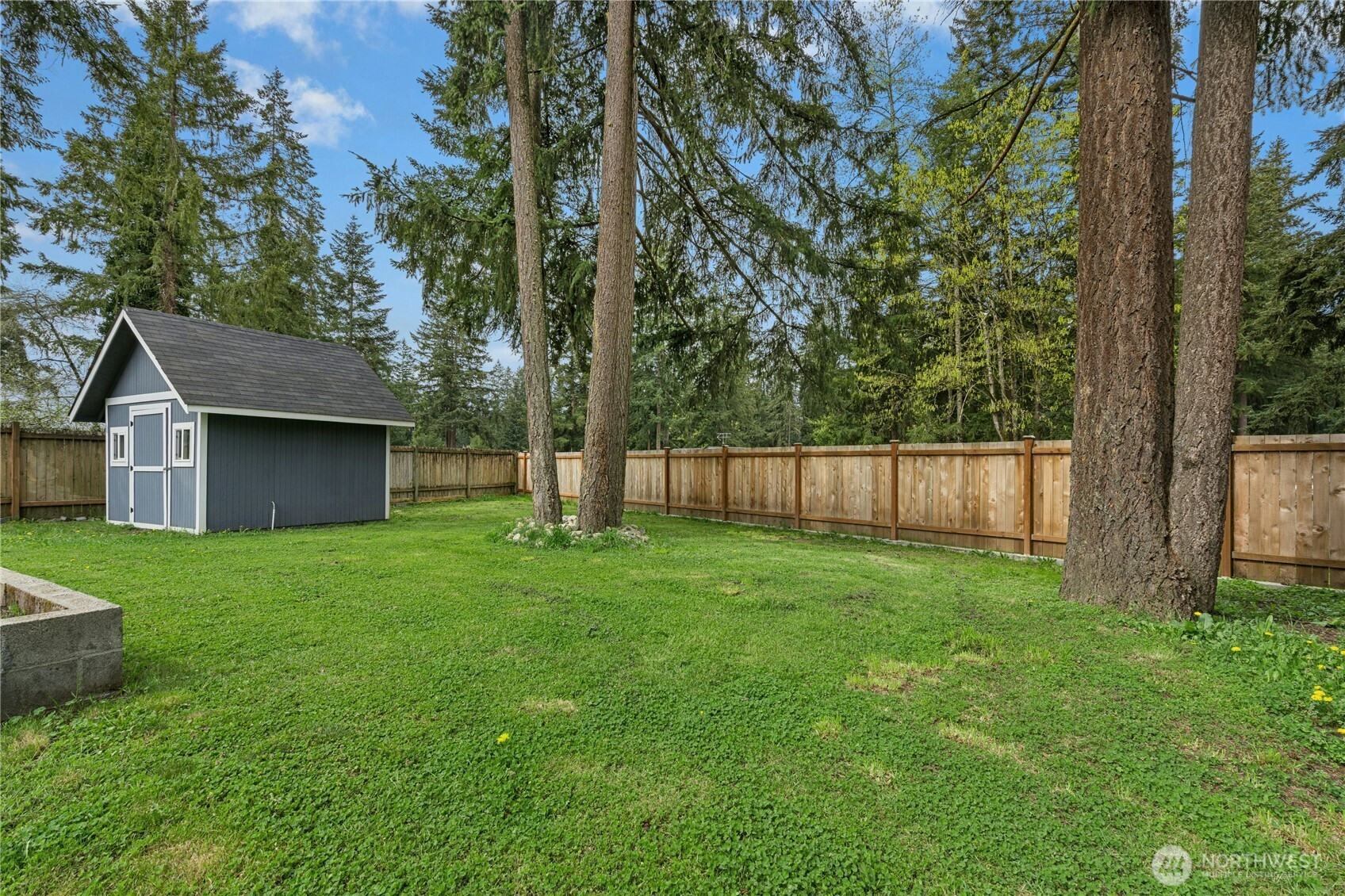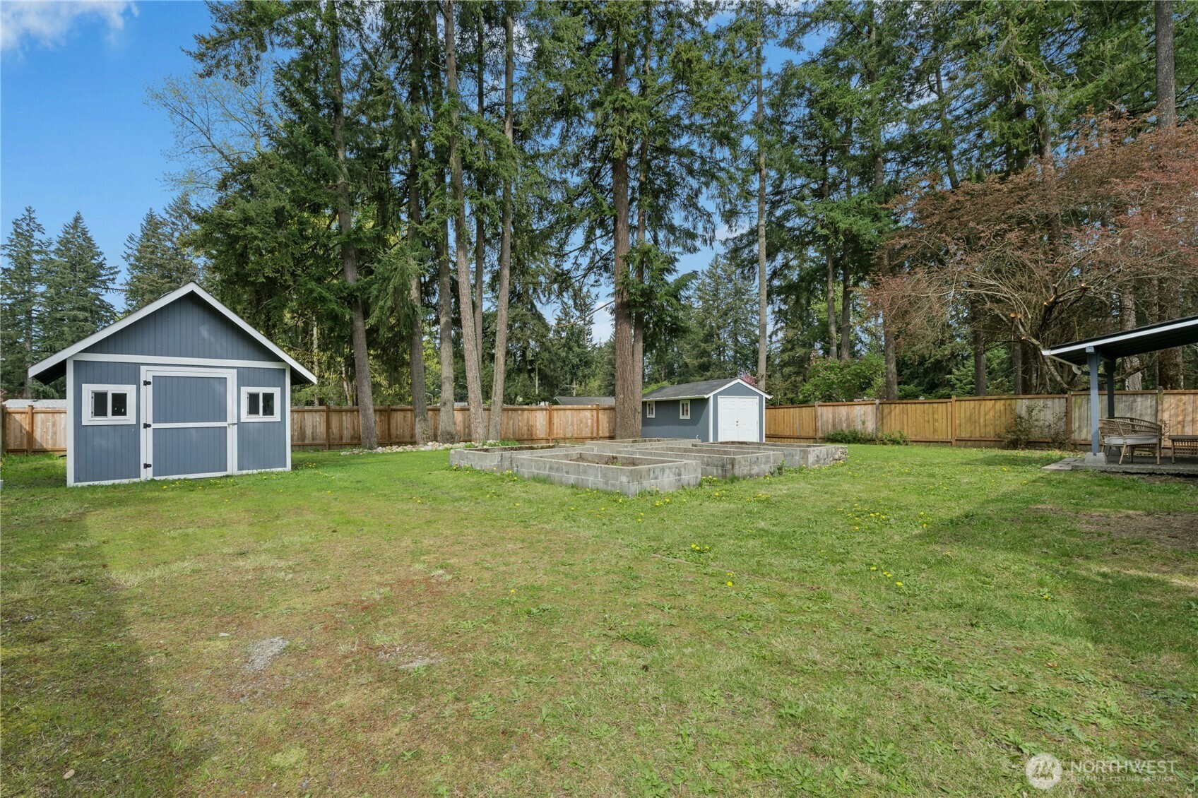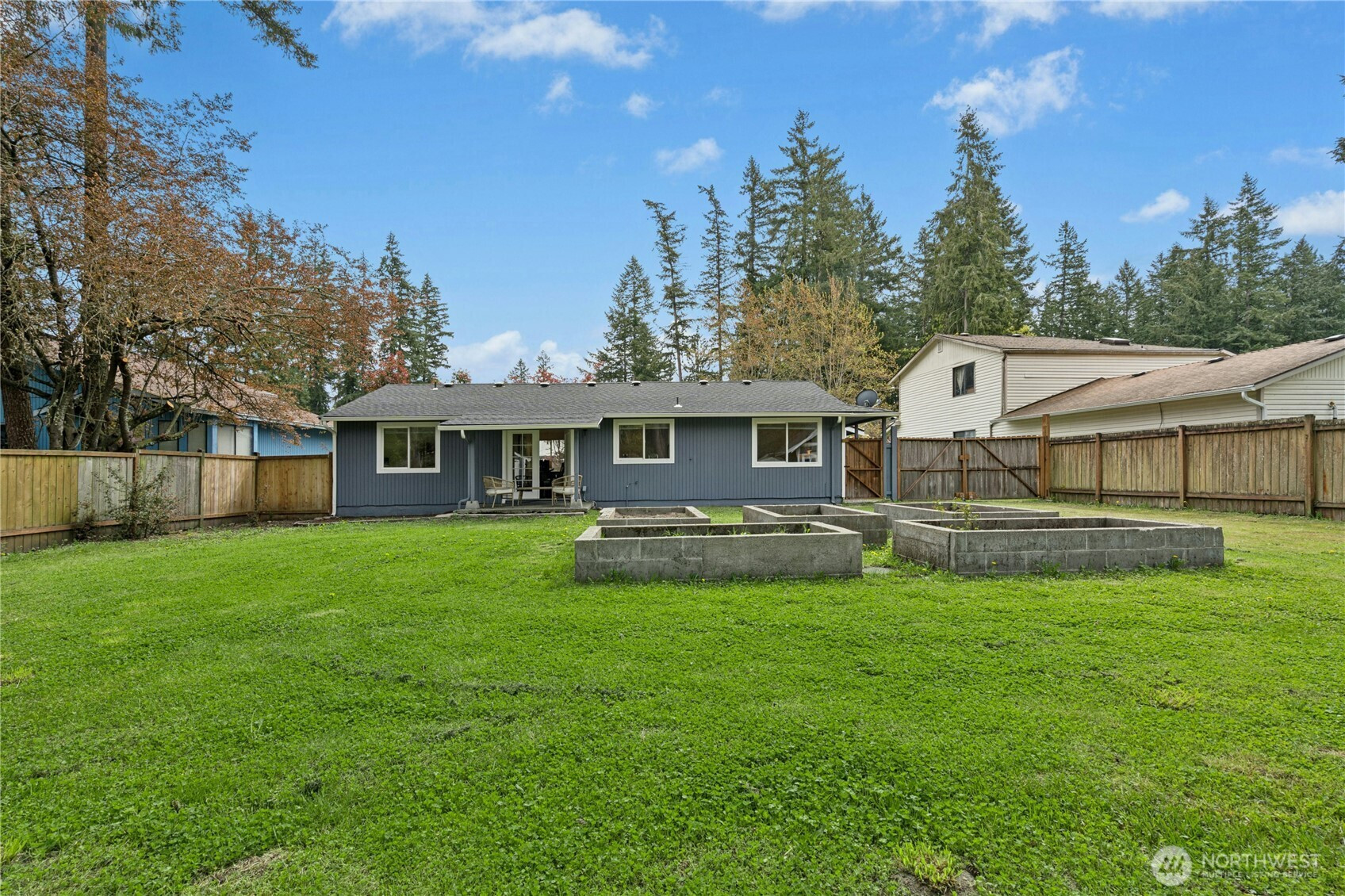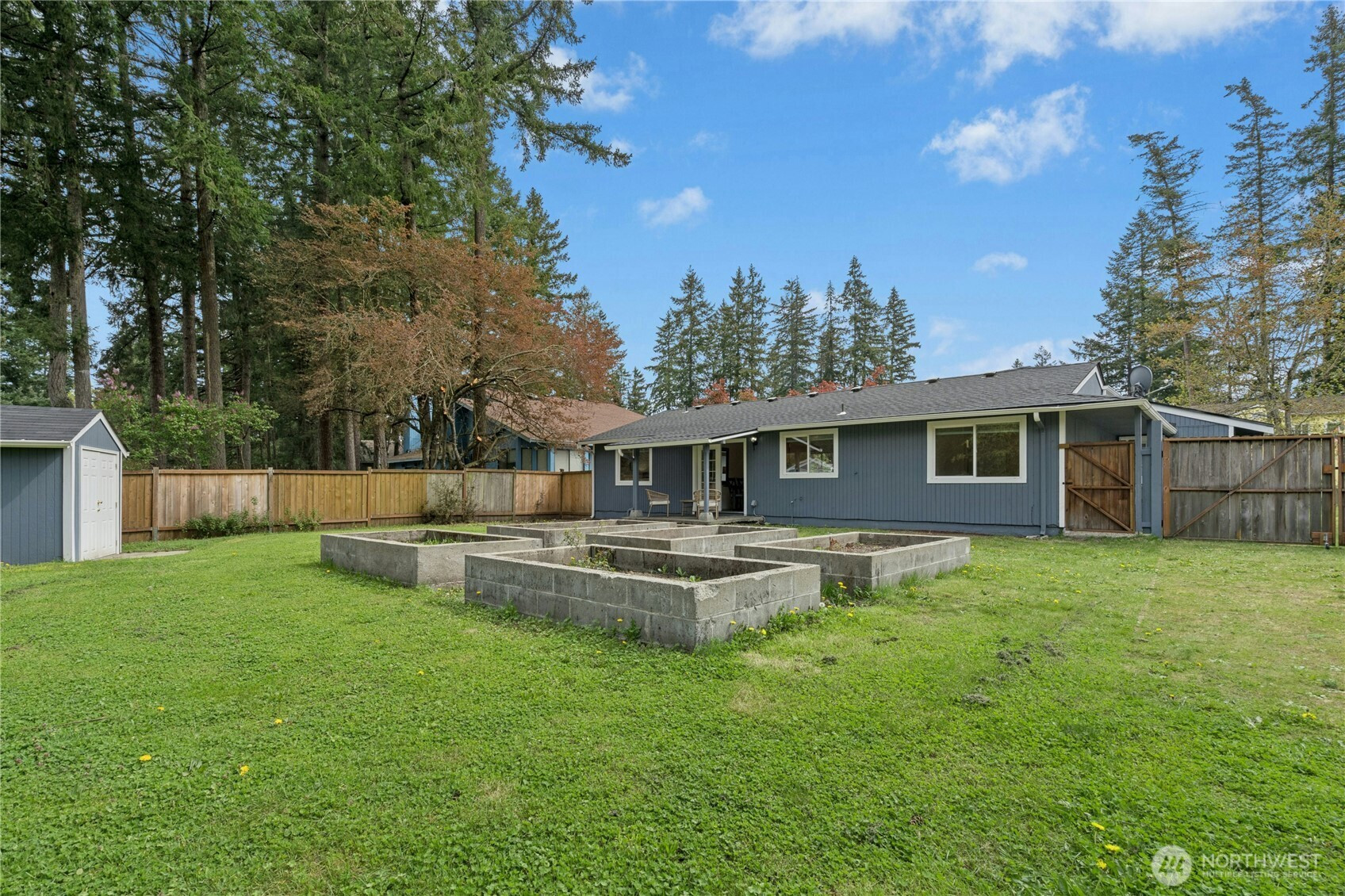 Welcome home to the Timber Hills community of Covington! Enjoy the simplicity of one level living in a home that has been completely refurbished in 2014 and recently refloored with vinyl hardwood plank flooring, fresh coats of paint, and reroofed. The spacious living room with vaulted ceilings is anchored by a slate surround fireplace insert, perfect for cozy nights in. The kitchen in the great room is the hub of the home with custom cabinetry, granite countertops, a breakfast bar island, & Frigidaire appliances. The sleeping quarters live large and are smartly laid out with the primary bedroom on a separate end from the secondary bedrooms. Both bathrooms have been meticulously updated and sparkle with sleek tile shower and bath surrounds & granite counters. The laundry and utility room are conveniently located off the two-car garage that is complete with a workbench, ample shelving, and accessible attic storage. The flat, expansive, fully fenced yard is the perfect spot for outdoor living, a gardener’s delight with raised bed containers, an 8x19’ garden shed, and a 12’x12’ separate structure that flexes as a studio, workshop, or hobby space, both with electricity and concrete flooring. There is even room for your RV. Every detail of this home has been carefully considered to provide comfort & ease for everyday living. It’s just minutes from shopping, dining, & essential amenities. This home is also within walking distance to great schools. You’ll be happy to call this home!