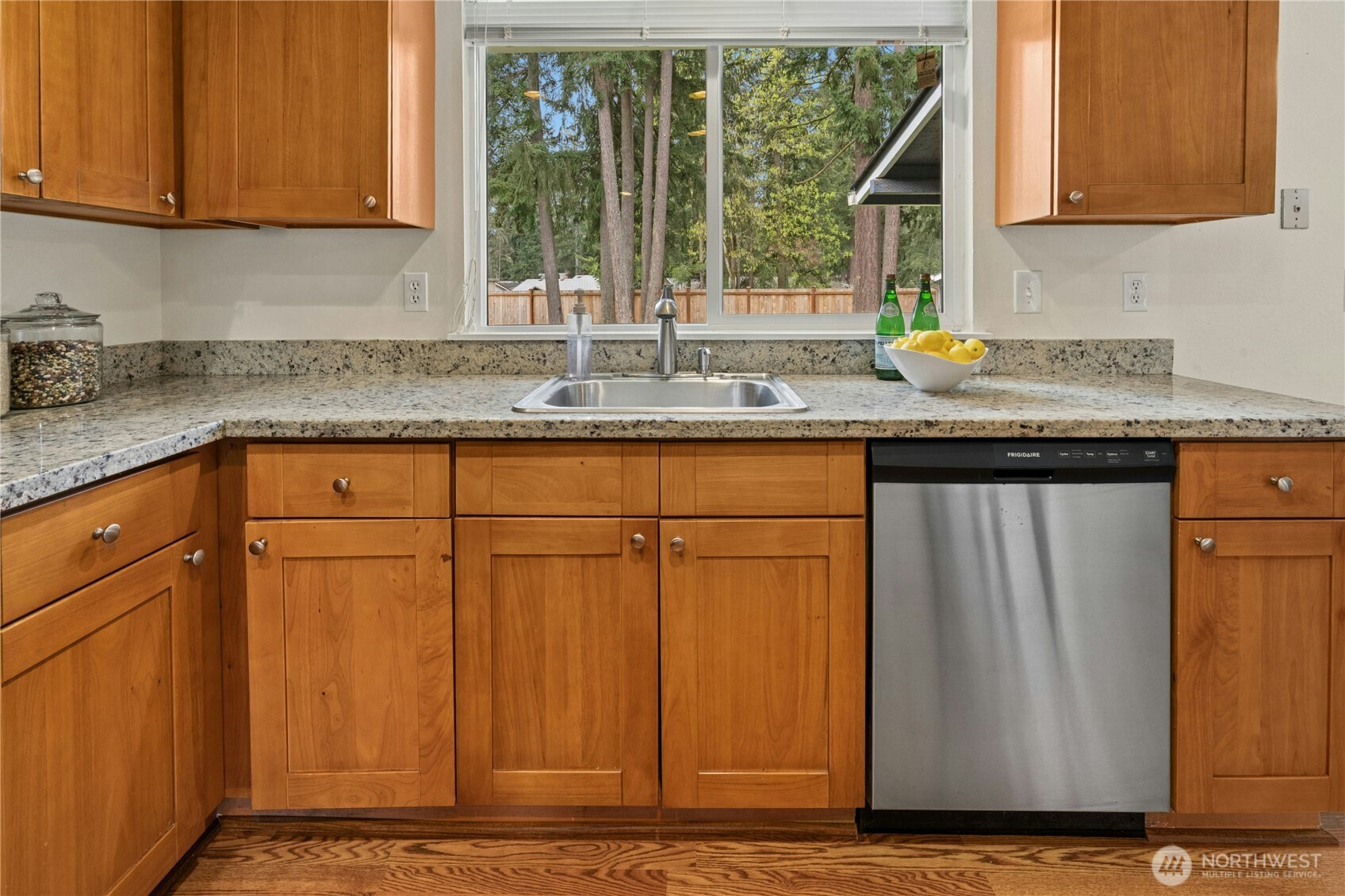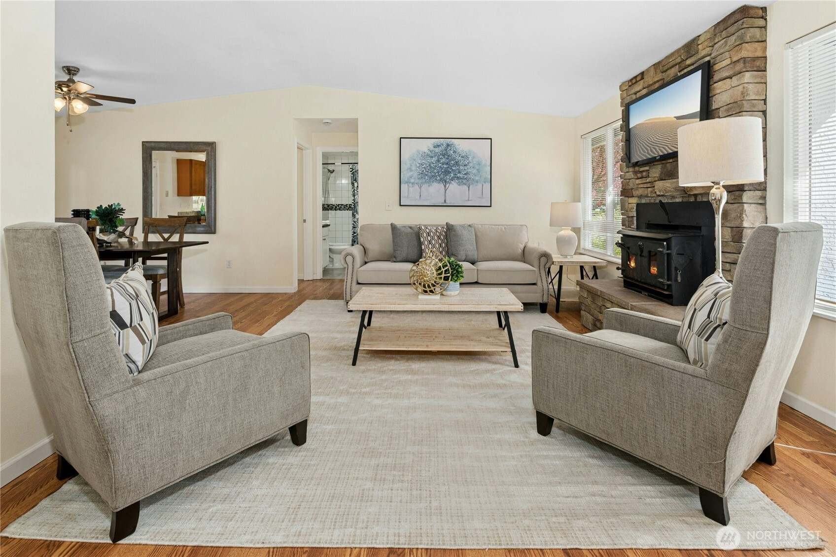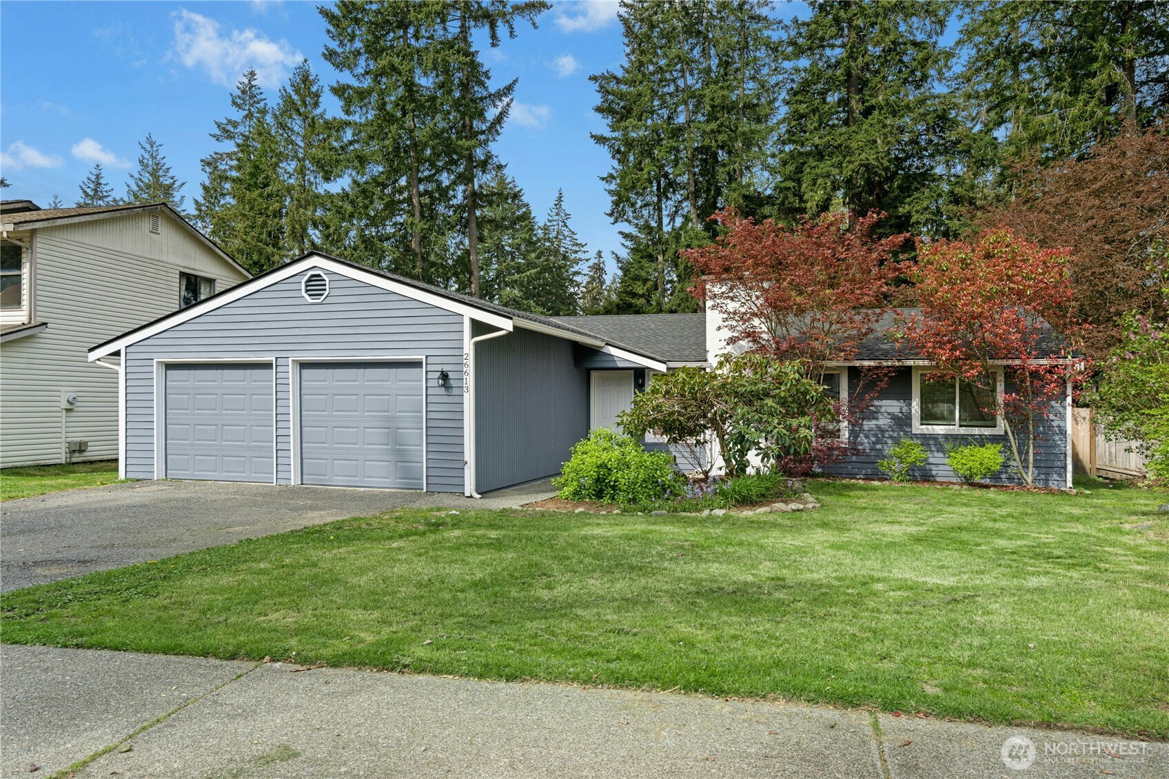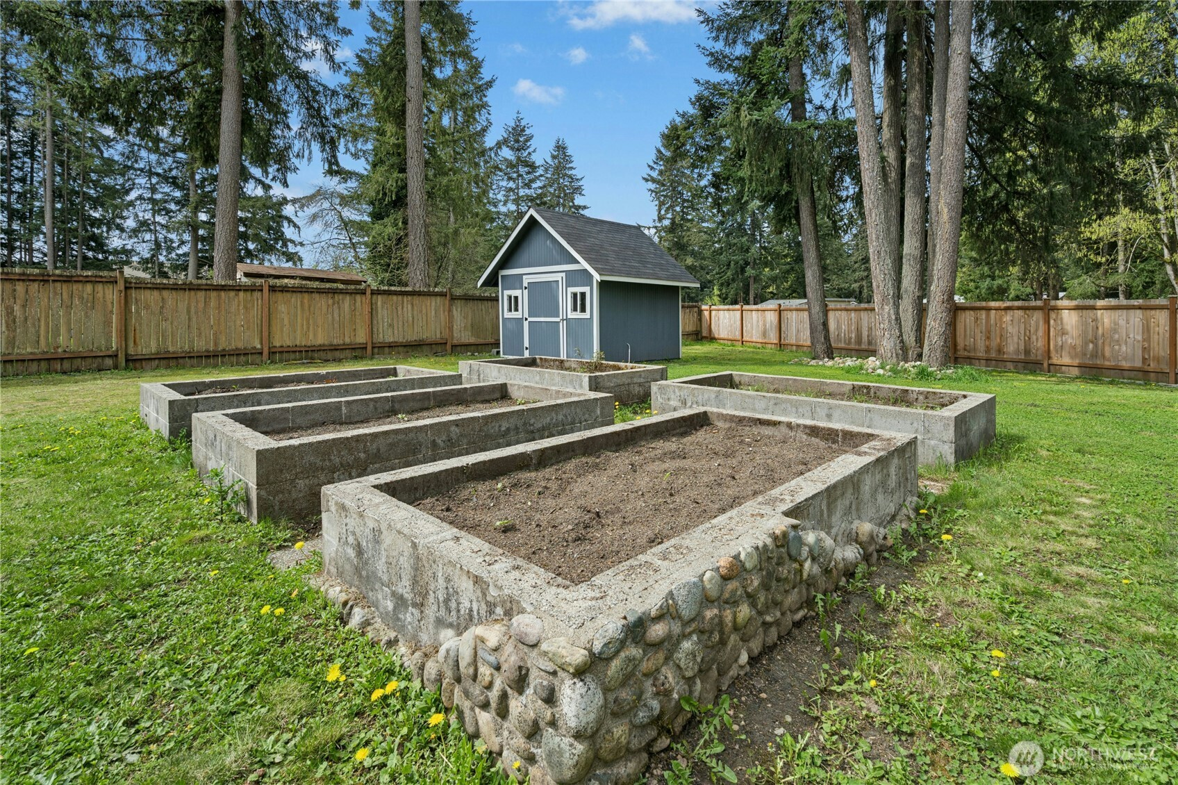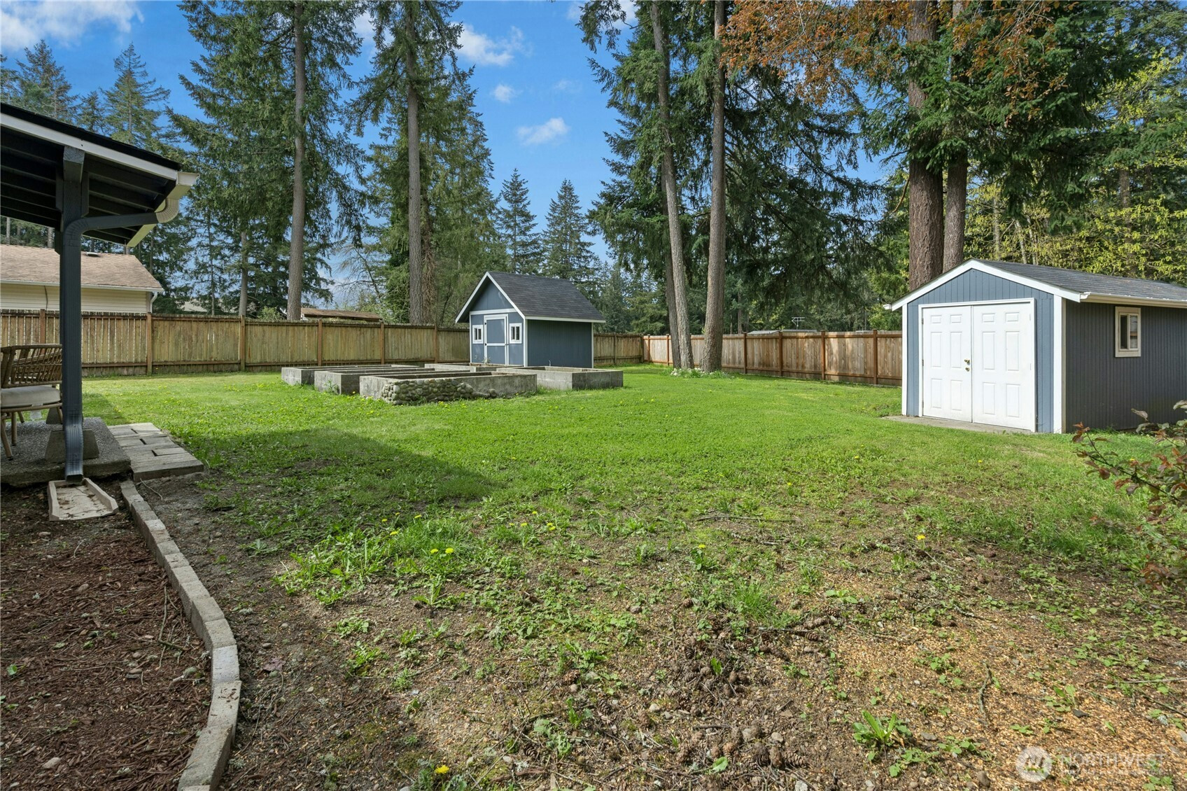 Welcome home to the Timber Hills community of Covington! Enjoy the simplicity of one level living in a home that has been completely refurbished in 2014 and recently refloored with vinyl hardwood plank flooring, fresh coats of paint, and reroofed. The spacious living room with vaulted ceilings is anchored by a slate surround fireplace insert, perfect for cozy nights in. The kitchen in the great room is the hub of the home with custom cabinetry, granite countertops, a breakfast bar island, & Frigidaire appliances. The sleeping quarters live large and are smartly laid out with the primary bedroom on a separate end from the secondary bedrooms. Both bathrooms have been meticulously updated and sparkle with sleek tile shower and bath surrounds & granite counters. The laundry and utility room are conveniently located off the two-car garage that is complete with a workbench, ample shelving, and accessible attic storage. The flat, expansive, fully fenced yard is the perfect spot for outdoor living, a gardener’s delight with raised bed containers, an 8x19’ garden shed, and a 12’x12’ separate structure that flexes as a studio, workshop, or hobby space, both with electricity and concrete flooring. There is even room for your RV. Every detail of this home has been carefully considered to provide comfort & ease for everyday living. It’s just minutes from shopping, dining, & essential amenities. This home is also within walking distance to great schools. You’ll be happy to call this home!