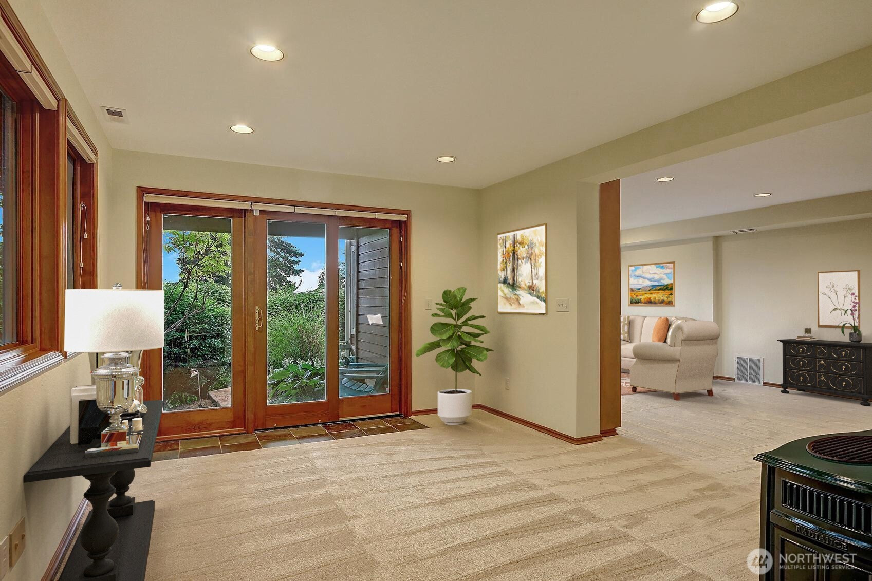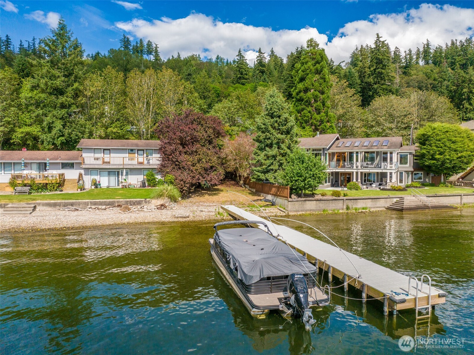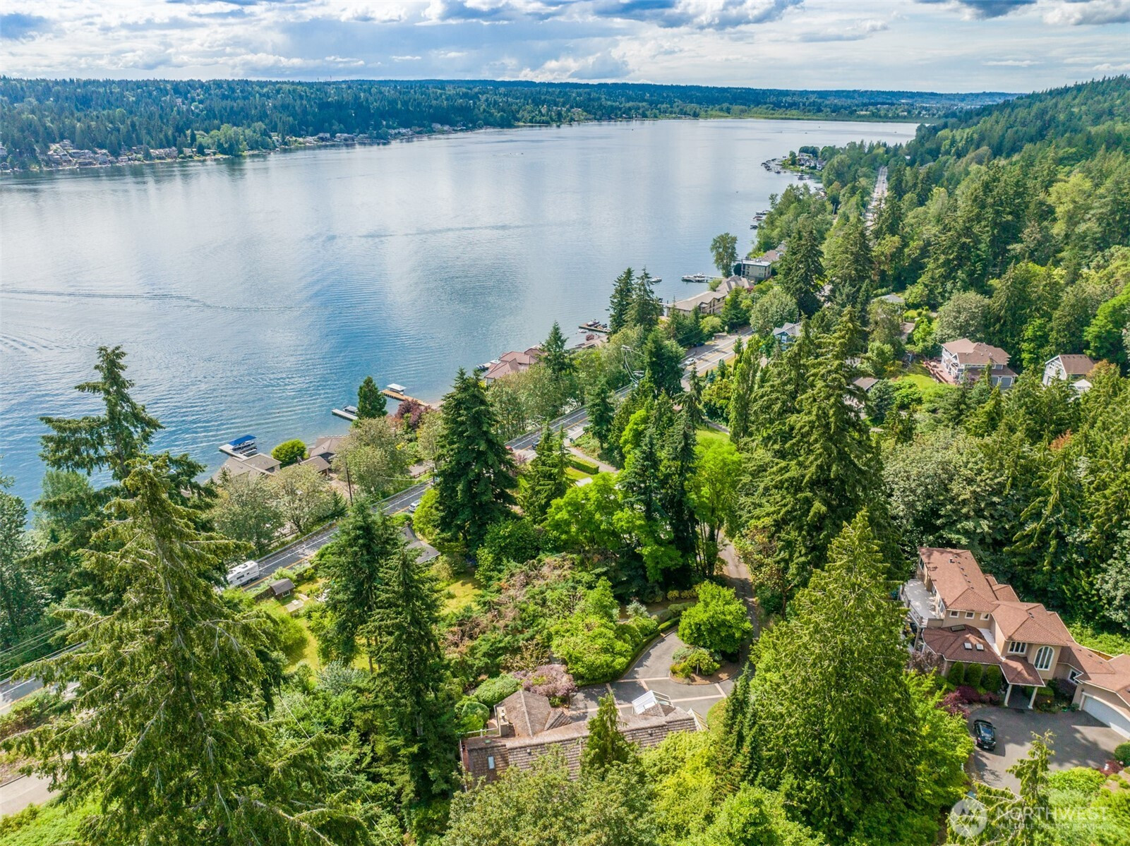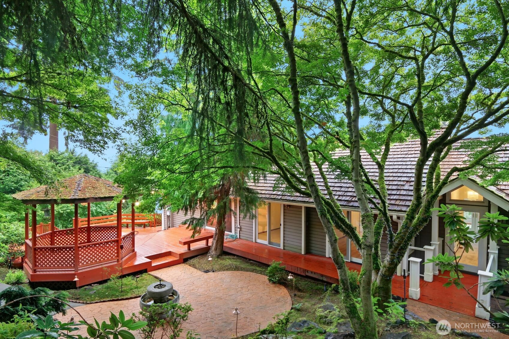 Wake up to sweeping 180-degree views of Lake Sammamish every single day. Nestled on .701 acres of enchanting gardens, winding walkways, and a running creek, this 4-bed, 2.75-bath, 3,300 sq ft home is a true urban oasis. Vaulted ceilings and floor-to-ceiling windows flood the living and dining rooms with light and lake views. A sunroom off the primary suite means you enjoy those views year-round. Large terraced decks are perfect for entertaining. The grounds are private and lush with a built-in sprinkler system — and the view trees are on your property, so you control your water exposure. Private beach access shared with just 4 other homes, plus a deluxe shared dock. Easy access to the E Lake Sammamish Trail from your neighborhood. Refinished hardwoods, new composition roof in 2022, 3-car garage with workshop space. The bones, the setting, the views — all extraordinary. Bring your creativity and make it entirely your own. Your imagination. Your lake. Your move!