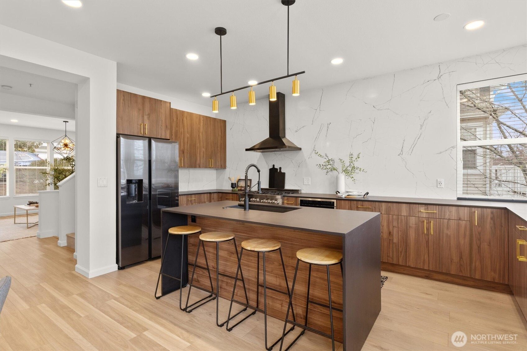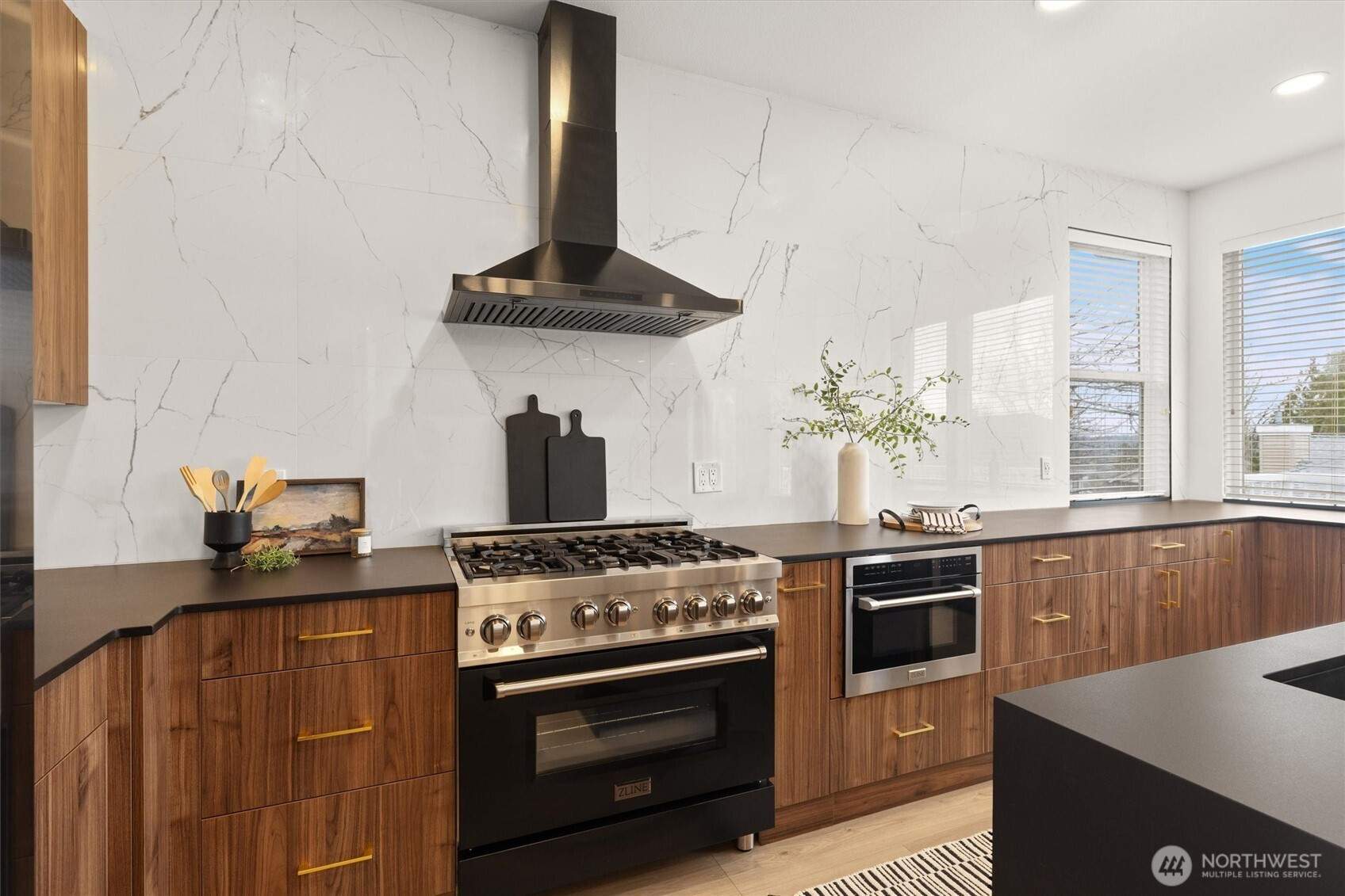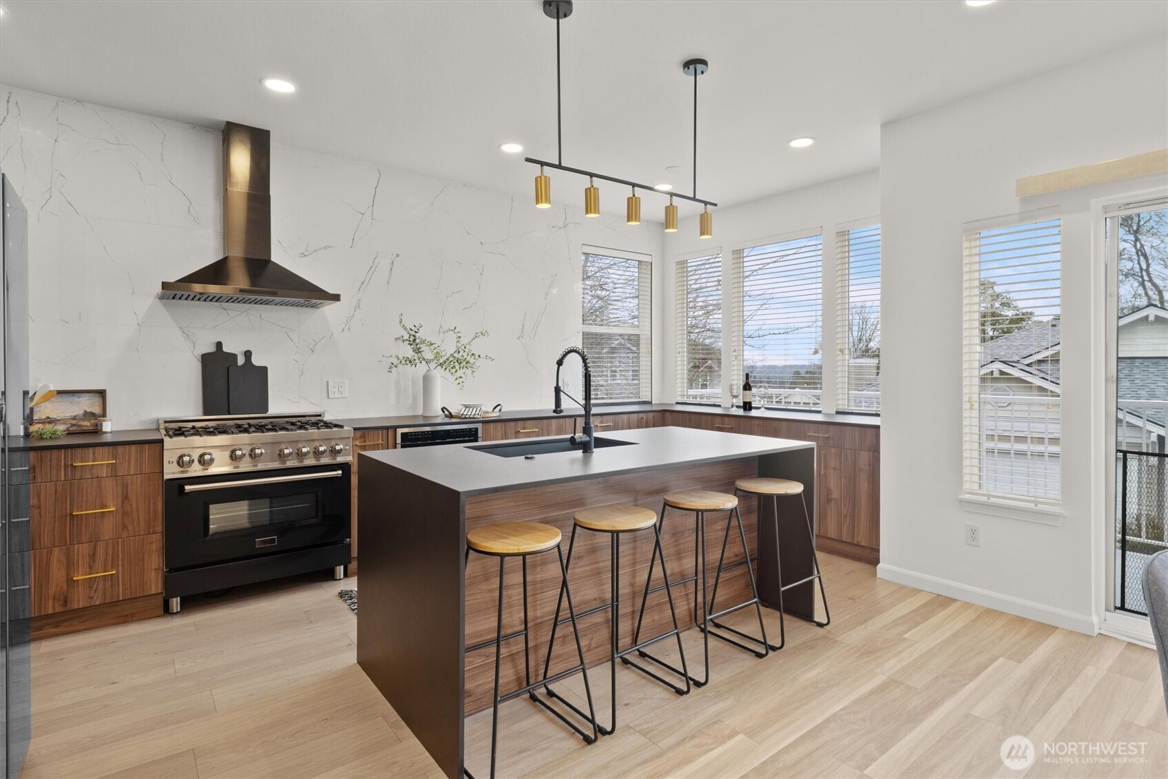Beautifully reimagined and truly move-in ready, this rare 3-bedroom home in the heart of Bellevue blends modern luxury with everyday convenience just minutes from premier shopping, dining, parks, and major tech campuses. Thoughtfully upgraded with over $130,000 in high-end, minimalist improvements, the home offers a clean, sophisticated aesthetic paired with turnkey ease. The fully remodeled chef’s kitchen serves as the centerpiece, featuring a dramatic waterfall island, luxury countertops, and a 36-inch six-burner designer range, perfect for both entertaining and daily living. Smart home lighting and central A/C provide effortless comfort and control, while fully renovated bathrooms deliver a spa-like experience with premium fixtures and sleek, wall-to-wall tile finishes. The inviting living room is anchored by a striking floor-to-ceiling fireplace feature wall, adding warmth and modern elegance. Upstairs, the primary suite captures captivating views of Downtown Bellevue, bringing the city skyline into your everyday routine. Even the garage has been elevated with a functional slat wall system, offering both style and organization. Pre-inspected for added confidence, this turnkey home allows you to move in worry-free and enjoy elevated Eastside living in an unbeatable location.
