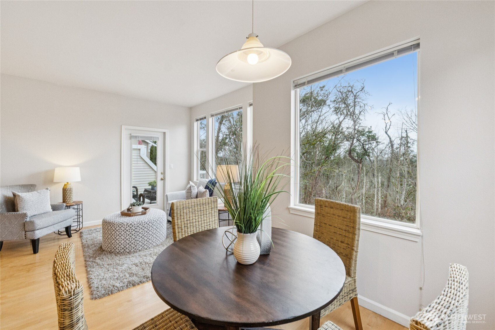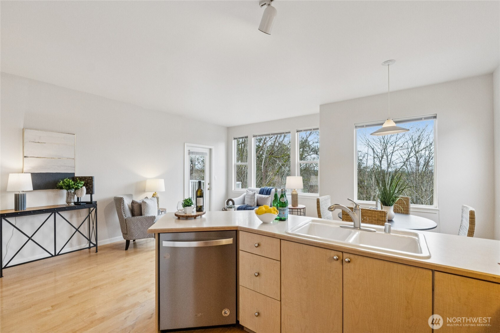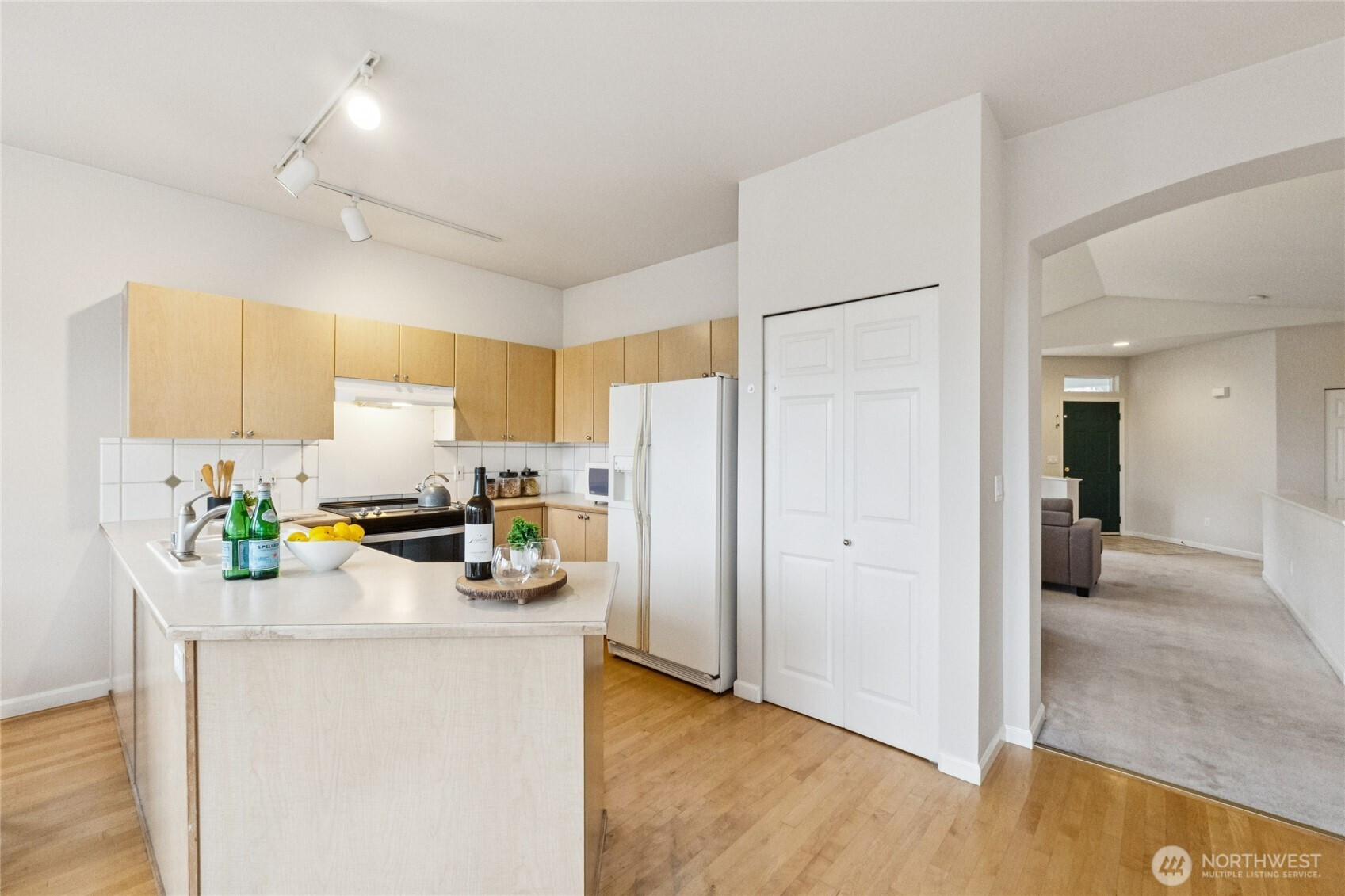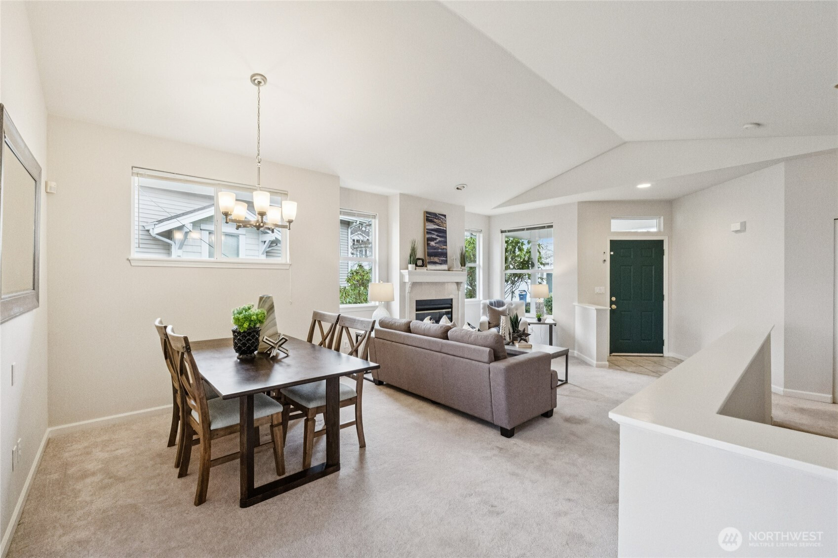 This inviting townhome feels like a place to unwind, settle in, and enjoy the simple moments of everyday living. Presented in truly move-in ready condition, it offers a welcoming blend of comfort, style, and thoughtful design. High ceilings on both levels add volume and light, while the vaulted ceiling in the formal living and dining rooms brings an elegant sense of openness. The gas fireplace, framed by a marble surround and classic mantle, provides a warm focal point for relaxing evenings or gatherings. Maplewood flooring flows through the kitchen, nook, and family room, offering both beauty and durability in everyday living spaces. The primary suite is conveniently located on the main level and features a generous walk-in closet and a five-piece bath designed for comfort and ease. The lower level offers a spacious recreation room with direct patio access, ideal for entertaining, hobbies, or quiet downtime. Two additional bedrooms, two full baths, and a large storage room provide flexibility and functionality to suit a variety of needs.