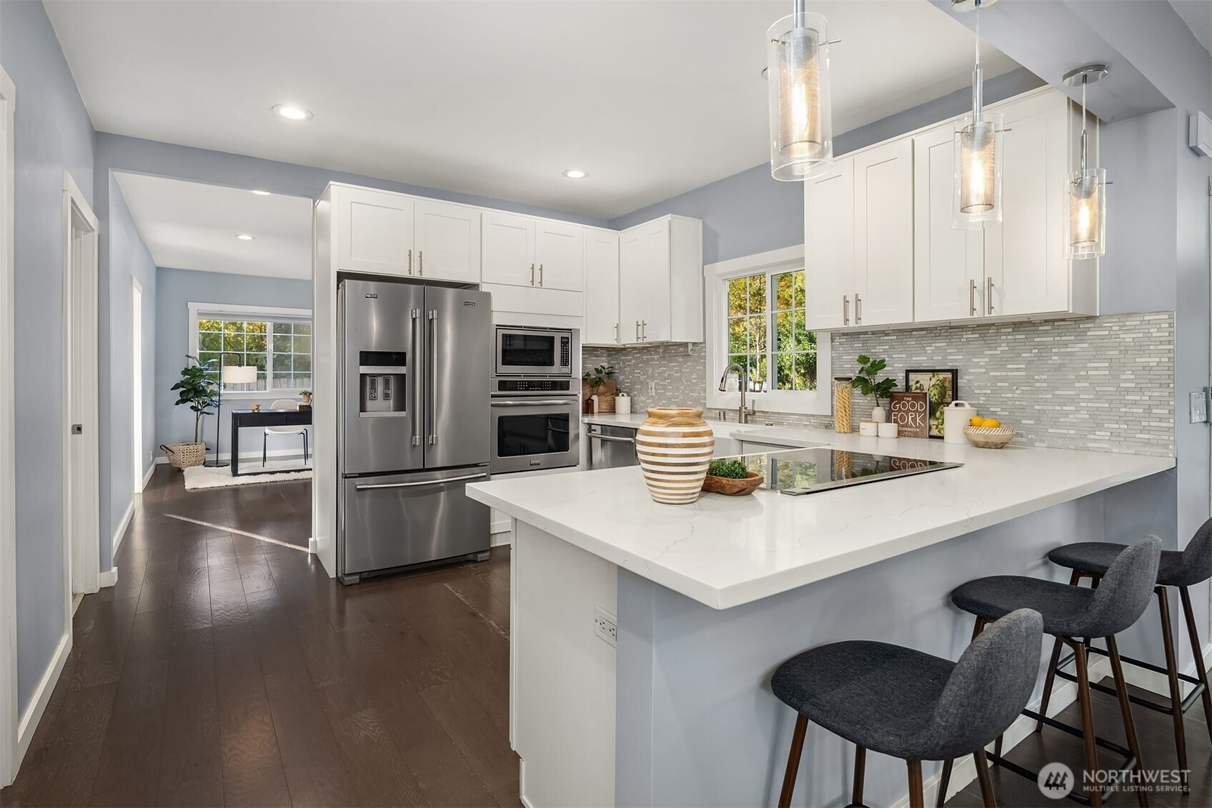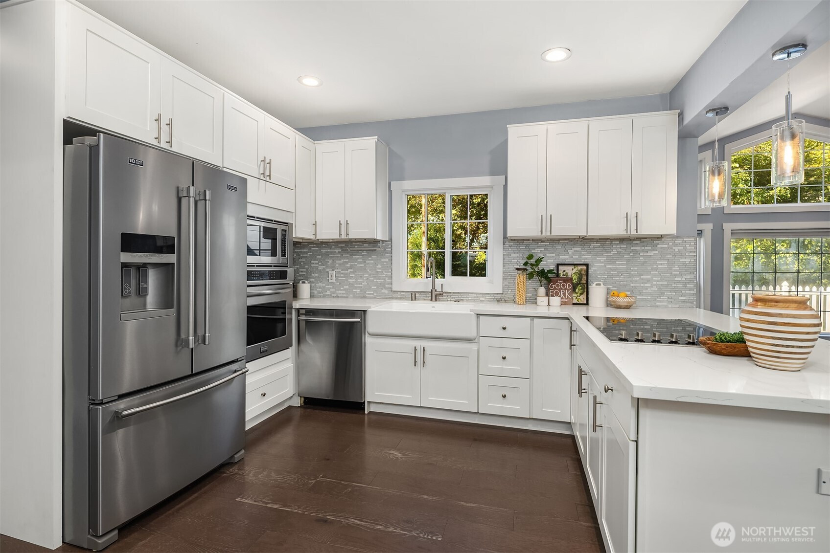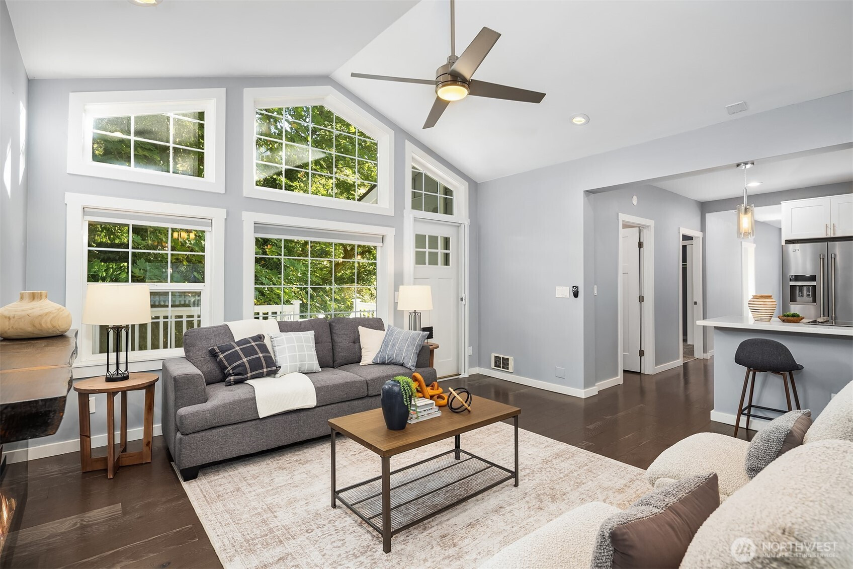 Popular rambler-style home located on small dead-end street is so charming, and the white picket fence completes the look. Open floorplan with vaulted ceilings and large windows makes this home light and bright. Large primary bedroom with walk-in closet and 2-sink ensuite bath. 2 other bedrooms share second full bath and a separate living space that could be bonus room or large den/workspace. Back yard has lawn/tool shed and new hot tub/spa on back deck. Most recently remodeled in 2016. Could also be great investment/rental property. EV charger installed. 3-car driveway parking or RV parking. Quick access to I-90. Issaquah Schools. All appliances included.
