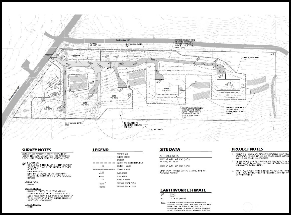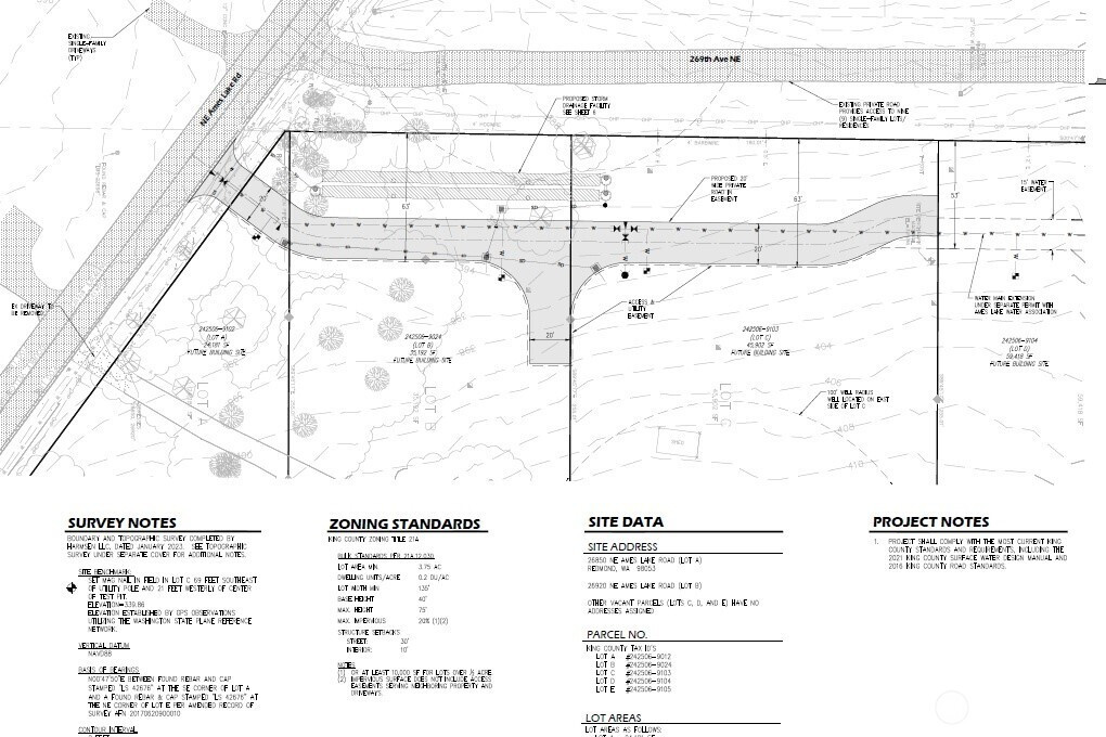 5 lots ready to submit building permits (or finalize existing grading permit, start construction then file building permits). All septic systems have been approved by King County Health. Excellent soils for drainage and storm system/roof areas designed for large homes if desired. Existing home on the property is a rental. Quick 10-15 minute commute to downtown Redmond.