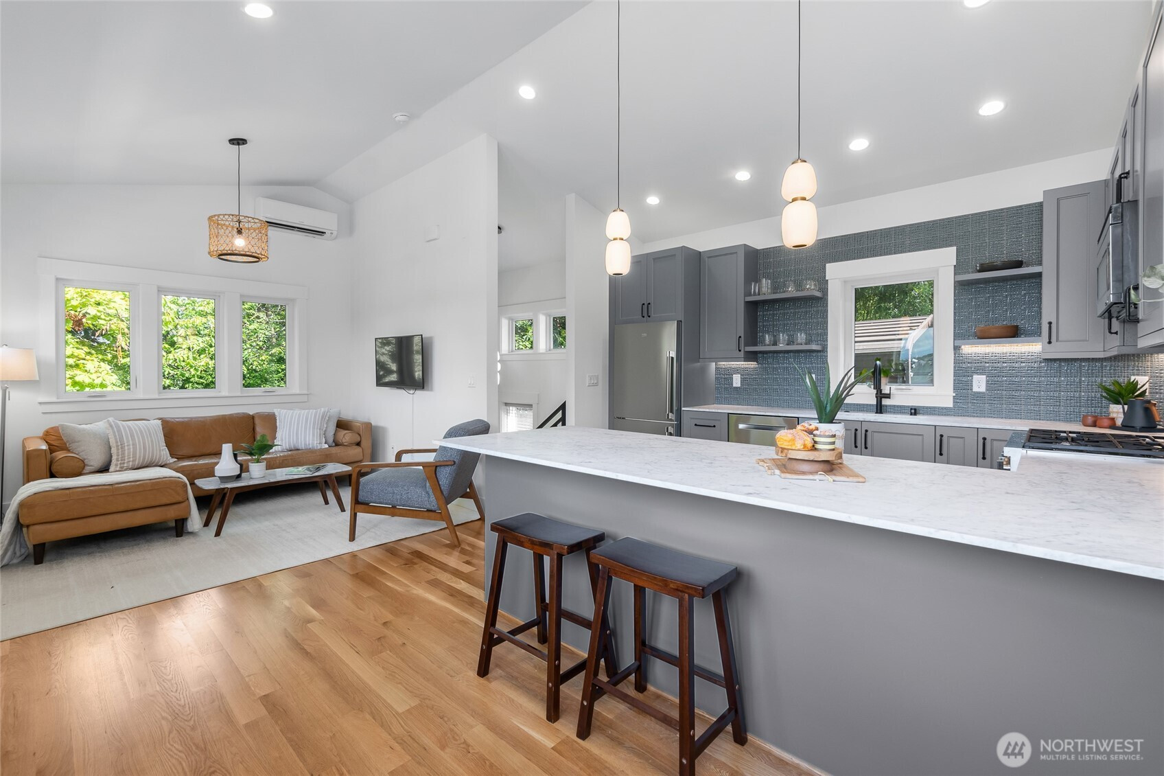 Refined modern living in the heart of Queen Anne, where Seattle’s parks, cafés, concerts, and vibrant city lifestyle are just moments away. This impeccably designed 2 bed, 2 bath residence offers elevated finishes and a seamless open layout, ideal for both sophisticated entertaining and everyday comfort. The chef’s kitchen is a true centerpiece, featuring a gas range, premium appliances, quartz countertops, full-height designer tile, and custom lighting, flowing effortlessly into the main living space. The light-filled living area is framed by expansive windows capturing stunning city and mountain views—creating a dramatic yet inviting backdrop that elevates daily living. The primary suite offers a peaceful private retreat with its own balcony, perfect for morning coffee or unwinding at the end of the day. Thoughtfully appointed with a heat pump, tankless water heater, custom window coverings, and designer lighting throughout. An attached one-car garage provides rare convenience in the city, complemented by in-home laundry and generous storage. Quiet alley and pedestrian access enhance privacy while maintaining effortless connectivity. Ideally located near South Lake Union and Fremont, with a park and tennis courts just across the street, this home offers a truly walkable and connected lifestyle. Schedule your private showing today—this is the opportunity you’ve been waiting for.