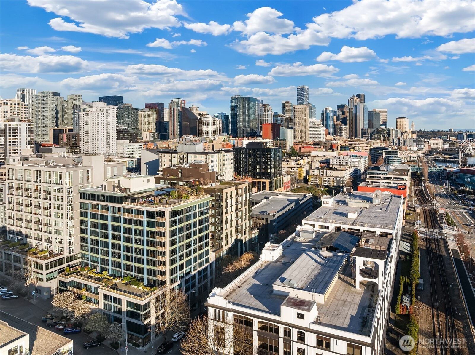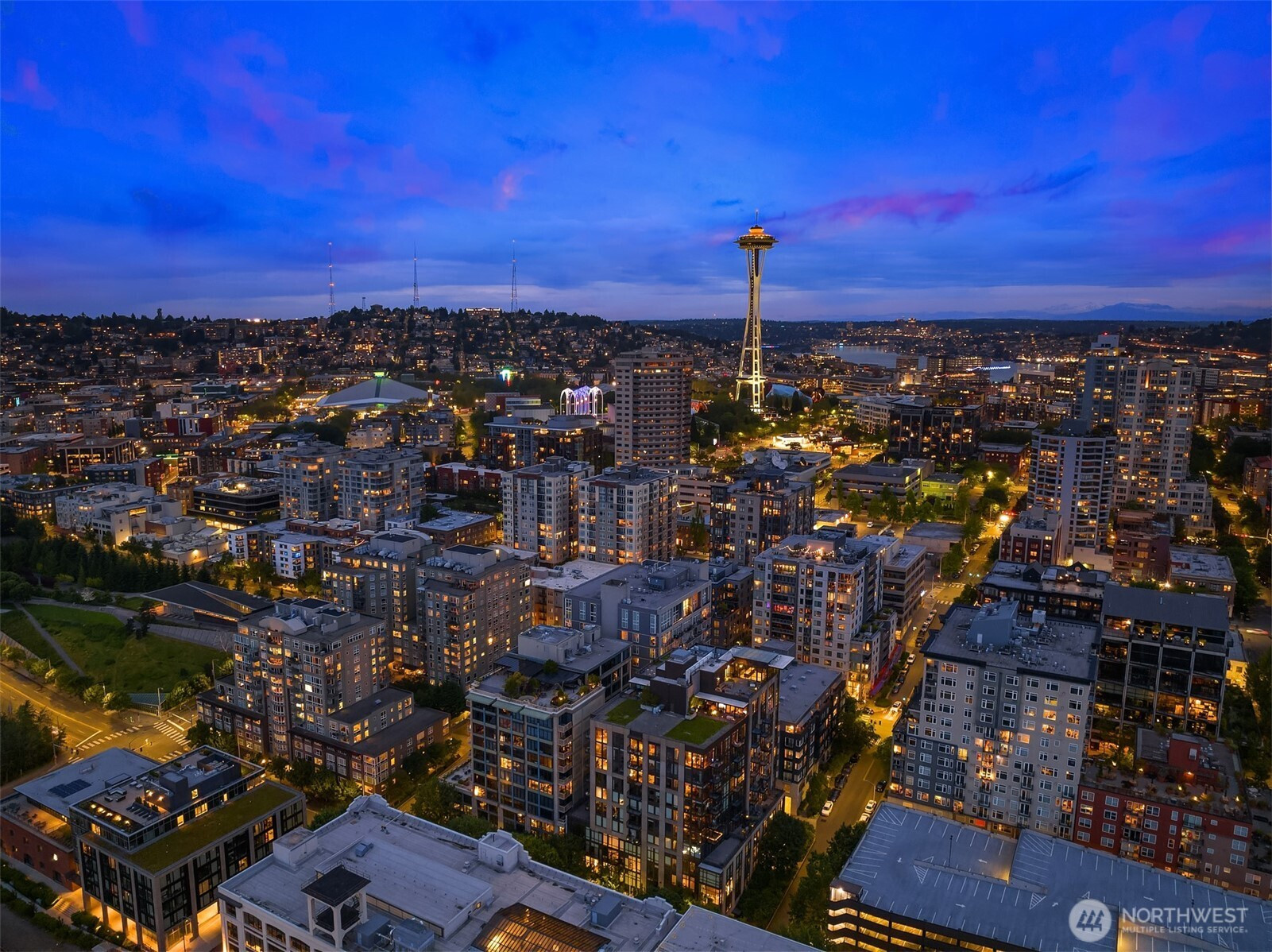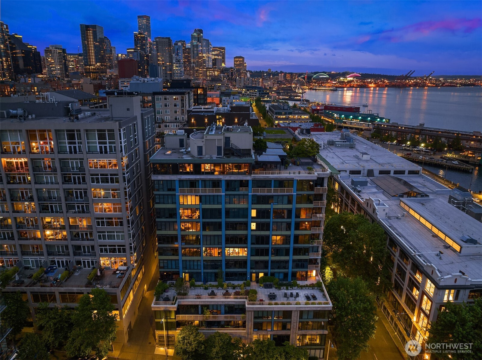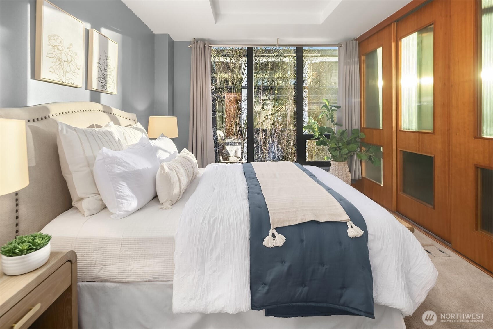 Welcome to this thoughtfully designed residence offering a refined blend of comfort, style, and functionality, all framed by birds-eye treetop views through expansive near floor-to-ceiling windows. An inviting foyer sets the tone with exceptional storage and a full guest bathroom. At the center of the home, the kitchen serves as a true gathering space, beautifully updated with all-white cabinetry, contrasted by black granite counters and sleek hardware, breakfast bar, premium LG appliances w/five-burner dual-fuel -gas stovetop & electric oven, under-cabinet lighting, a custom dry bar by California Closets w/wine storage, a built-in wine fridge, and display shelving. Just off the kitchen, a spacious den offers flexibility for a formal dining room or home office. The living area is warm and inviting, anchored by a gas fireplace with media storage, all of which overlooks the lush tree-lined street below. The primary is thoughtfully appointed to accommodate large furnishings. The en-suite bath features a double vanity, tiled shower, and large custom walk-in closet. Additional highlights include wood flooring in living areas, plush carpet in bedroom, upgraded w/d, A/C, and designer lighting throughout. Bellora is a boutique condominium situated in the heart of Belltown, steps from the waterfront, Pike Place Market, and the Sculpture Park. Residents enjoy concierge services, a fully-equipped fitness center, and community terrace. 1 parking space + 1 storage unit incl