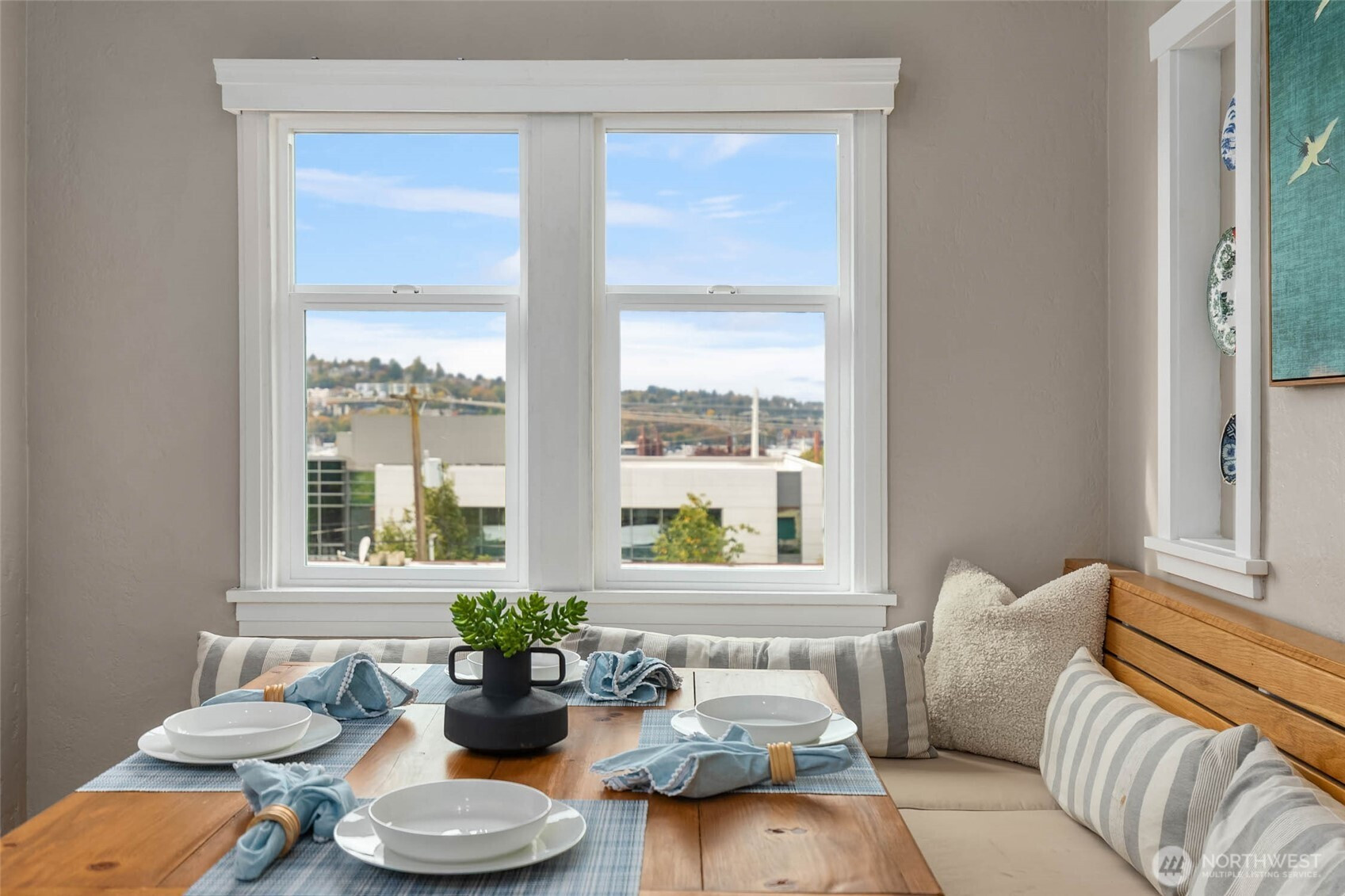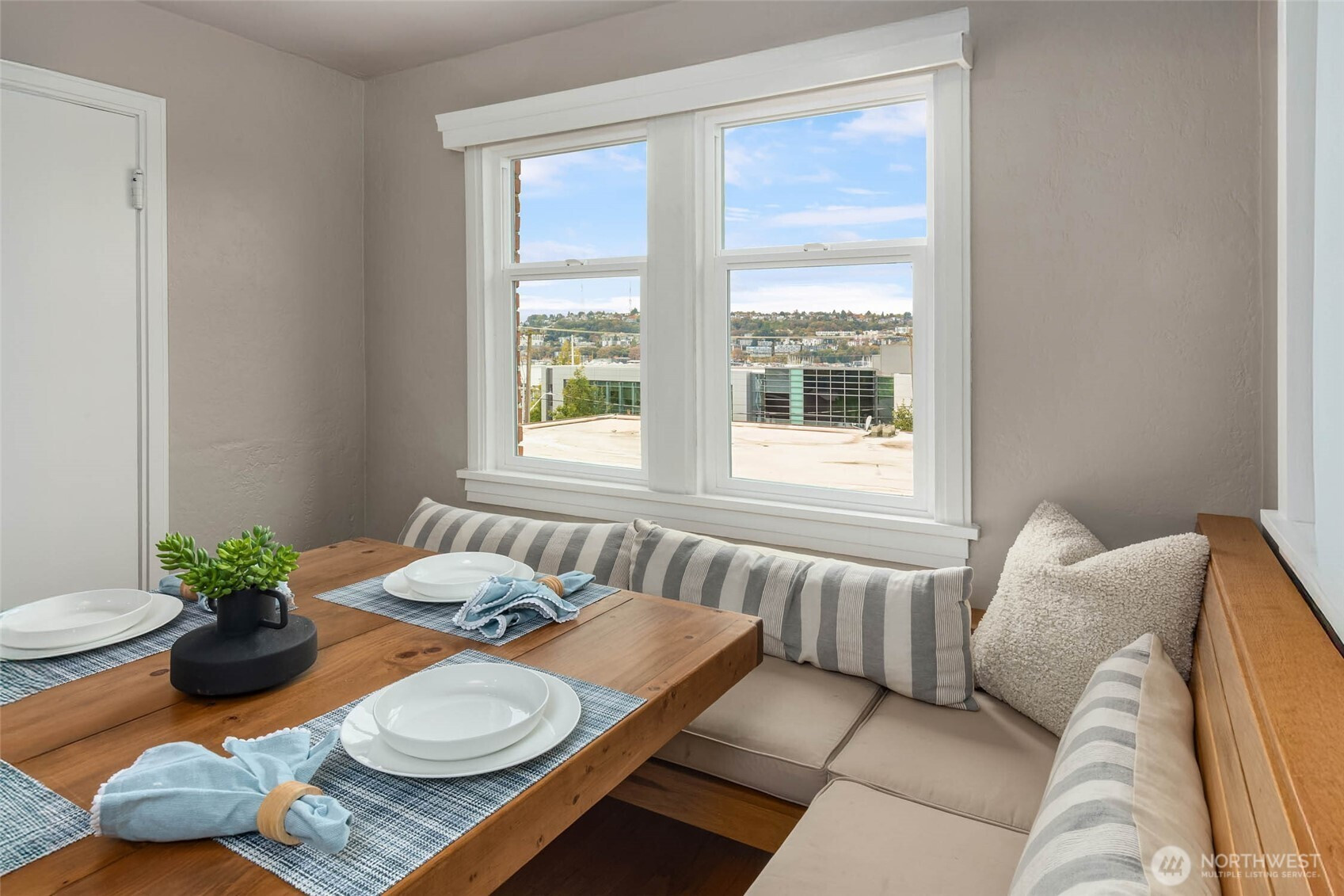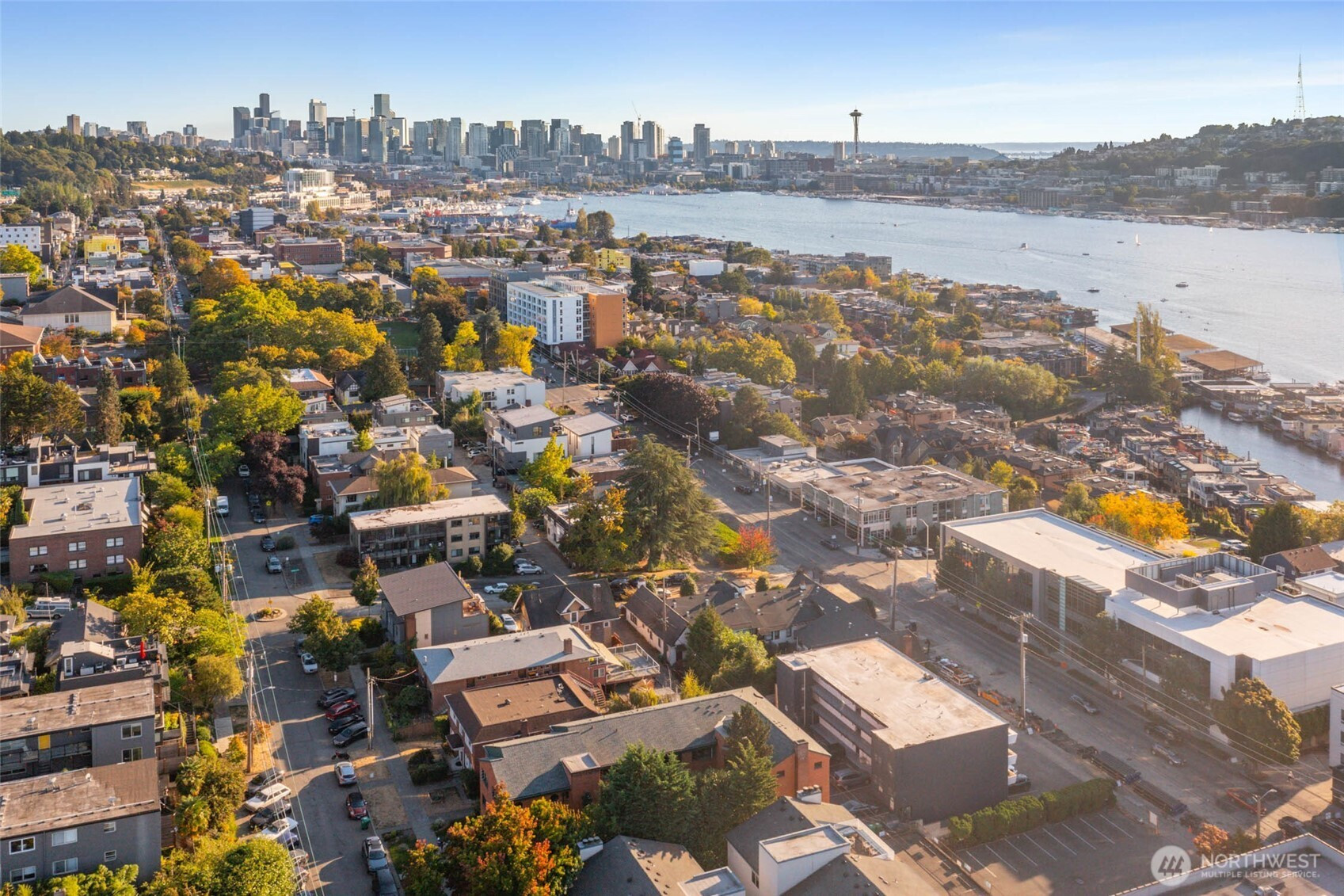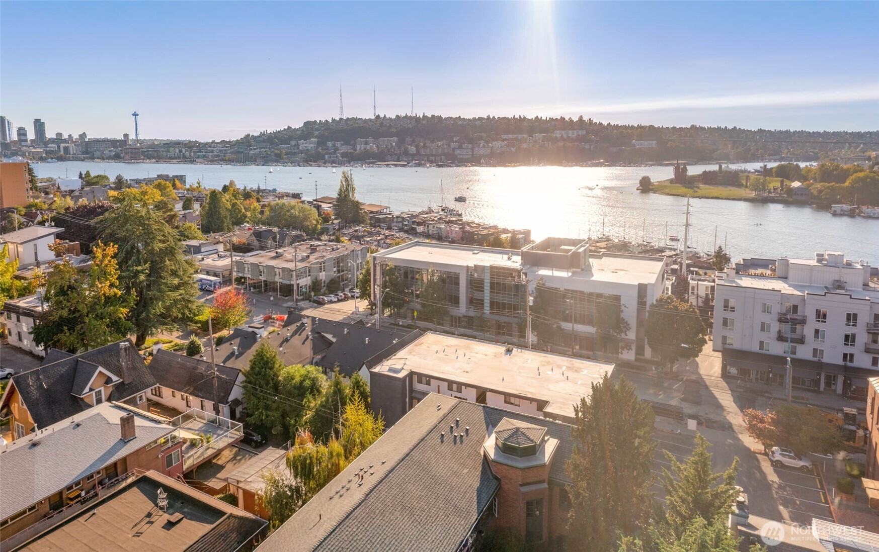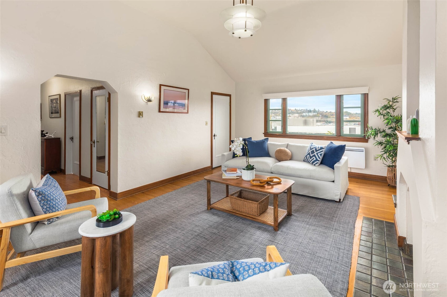 Comfort. Character. Class. Soul. You’ll find it all here in this light-filled one-bedroom penthouse at Eastlake’s stately Castlewood, envisioned by renowned architect Paul Thiry. Vaulted ceilings and three sides of exposure—west, east, and north—flood the home with warmth and timeless charm. Enjoy sweeping lake, city, and Olympic Mountain views, oak floors, a newly remodeled bathroom, vintage lighting, in-unit washer/dryer, private garage, and a massive 15x8' storage room. Impeccably maintained residence in a classic building with a well-run HOA. Enjoy sunsets and fireworks shows from your living room!
