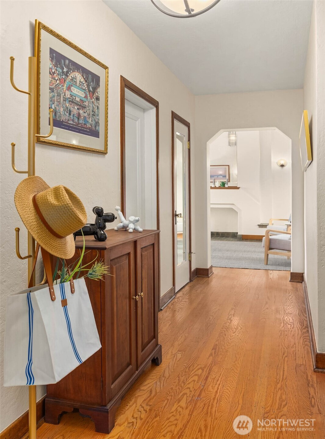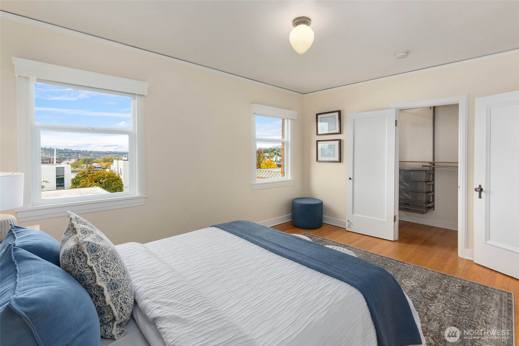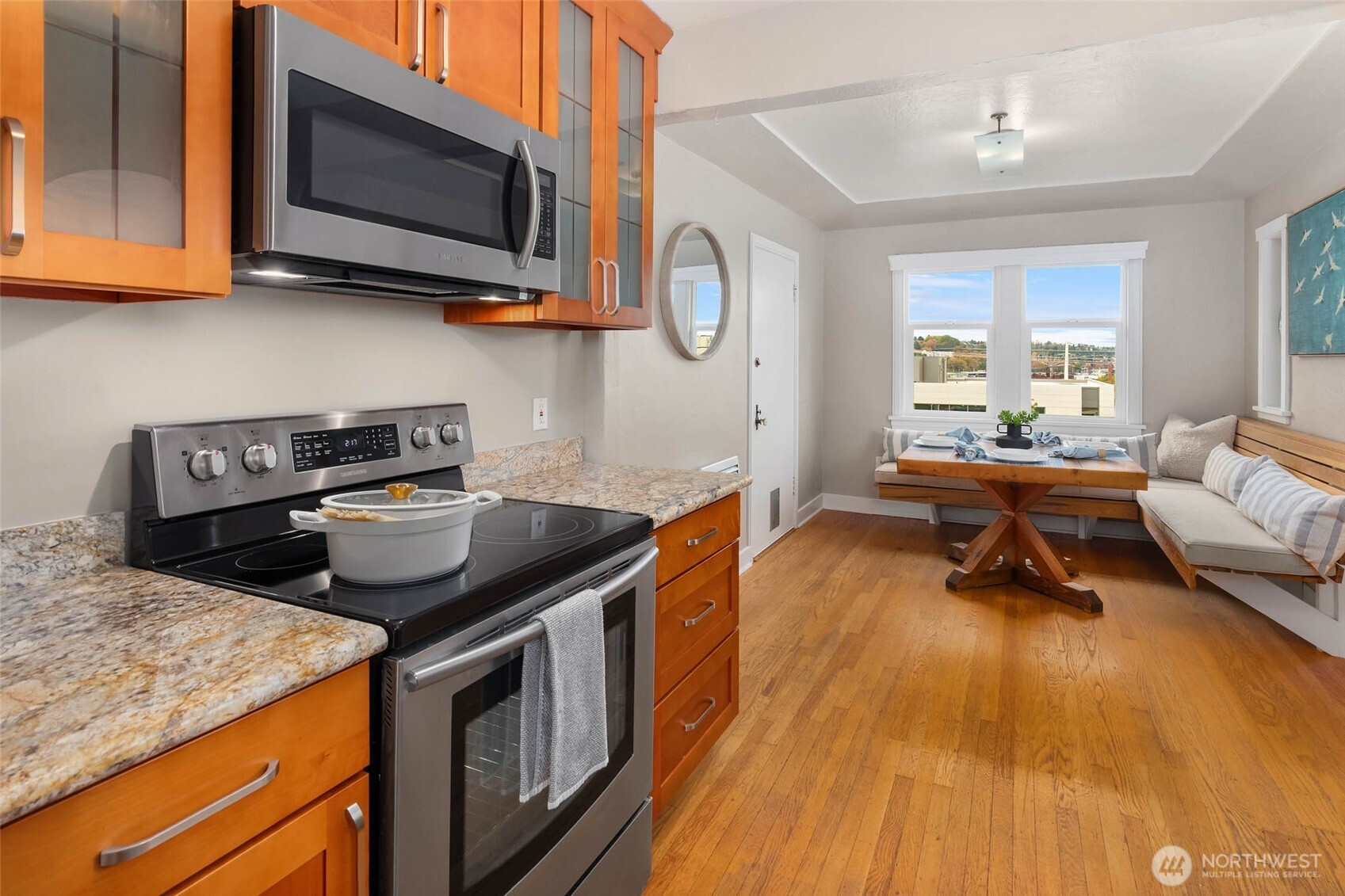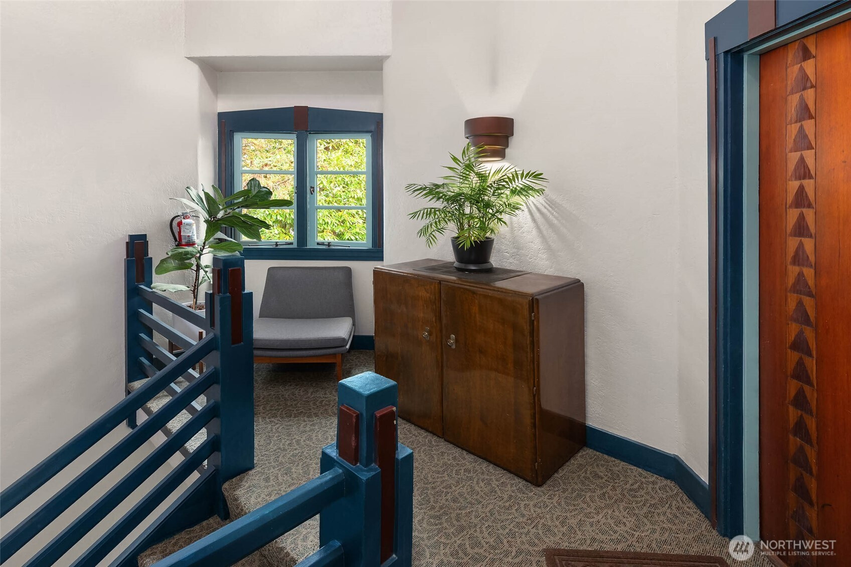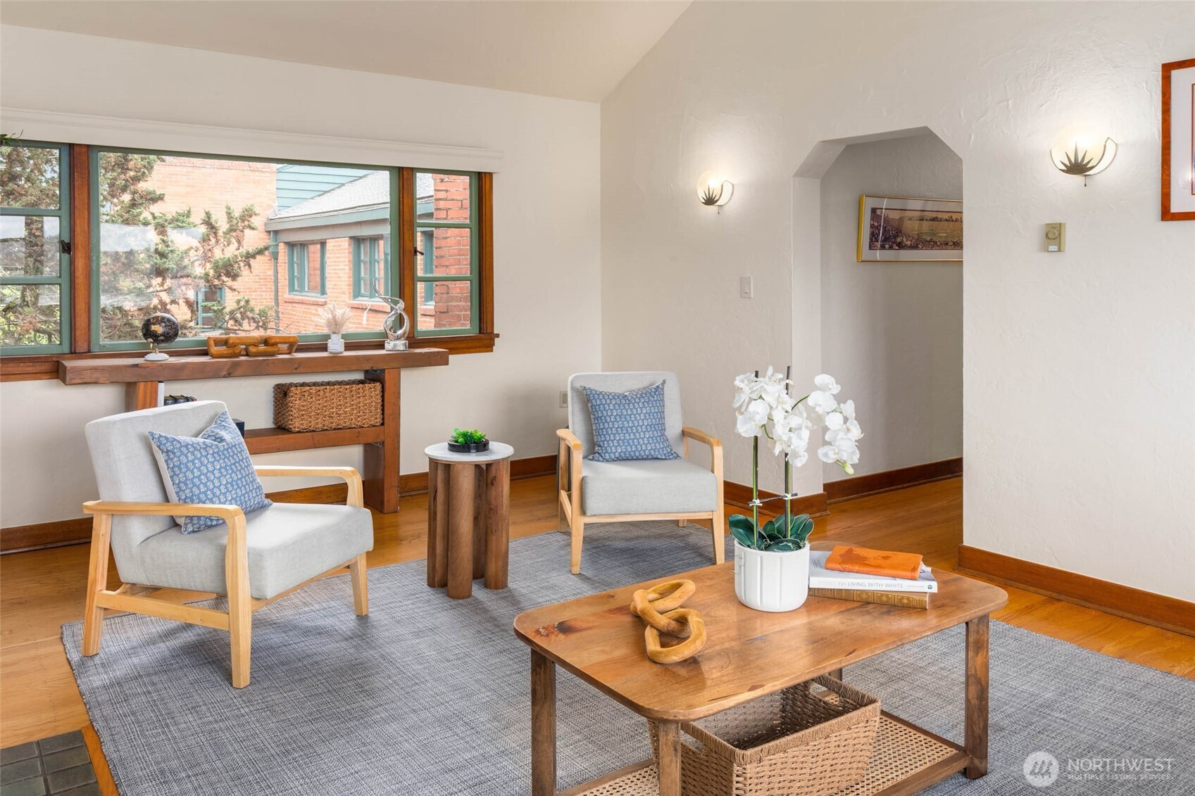 Comfort. Character. Class. Soul. You’ll find it all here in this light-filled one-bedroom penthouse at Eastlake’s stately Castlewood, envisioned by renowned architect Paul Thiry. Vaulted ceilings and three sides of exposure—west, east, and north—flood the home with warmth and timeless charm. Enjoy sweeping lake, city, and Olympic Mountain views, oak floors, a newly remodeled bathroom, vintage lighting, in-unit washer/dryer, private garage, and a massive 15x8' storage room. Impeccably maintained residence in a classic building with a well-run HOA. Enjoy sunsets and fireworks shows from your living room!