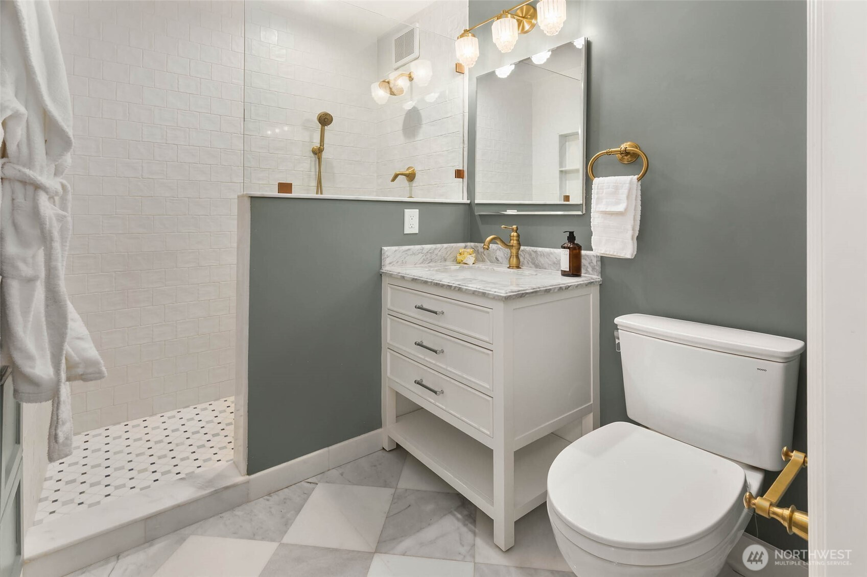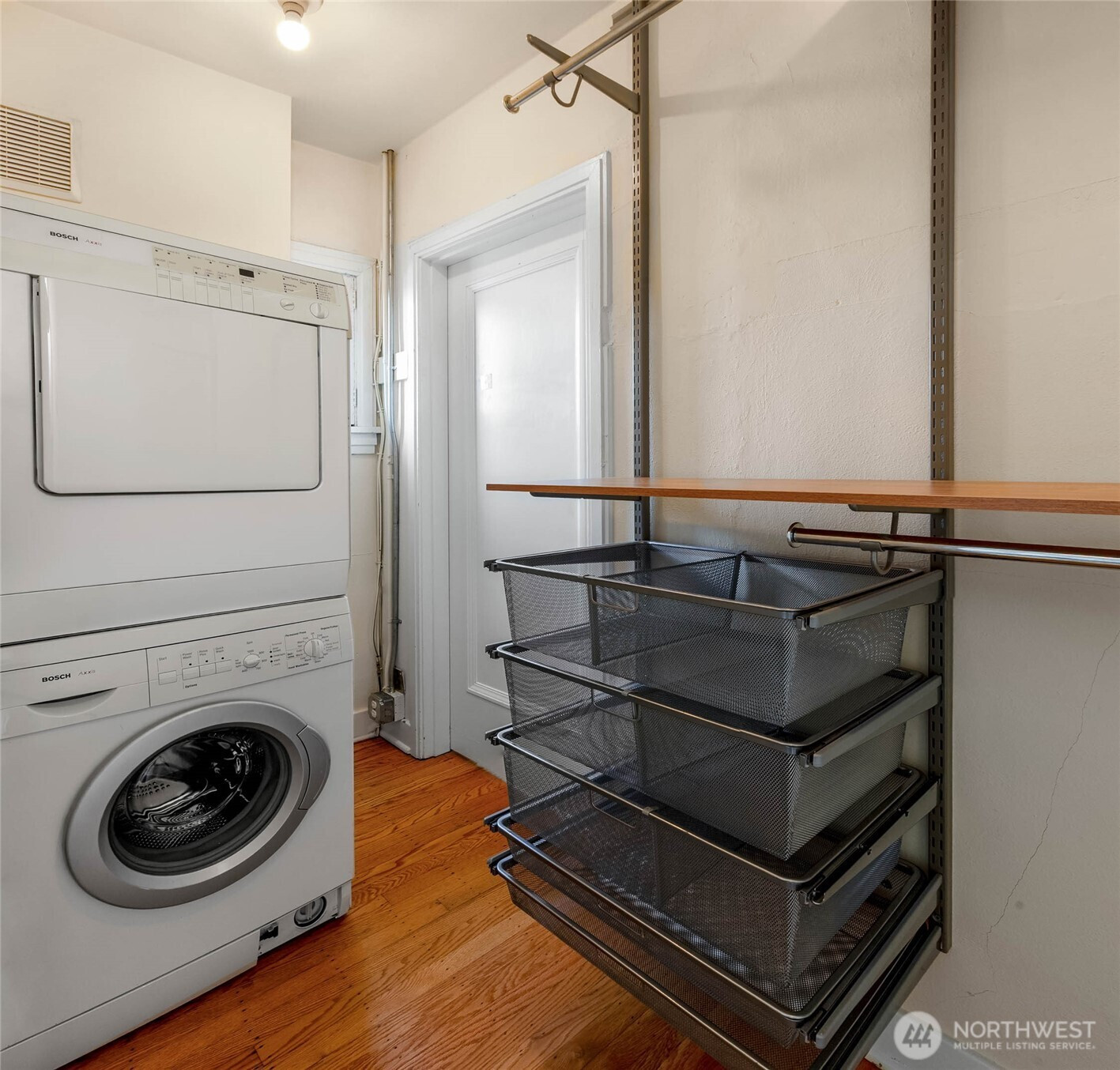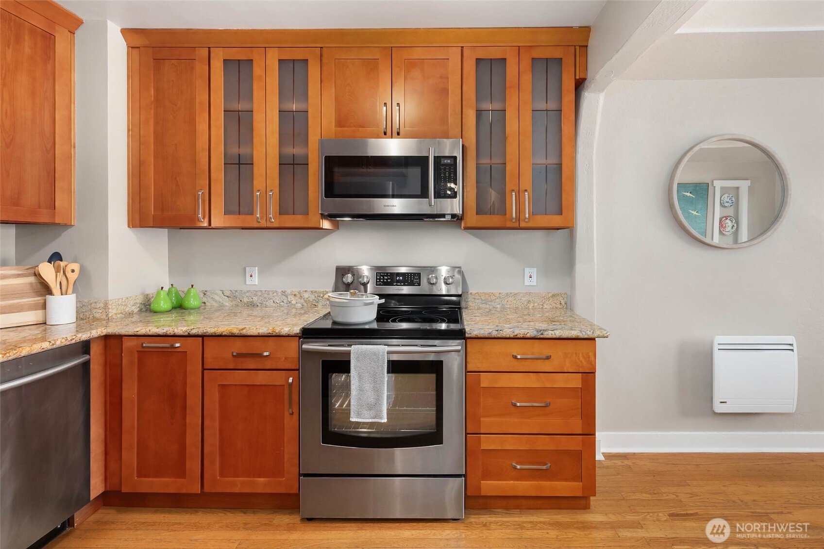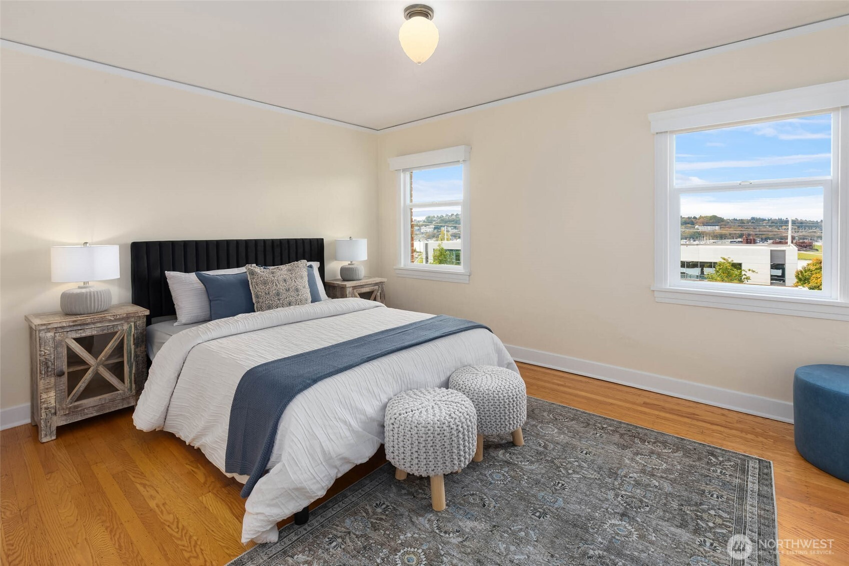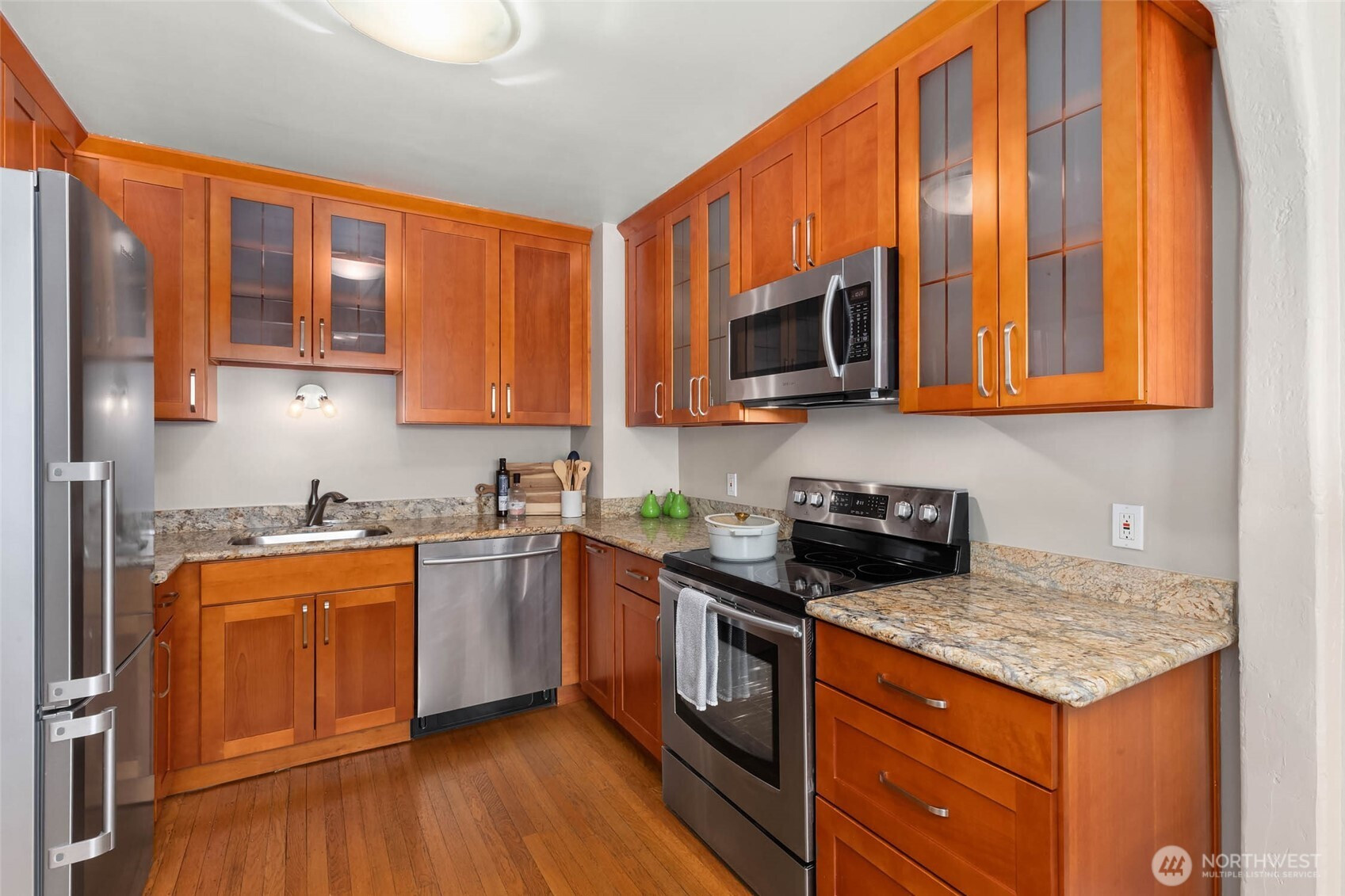 Comfort. Character. Class. Soul. You’ll find it all here in this light-filled one-bedroom penthouse at Eastlake’s stately Castlewood, envisioned by renowned architect Paul Thiry. Vaulted ceilings and three sides of exposure—west, east, and north—flood the home with warmth and timeless charm. Enjoy sweeping lake, city, and Olympic Mountain views, oak floors, a newly remodeled bathroom, vintage lighting, in-unit washer/dryer, private garage, and a massive 15x8' storage room. Impeccably maintained residence in a classic building with a well-run HOA. Enjoy sunsets and fireworks shows from your living room!