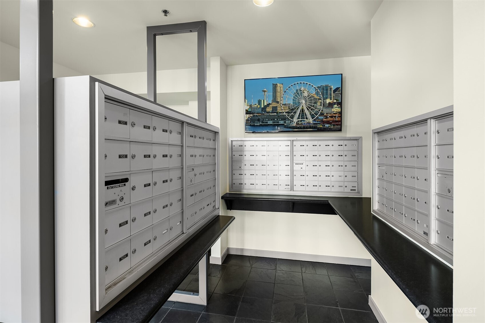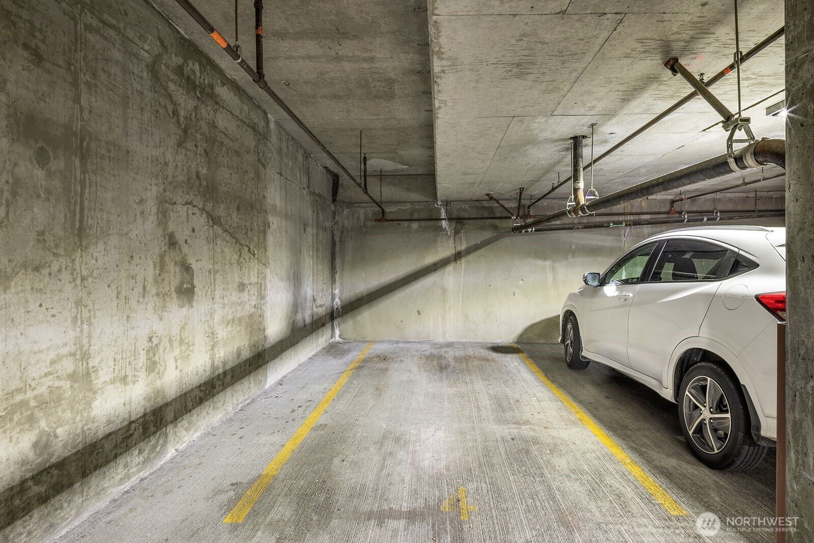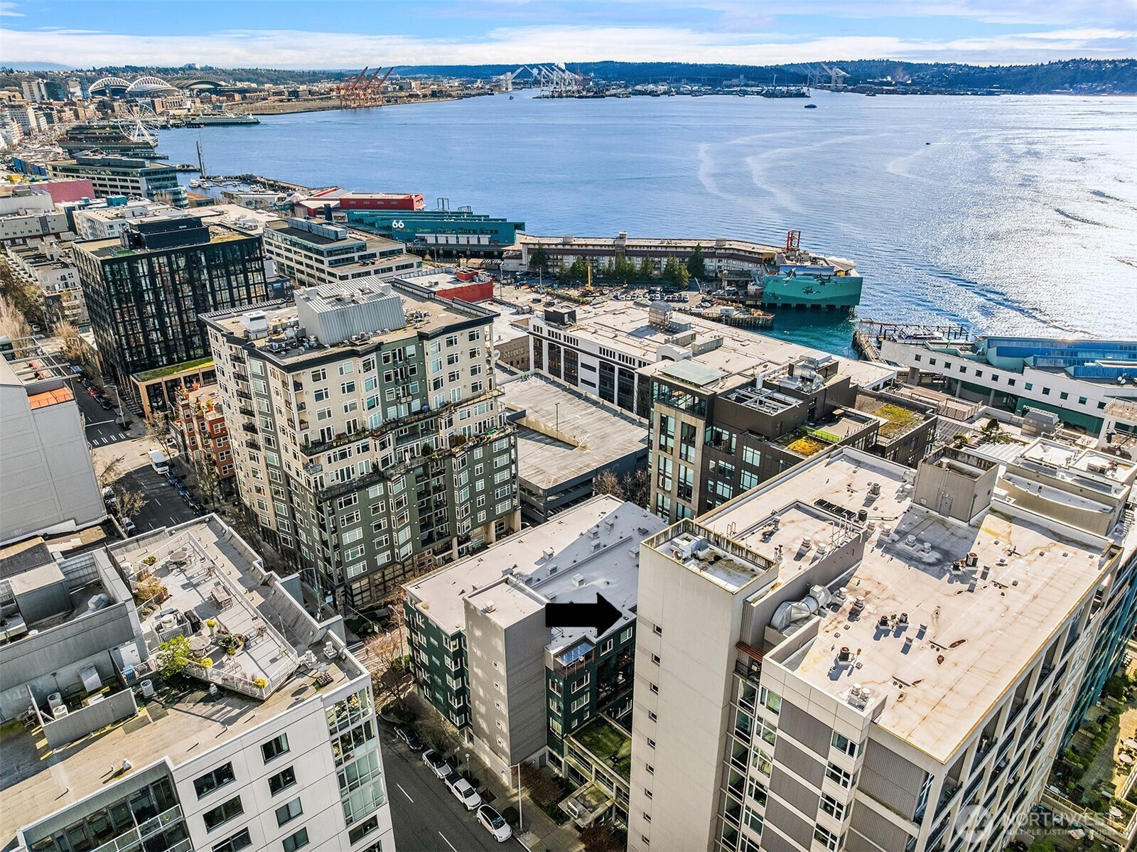 Penthouse loft with soaring 20-ft ceilings and panoramic city, Elliott Bay, and Olympic Mountain views. A rare two-story end unit on the top floor of The Klee in Belltown, Seattle. This 2-bedroom, 2-bathroom penthouse spans 1,068 sq ft across two levels. A dramatic full wall of south-facing windows floods both levels with natural light and frames the Seattle skyline from morning to city-lights-at-night. The open main level centers on a show-stopping 12-ft waterfall quartz island with bar seating, ideal for cooking and entertaining with the city as your backdrop. Hardwood floors on the main level, spa-inspired primary bath, and a generous walk-in closet with custom built-ins. The flexible second bedroom functions beautifully as a home office, studio, or guest suite, complete with its own adjacent full bathroom. Perfect for remote work or hosting visitors without sacrificing privacy. The Klee offers 24-hour concierge, fitness center, business center, guest suite, garden terrace with gas grills, EV charging, and secure garage parking with bike storage. Pet-friendly with no rental cap. No special assessments. Concrete and steel construction. Walk Score 95. Just 2 blocks to Olympic Sculpture Park, a 10-minute walk to Pike Place Market, and steps from Amazon HQ, Google, cafes, and the revitalized Seattle Waterfront.