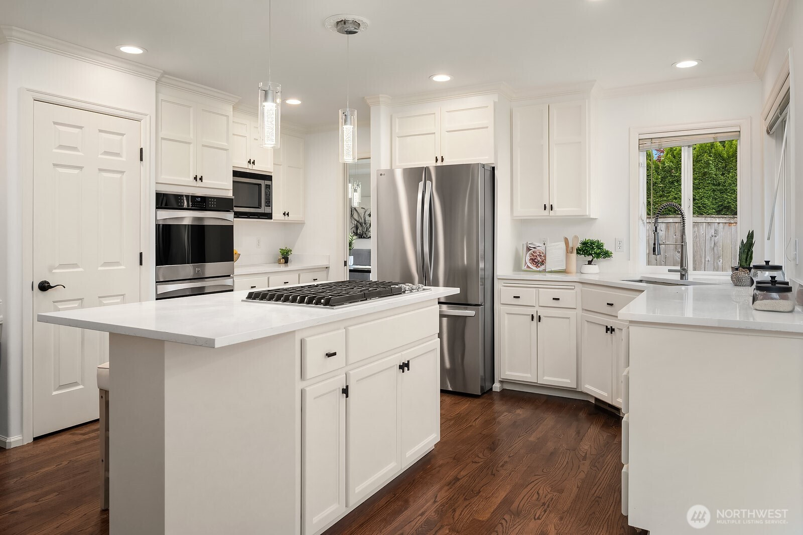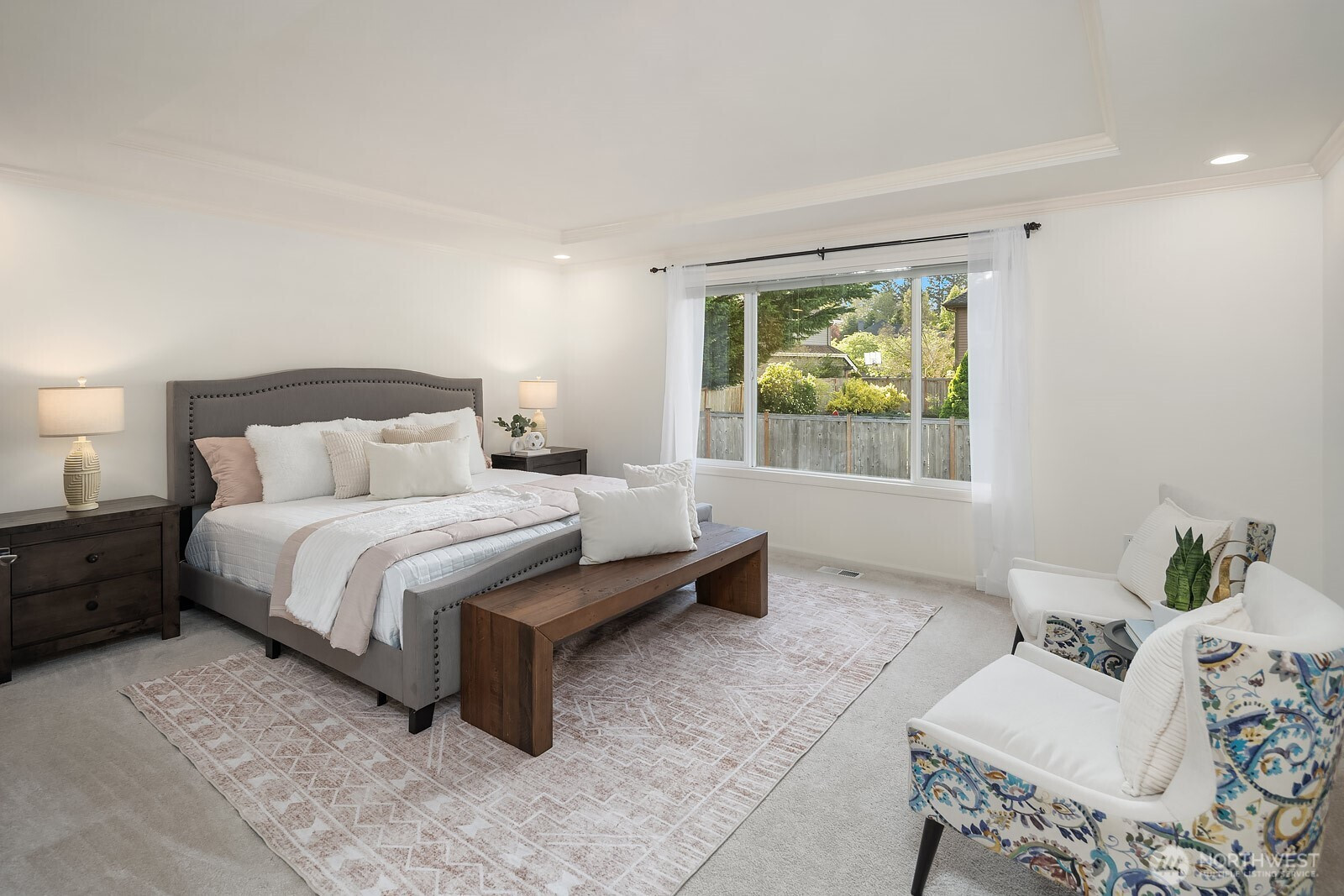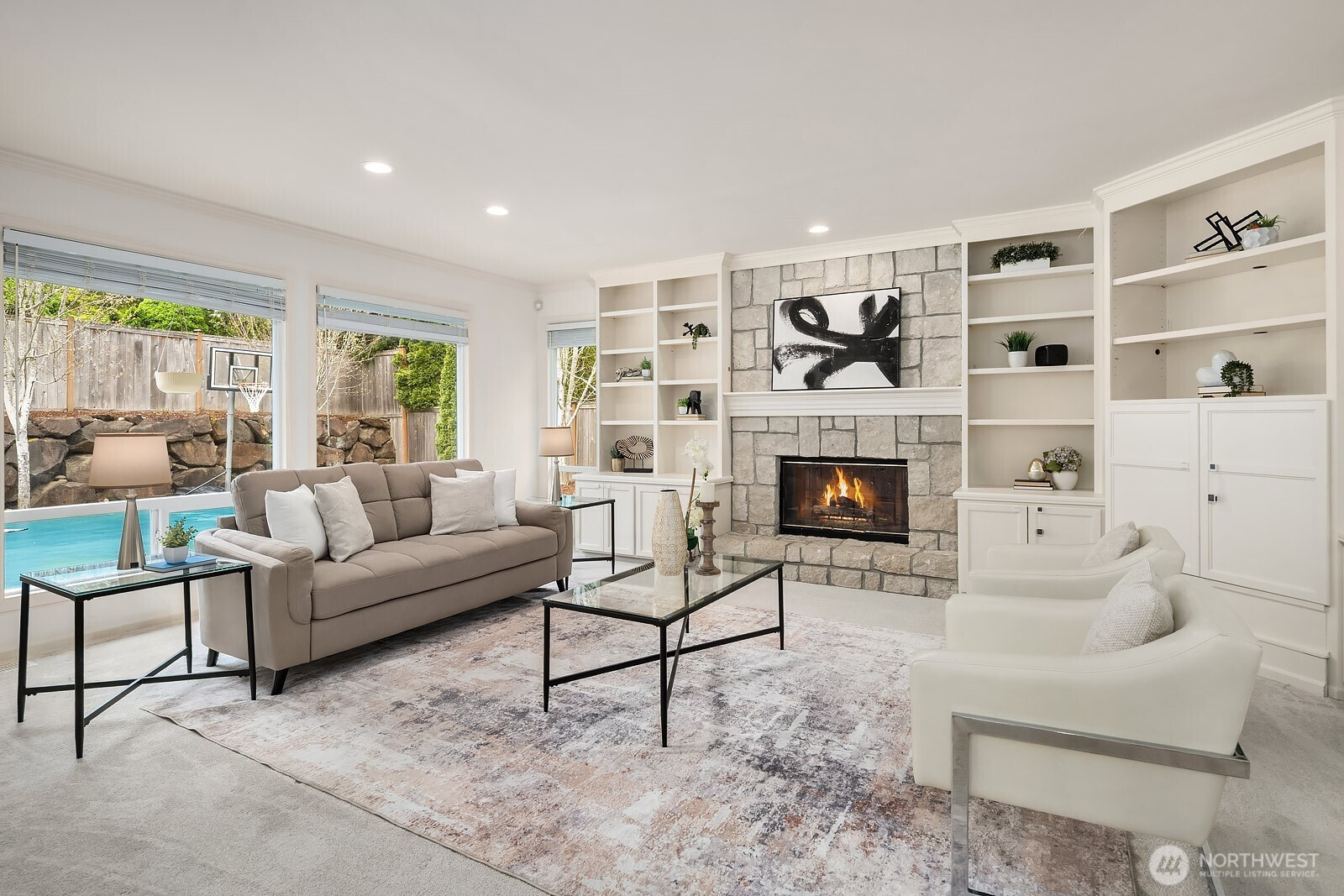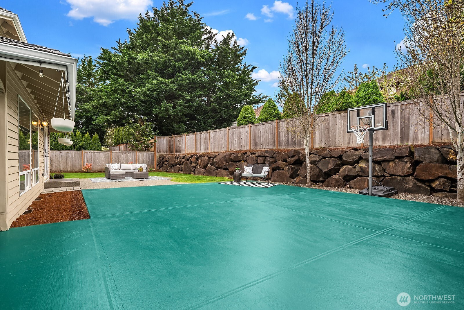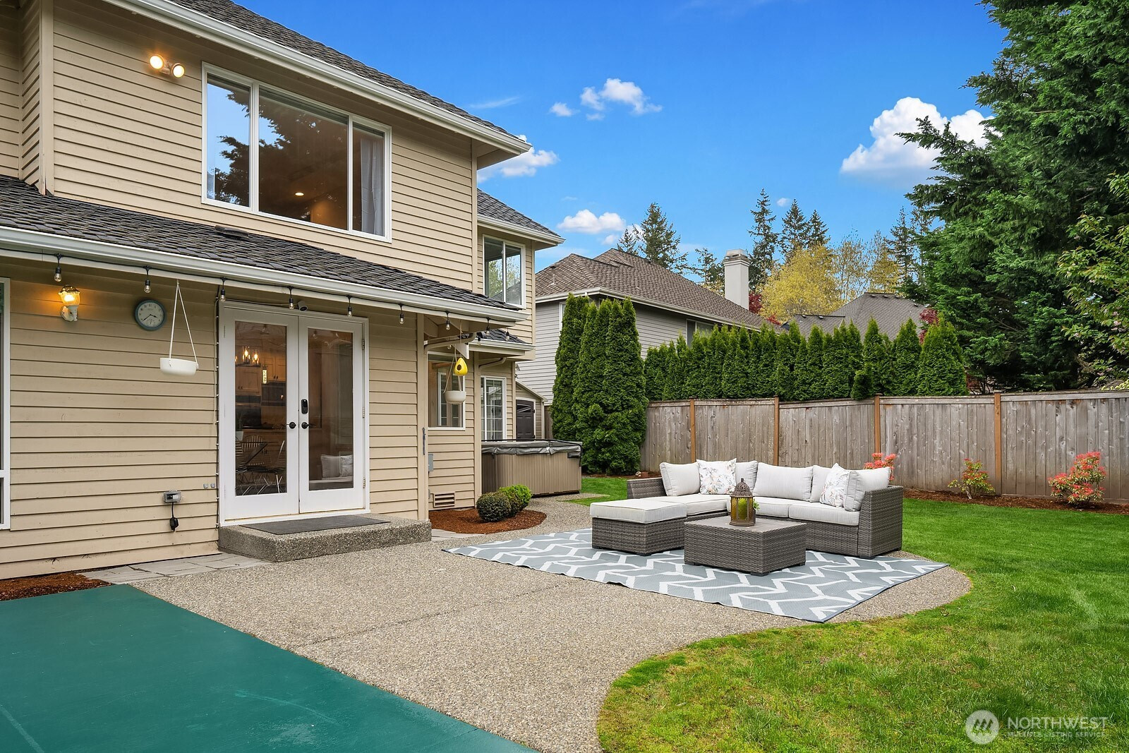 Sought after Buchan resale nestled in the Trossachs community, offering a rare combination of refined finishes and true move-in condition. This east facing 4 bedroom, 2.5 bath home spans 3,110 square feet of well-appointed living space. Step inside to soaring ceilings and a light-filled formal living room framed by a custom front door. The main level gathering room is anchored by expansive picture windows with serene views of the private backyard, perfect for relaxing or hosting guests. The kitchen impresses with upgraded quartz countertops, stainless steel appliances, a large center island, and ample cabinetry, designed equally well for everyday use and entertaining. A dedicated main level office, easily converted to a fifth bedroom, adds valuable flexibility for working from home. The upper level is anchored by a fully remodeled primary suite with a spa-inspired bath featuring premium finishes and a custom built-in walk-in closet offering exceptional organization. Three additional bedrooms and a full bath complete the upper level. Outside, enjoy a shy quarter acre lot with mature landscaping, a sports court, and a three car garage equipped with an EV charger. Central air conditioning ensures year-round comfort in every season. Major updates include a new roof, new furnace, and refinished hardwood floors throughout, making this a truly turnkey opportunity in one of the area's most desirable neighborhoods. Located within the highly regarded Issaquah School District.