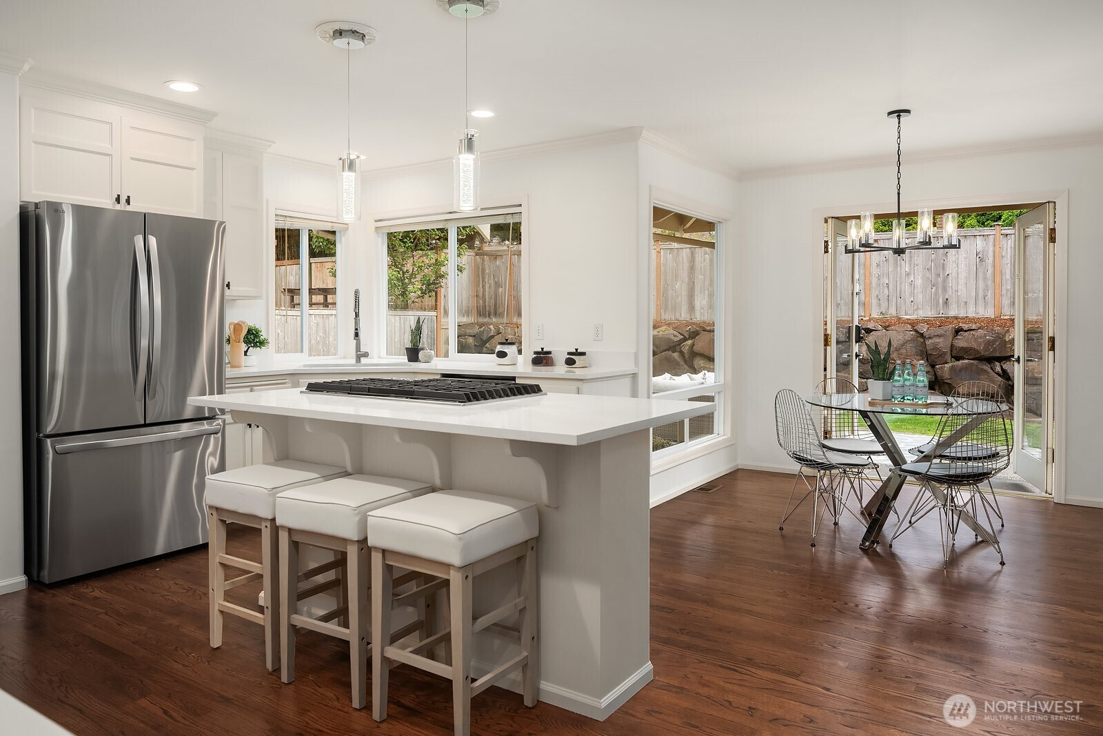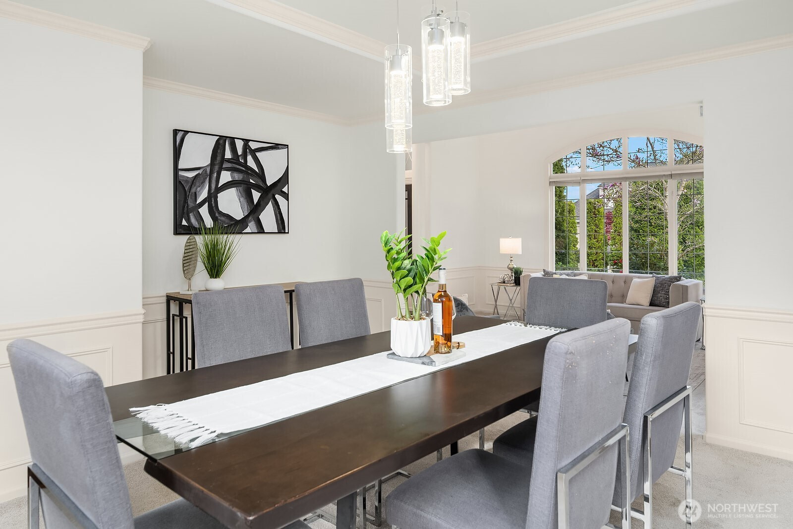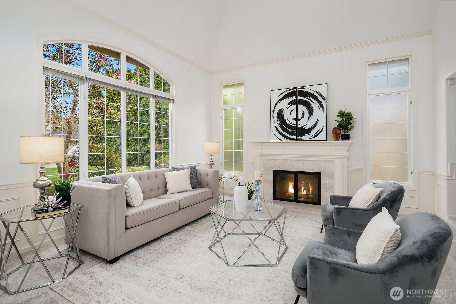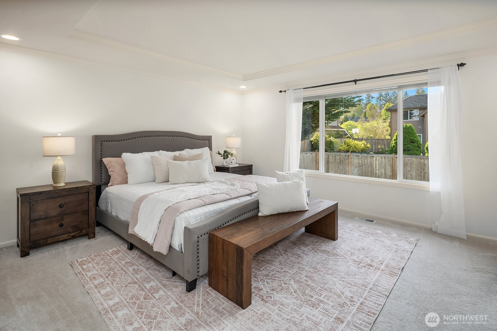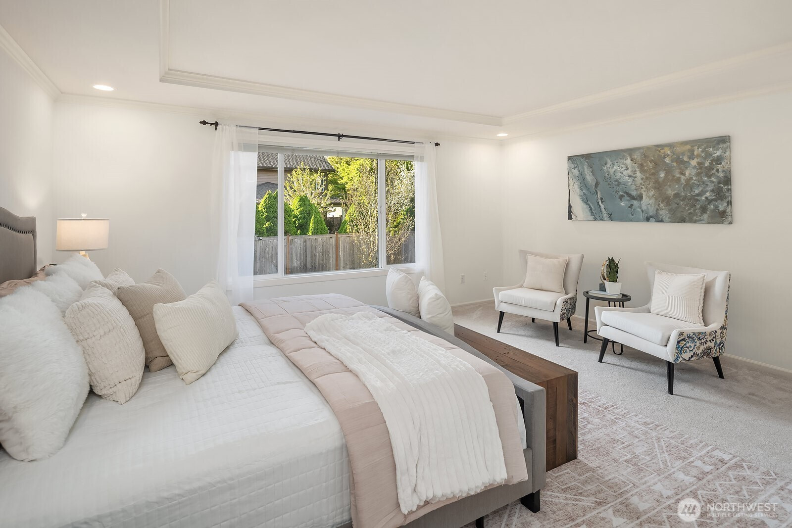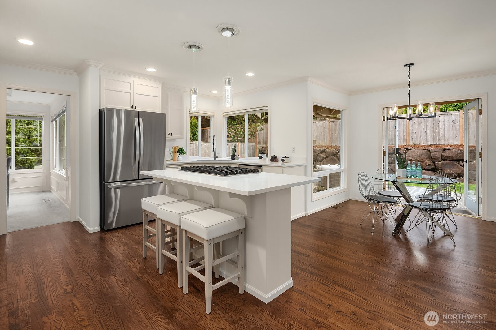 Sought after Buchan resale nestled in the Trossachs community, offering a rare combination of refined finishes and true move-in condition. This east facing 4 bedroom, 2.5 bath home spans 3,110 square feet of well-appointed living space. Step inside to soaring ceilings and a light-filled formal living room framed by a custom front door. The main level gathering room is anchored by expansive picture windows with serene views of the private backyard, perfect for relaxing or hosting guests. The kitchen impresses with upgraded quartz countertops, stainless steel appliances, a large center island, and ample cabinetry, designed equally well for everyday use and entertaining. A dedicated main level office, easily converted to a fifth bedroom, adds valuable flexibility for working from home. The upper level is anchored by a fully remodeled primary suite with a spa-inspired bath featuring premium finishes and a custom built-in walk-in closet offering exceptional organization. Three additional bedrooms and a full bath complete the upper level. Outside, enjoy a shy quarter acre lot with mature landscaping, a sports court, and a three car garage equipped with an EV charger. Central air conditioning ensures year-round comfort in every season. Major updates include a new roof, new furnace, and refinished hardwood floors throughout, making this a truly turnkey opportunity in one of the area's most desirable neighborhoods. Located within the highly regarded Issaquah School District.