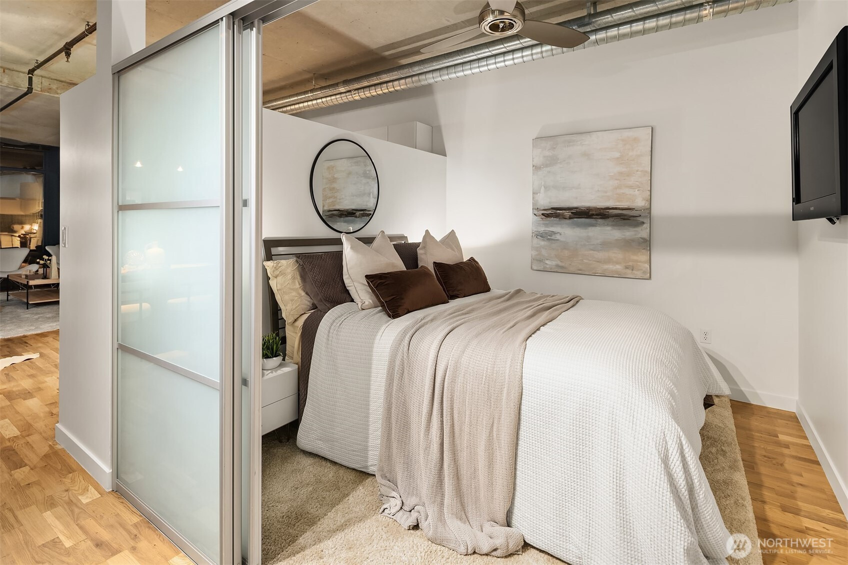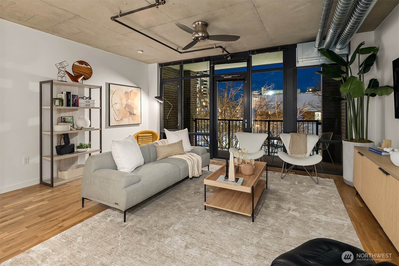 Over $50,000 in recent updates at the iconic Mosler Lofts. This west-facing residence blends industrial character with modern luxury, featuring soaring floor-to-ceiling windows that flood the open living and dining spaces with natural light and open to a private balcony. Thoughtful upgrades include a remodeled kitchen, updated flooring, new appliances, an upgraded bathroom, and custom built-in closets and vanities. The stylish kitchen is designed for entertaining, and secure garage parking adds everyday convenience. Mosler Lofts is a 12-story LEED Silver/Built Green condominium known for its steel and concrete construction, 10-foot ceilings, and loft-style design. Residents enjoy premier amenities including a 24/7 concierge, controlled access, fitness center, library and clubroom, conference and lounge spaces, guest suite, EV-ready parking, storage, and a stunning rooftop garden with fire pit and BBQ, offering mountain and water views. Located in the heart of Belltown, this walkable urban setting provides immediate access to top restaurants, nightlife, cafes, Seattle Center, the Space Needle, Olympic Sculpture Park, and the waterfront—delivering the best of Seattle city living.