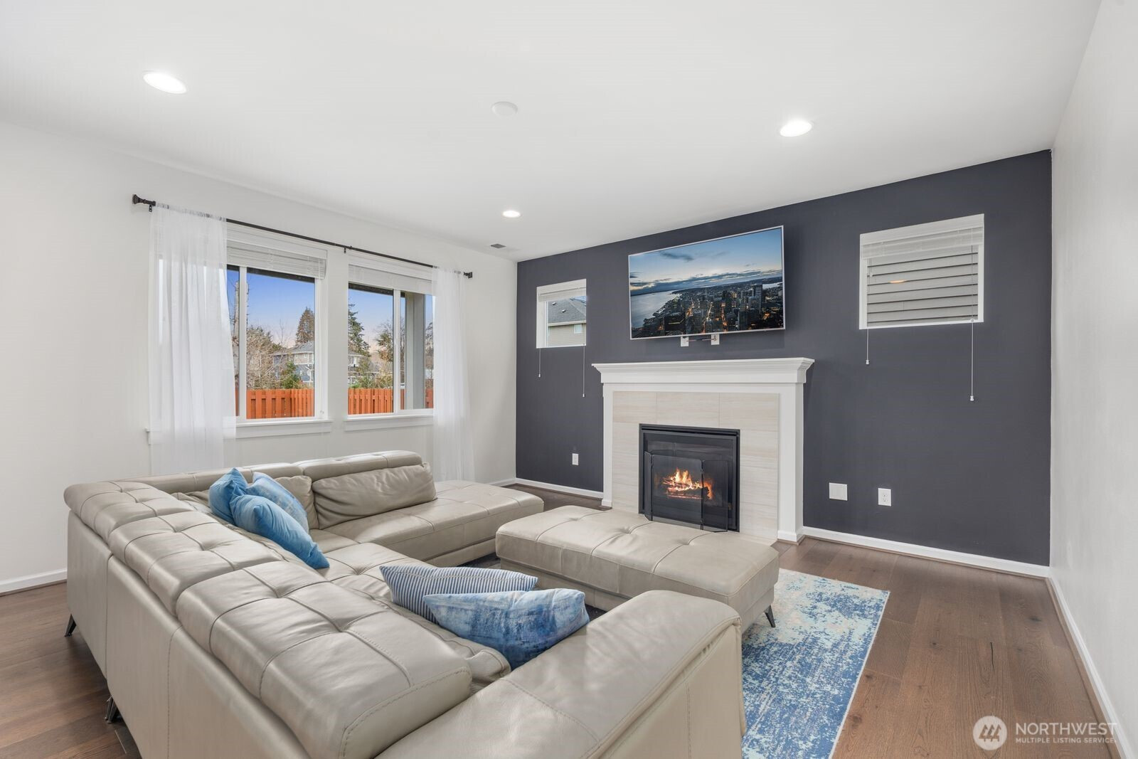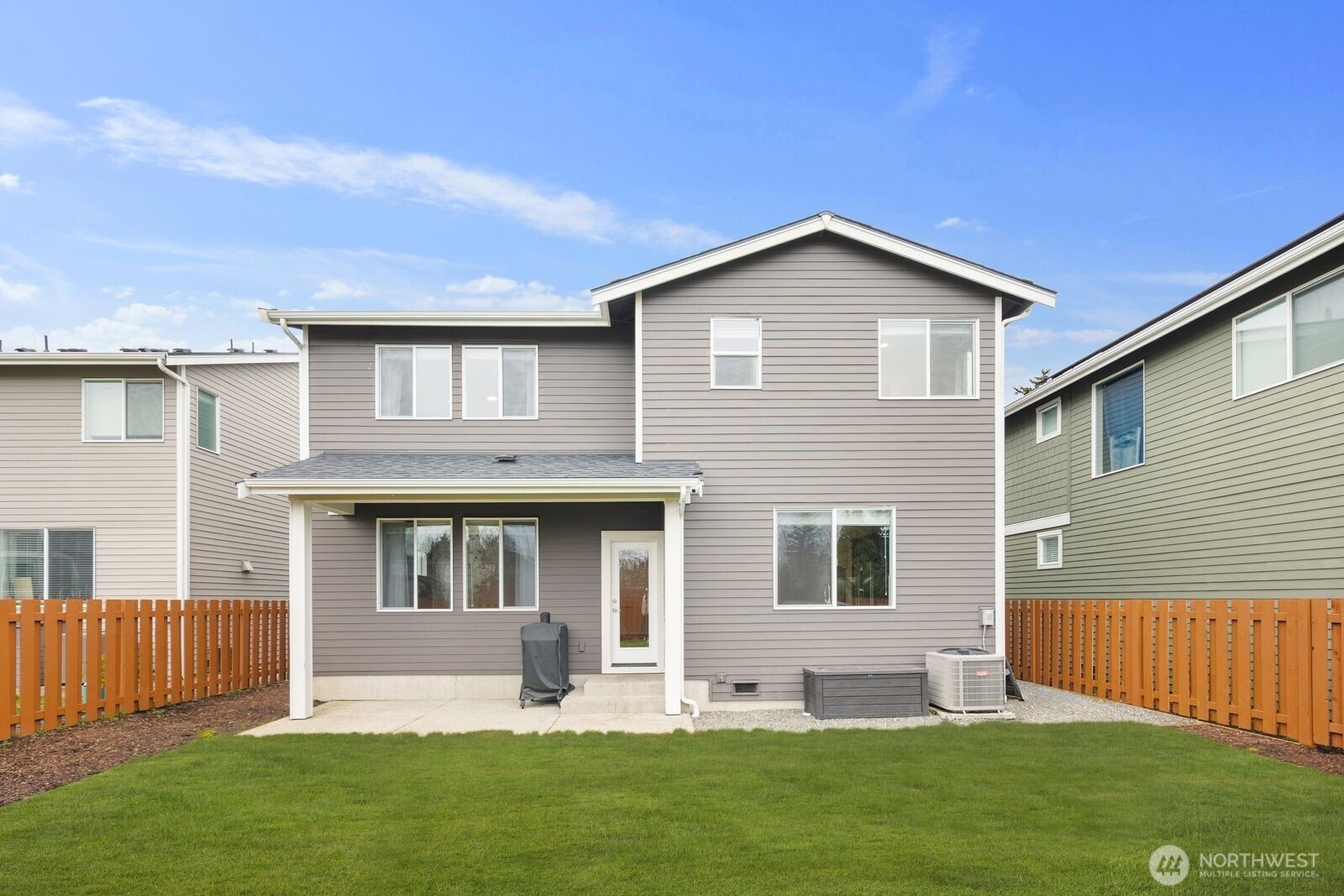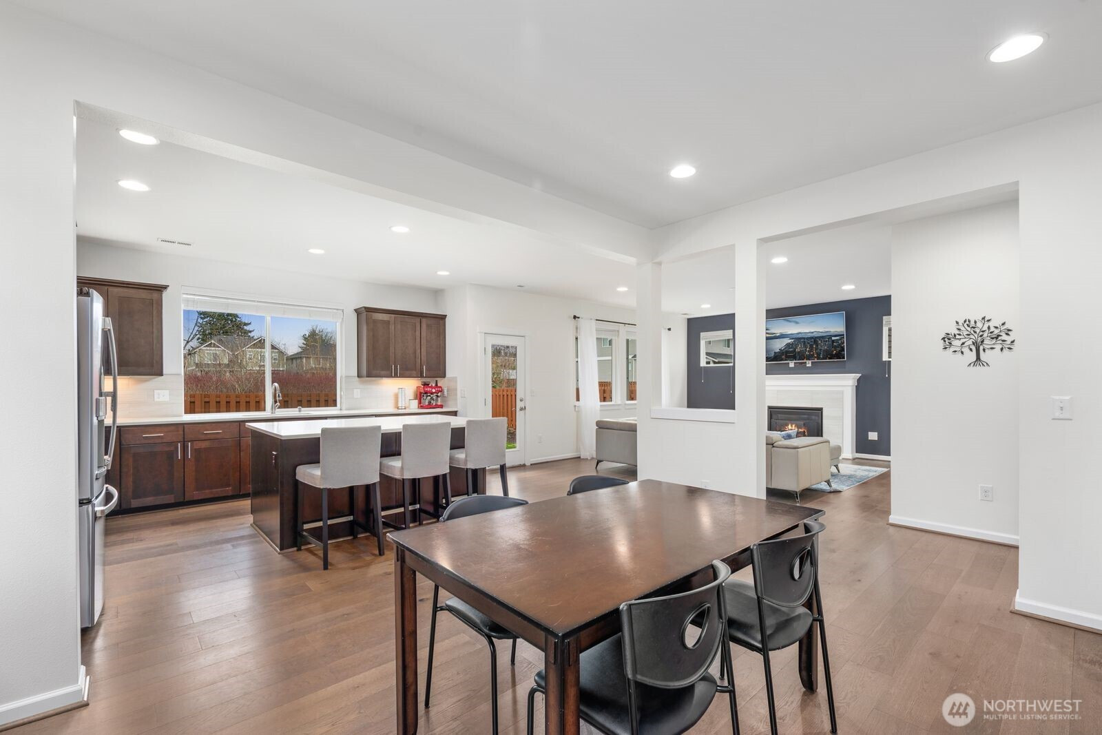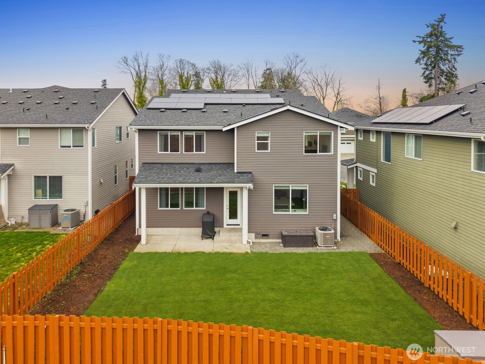 Built in 2019 and still like new, this 2,639 sq. ft. home offers 4 bedrooms and 2.5 baths in a quiet cul-de-sac within a beautifully maintained community, featuring a private neighborhood park at the end of the street. West-facing and backing to a serene greenbelt, the home enjoys abundant natural light and a fully fenced private yard. The open-concept main level showcases hardwood floors, a spacious kitchen with stainless steel appliances, large island with a formal dining area, gas fireplace in the living room, custom blinds throughout, Solar Panel, Tankless water heat, mudroom built-ins, EV charger in garage, new W/D and dishwasher, and A/C—ideal for both everyday living and entertaining. Upstairs features an inviting loft, comfortable secondary bedrooms and bathroom, and a spacious primary suite with a 5-piece en-suite bath and walk-in closet. Conveniently located minutes to the Star Lake Light Rail station with easy access to Sea-Tac Airport and downtown Seattle, and close to Redondo Beach, dining, and everyday amenities. A rare blend of comfort, privacy, and convenience—this home is a must-see.