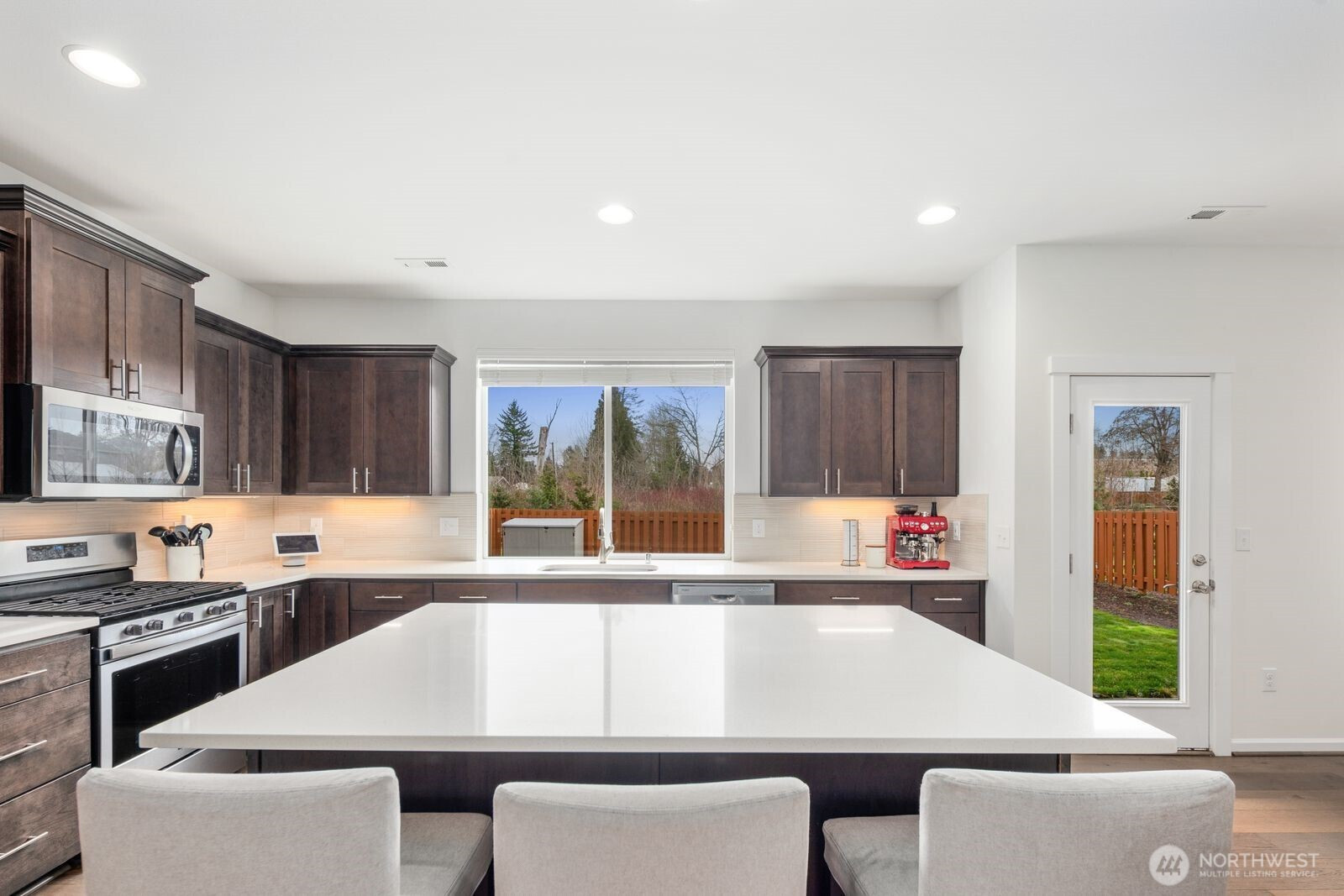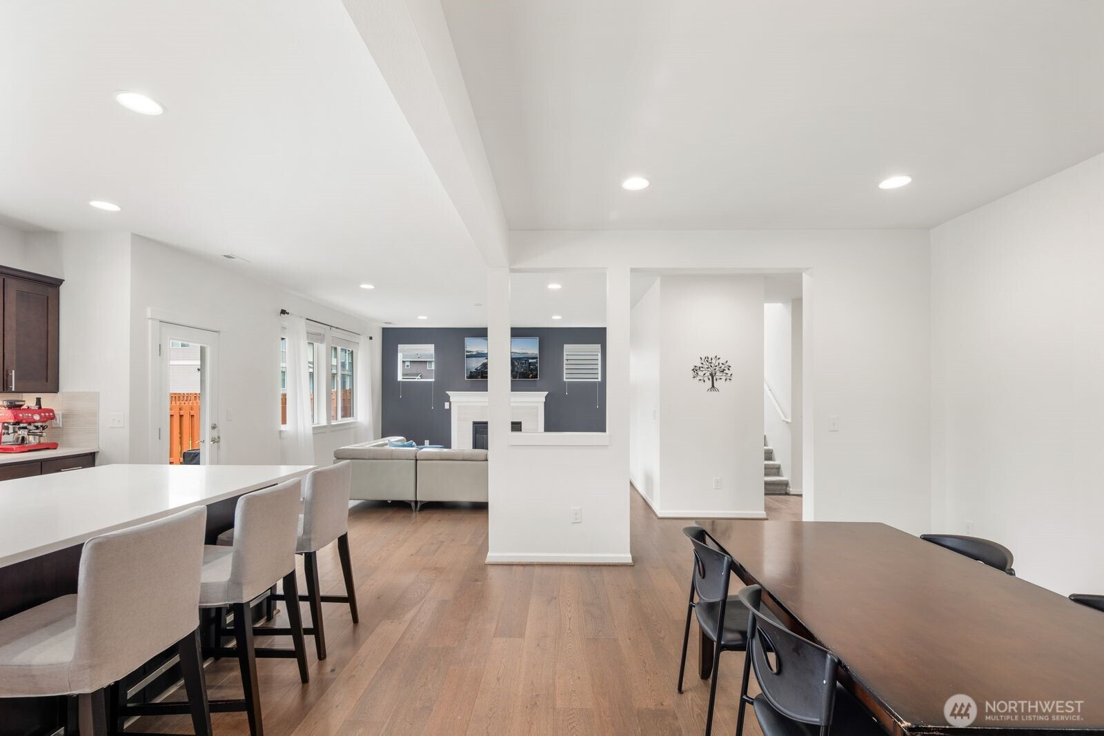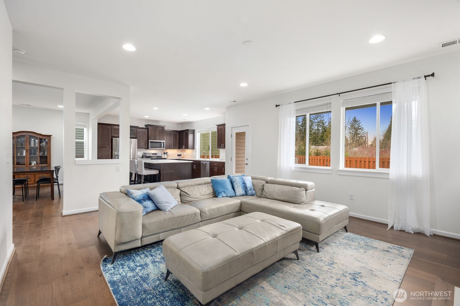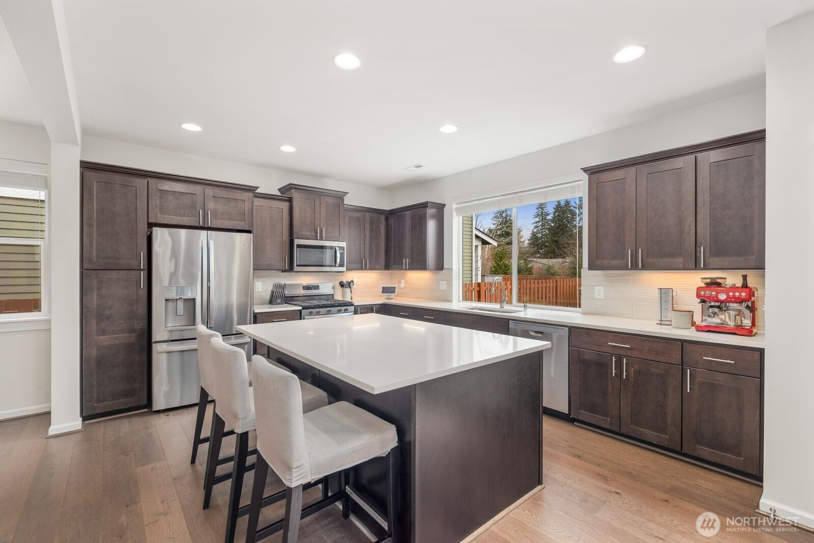 Built in 2019 and still like new, this 2,639 sq. ft. home offers 4 bedrooms and 2.5 baths in a quiet cul-de-sac within a beautifully maintained community, featuring a private neighborhood park at the end of the street. West-facing and backing to a serene greenbelt, the home enjoys abundant natural light and a fully fenced private yard. The open-concept main level showcases hardwood floors, a spacious kitchen with stainless steel appliances, large island with a formal dining area, gas fireplace in the living room, custom blinds throughout, Solar Panel, Tankless water heat, mudroom built-ins, EV charger in garage, new W/D and dishwasher, and A/C—ideal for both everyday living and entertaining. Upstairs features an inviting loft, comfortable secondary bedrooms and bathroom, and a spacious primary suite with a 5-piece en-suite bath and walk-in closet. Conveniently located minutes to the Star Lake Light Rail station with easy access to Sea-Tac Airport and downtown Seattle, and close to Redondo Beach, dining, and everyday amenities. A rare blend of comfort, privacy, and convenience—this home is a must-see.