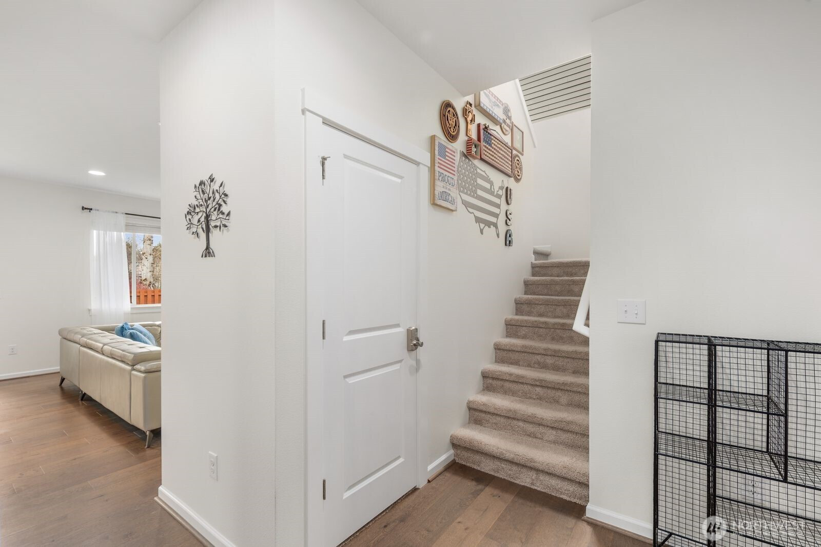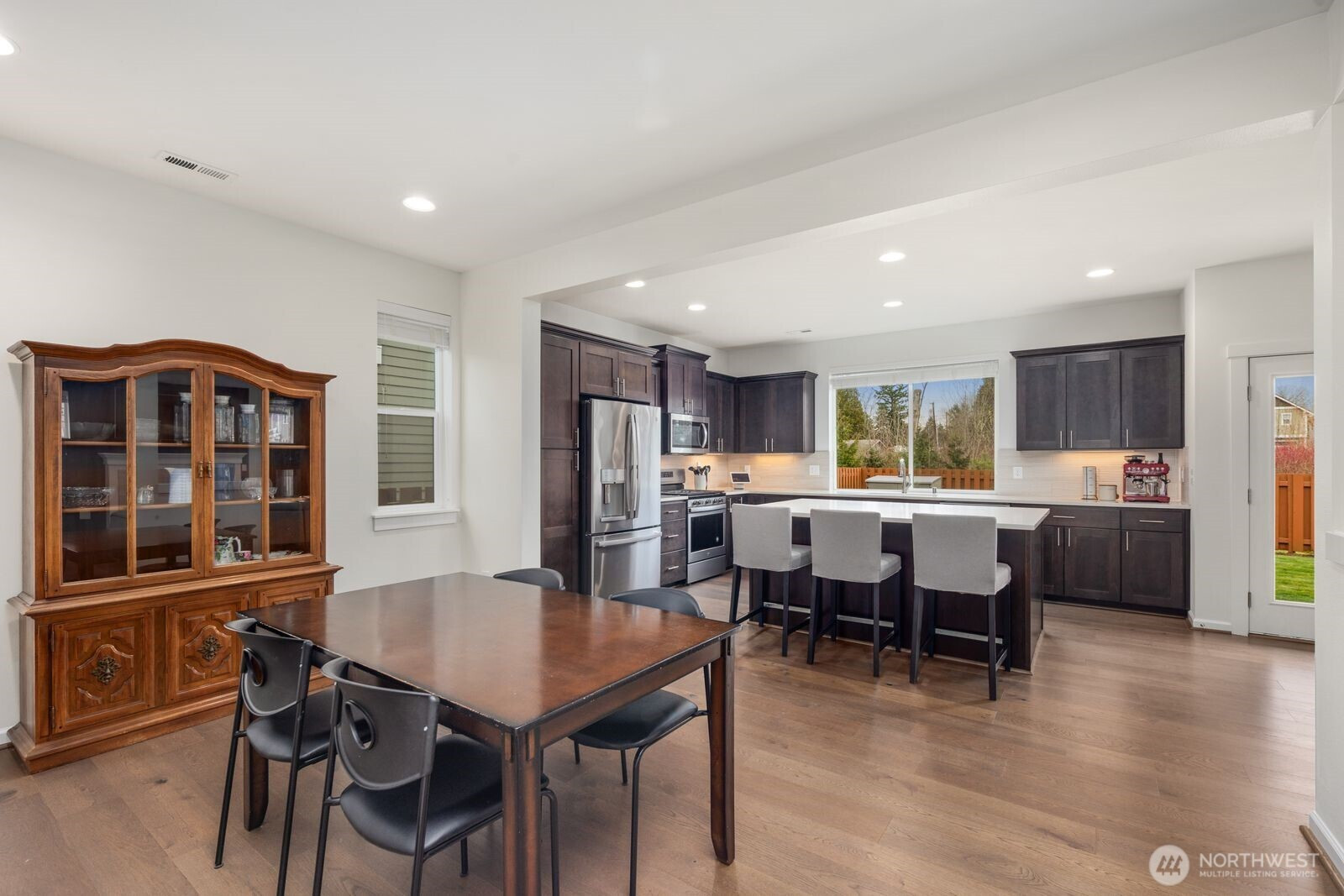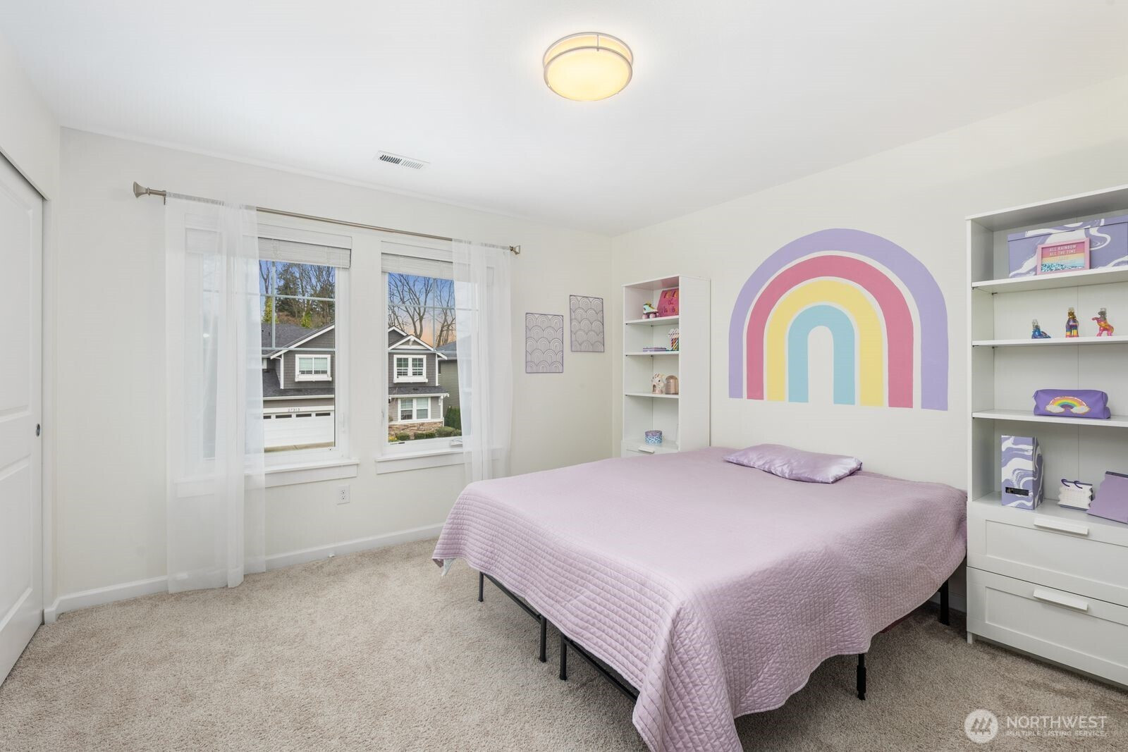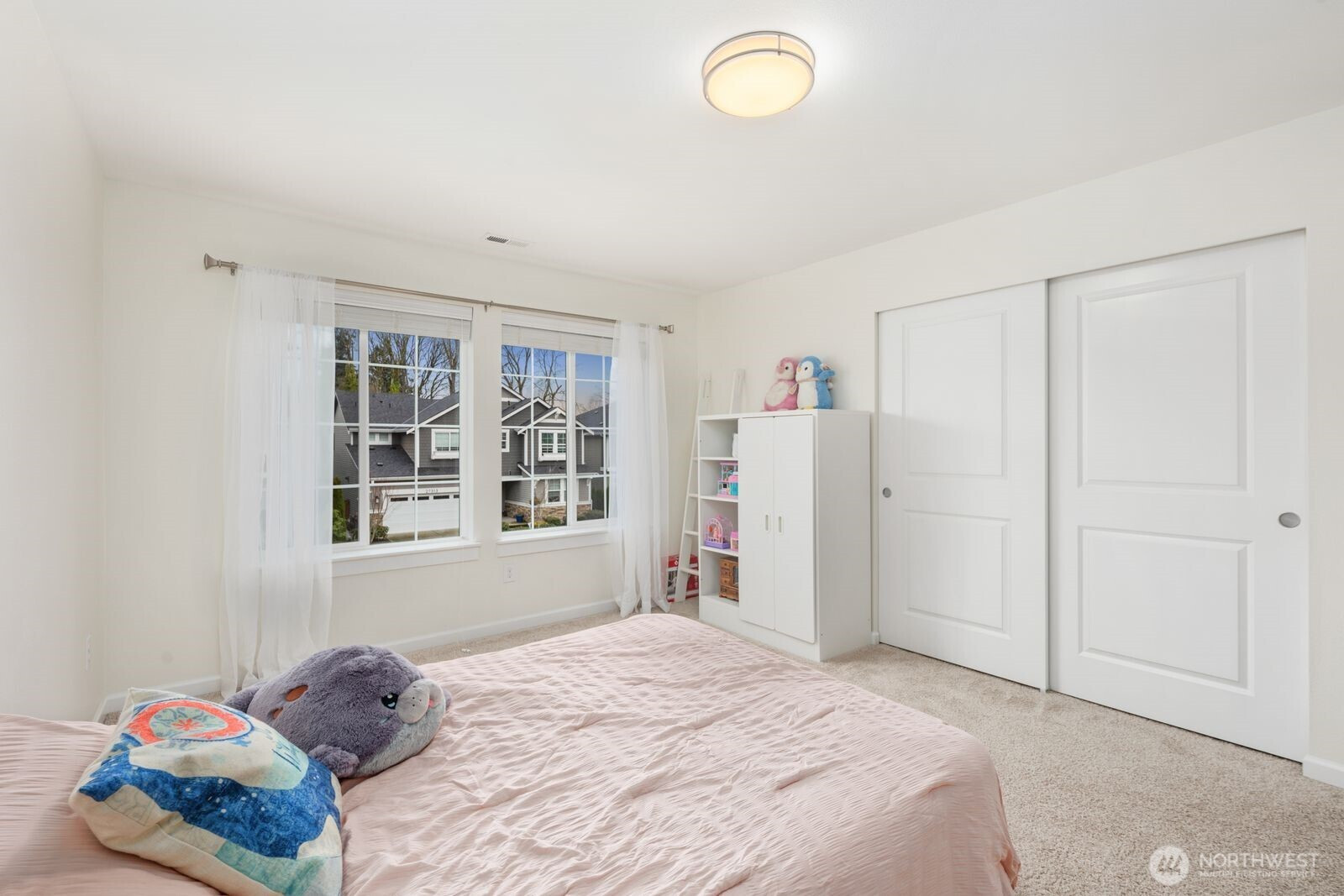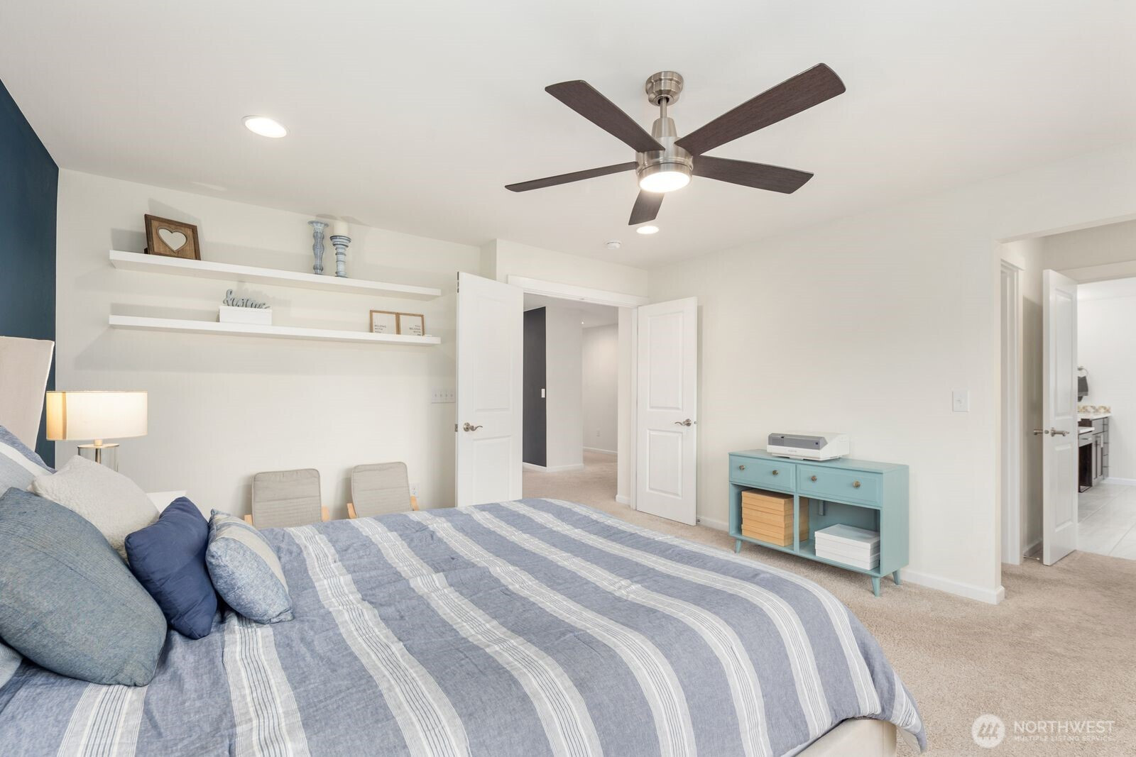 Built in 2019 and still like new, this 2,639 sq. ft. home offers 4 bedrooms and 2.5 baths in a quiet cul-de-sac within a beautifully maintained community, featuring a private neighborhood park at the end of the street. West-facing and backing to a serene greenbelt, the home enjoys abundant natural light and a fully fenced private yard. The open-concept main level showcases hardwood floors, a spacious kitchen with stainless steel appliances, large island with a formal dining area, gas fireplace in the living room, custom blinds throughout, Solar Panel, Tankless water heat, mudroom built-ins, EV charger in garage, new W/D and dishwasher, and A/C—ideal for both everyday living and entertaining. Upstairs features an inviting loft, comfortable secondary bedrooms and bathroom, and a spacious primary suite with a 5-piece en-suite bath and walk-in closet. Conveniently located minutes to the Star Lake Light Rail station with easy access to Sea-Tac Airport and downtown Seattle, and close to Redondo Beach, dining, and everyday amenities. A rare blend of comfort, privacy, and convenience—this home is a must-see.