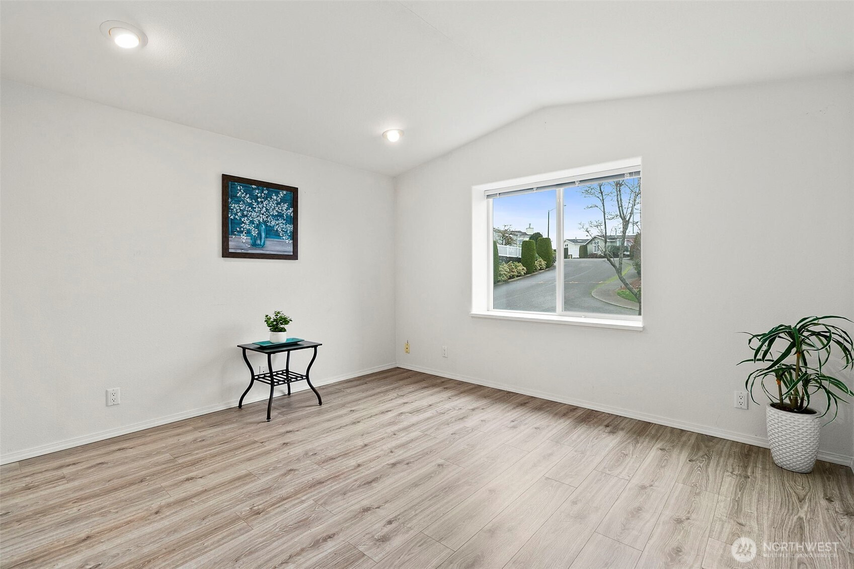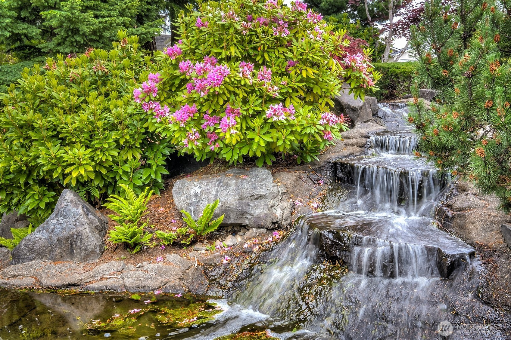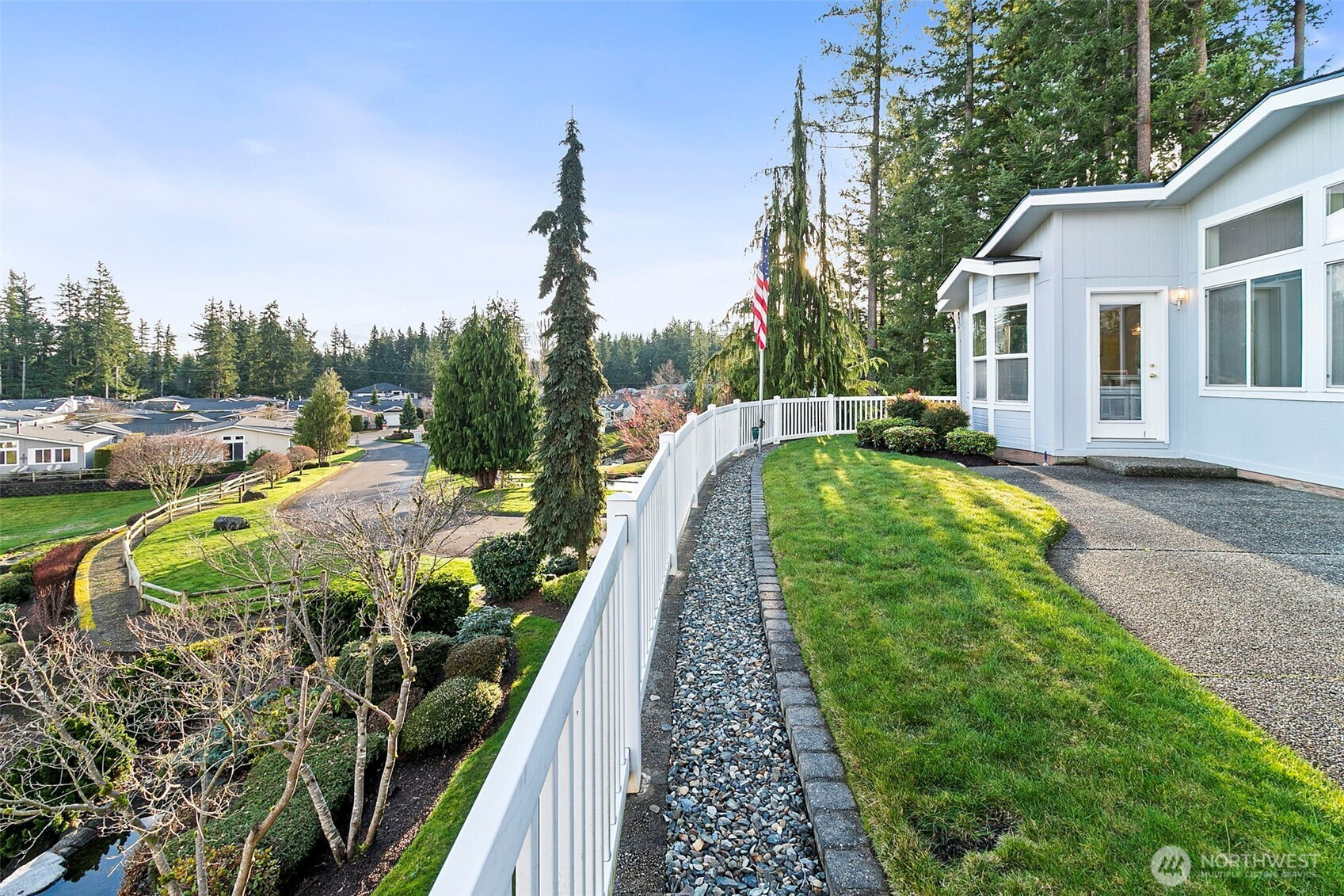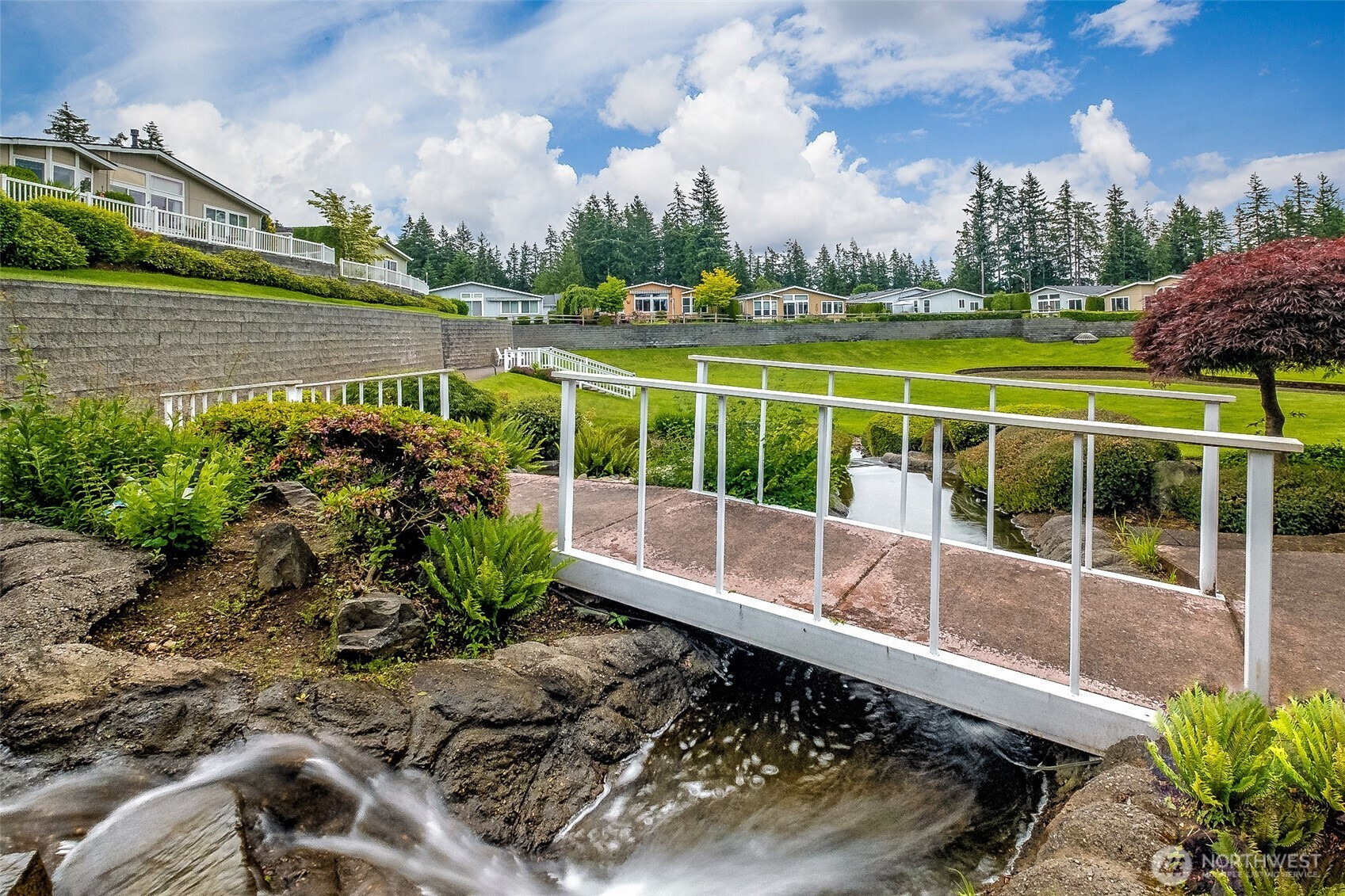 Wake up to serene gardens, cascading waterfalls, & true tranquility in one of Water Gardens most desirable 55+ gated locations. This beautifully positioned home offers stunning views of the community’s lush landscaping & water features right from your windows. Perk a boo view of Mt Rainier from the back. Relax on your private patio & enjoy peaceful mornings & evenings surrounded by nature. Inside, brand-new luxury vinyl plank flooring enhances the light, open feel. The single-level floor plan features three spacious bedrooms, two full bathrooms, vaulted ceilings, & an oversized laundry room. A two-car garage provides ample space for storage or hobbies, making this home ideal for comfortable, low-maintenance living. For $35 per month you can have lawn maintenance. RV parking on site.