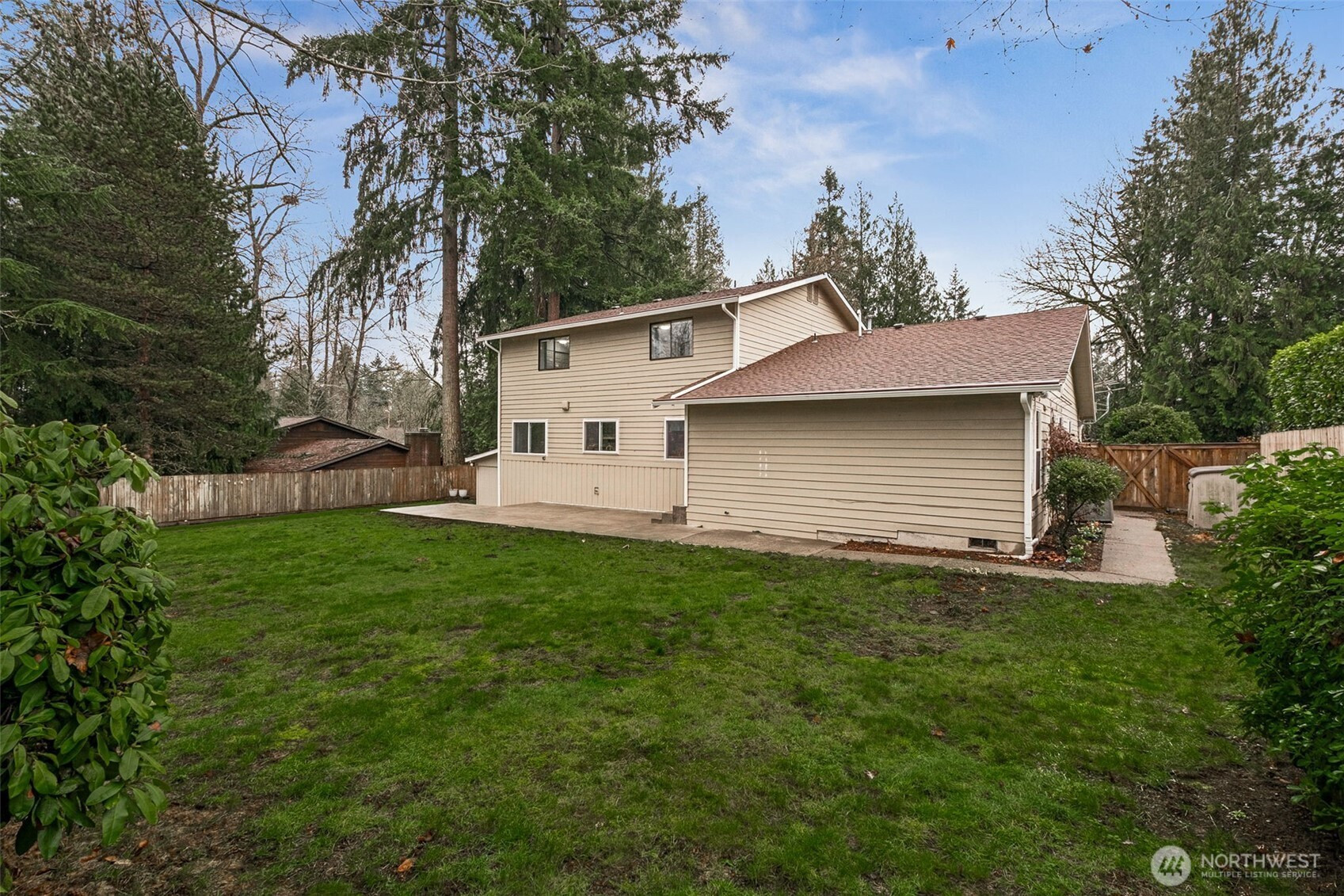 Tucked away on a peaceful private road, this charming, open concept 3 bedroom home on over 1/4 Acres offers a serene retreat just steps from nature. Enjoy morning coffee on the covered porch through elegant French doors, surrounded by lush greenery. Thoughtfully updated and lovingly maintained. The main level boasts newer windows (2022) and engineered flooring and generous gathering spaces in the living room anchored by a cozy gas fireplace, formal dining area and the updated eat-in kitchen with painted cabinetry. Also, the kitchen area flows into the inviting family room, which opens to a large patio and an expansive, fully fenced backyard with garden spot—your perfect space for outdoor living and play. You’ll also find a convenient laundry room, a stylish half bath and flexible office space. Upstairs features a spacious primary suite with private bath, two additional bedrooms and a well-appointed guest bath. Upgrades include a 50-year roof with gutter helmets, A/C, freshened paint and more. Extra storage included in attic with pull down access and in the attached and detached outdoor storage sheds. This amazing home is ideally located near East Hill/Covington amenities, Lake Meridian, local schools and the Kent Service Ball Fields Park just down the road. No HOA and ready for you to call it home!