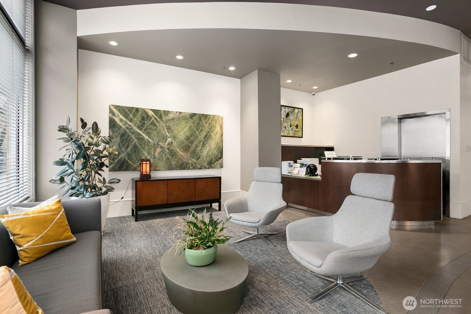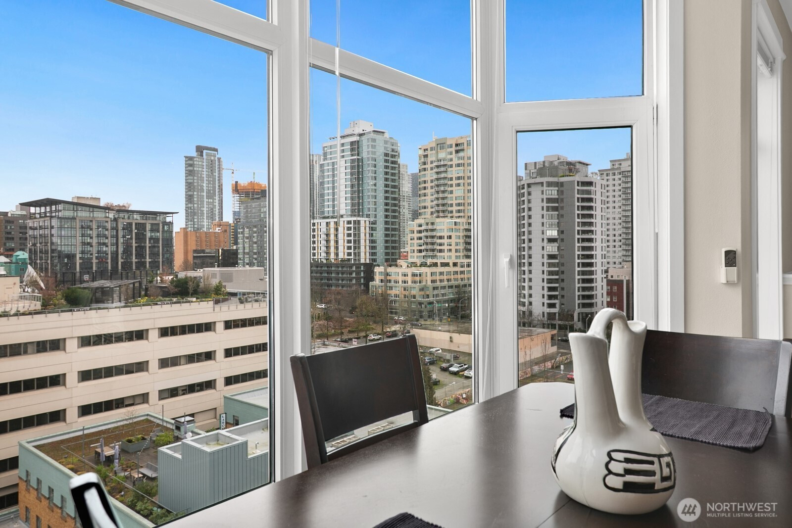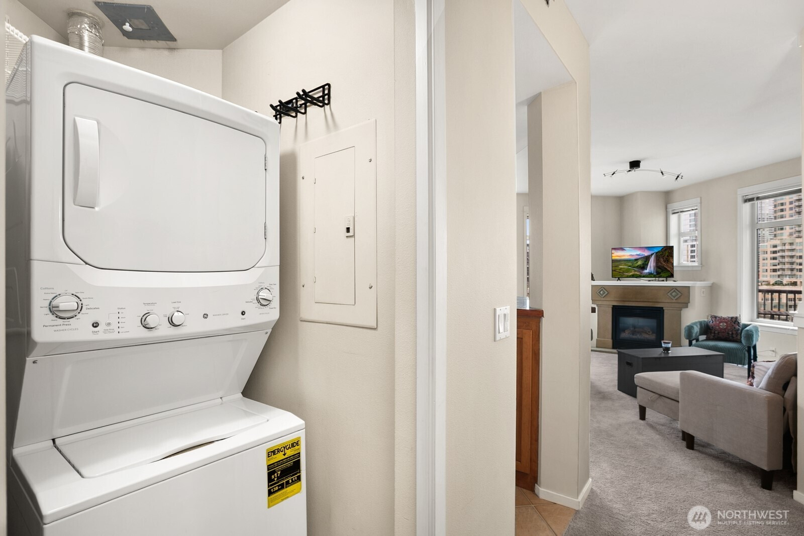 Light-filled corner residence at The Ellington with a layout that truly stands out—not your typical boxy condo. The thoughtfully designed floor plan, soaring 9-foot ceilings, and expansive windows create an open, airy feel that lives larger than expected. The spacious kitchen offers bar seating, gas cooking, and abundant storage, flowing seamlessly into the generous living area, complete with a cozy gas fireplace and access to a south-facing deck with lovely city views. Enjoy full-service amenities including 24-hour concierge, guest suites, fitness center, spa, club room, and conference space. Well-run HOA with reasonable dues and no rental cap. Pet-friendly (2 pets per home), washer and dryer included. Rare to find large parking spot, easily fits an SUV, storage included. All just steps to Sculpture Park, Pike Place Market, Seattle Center, and the downtown core.