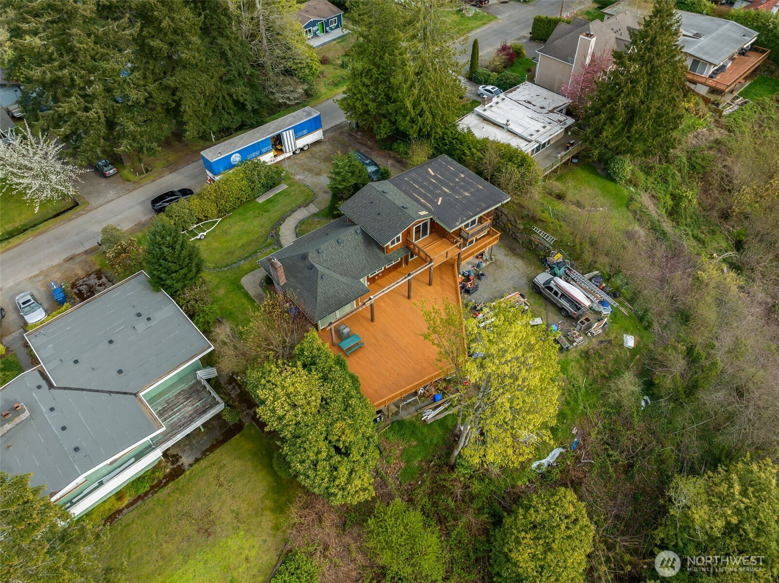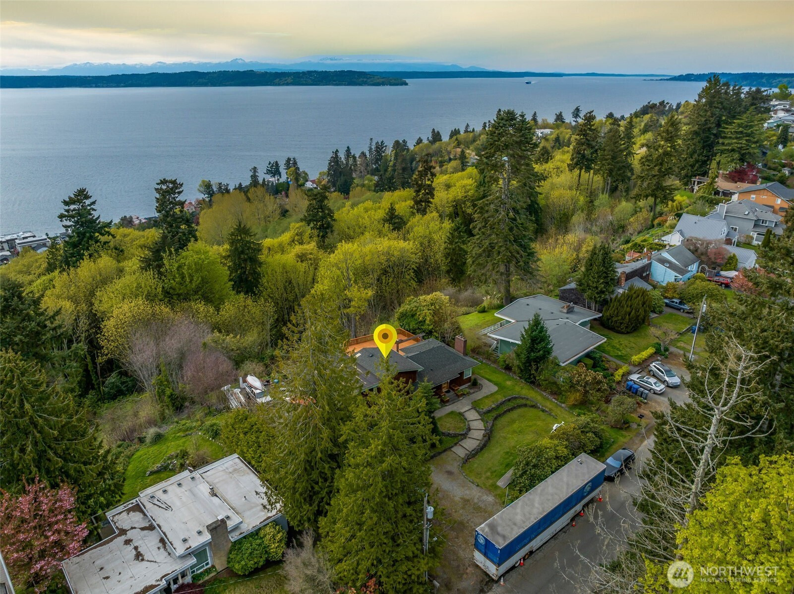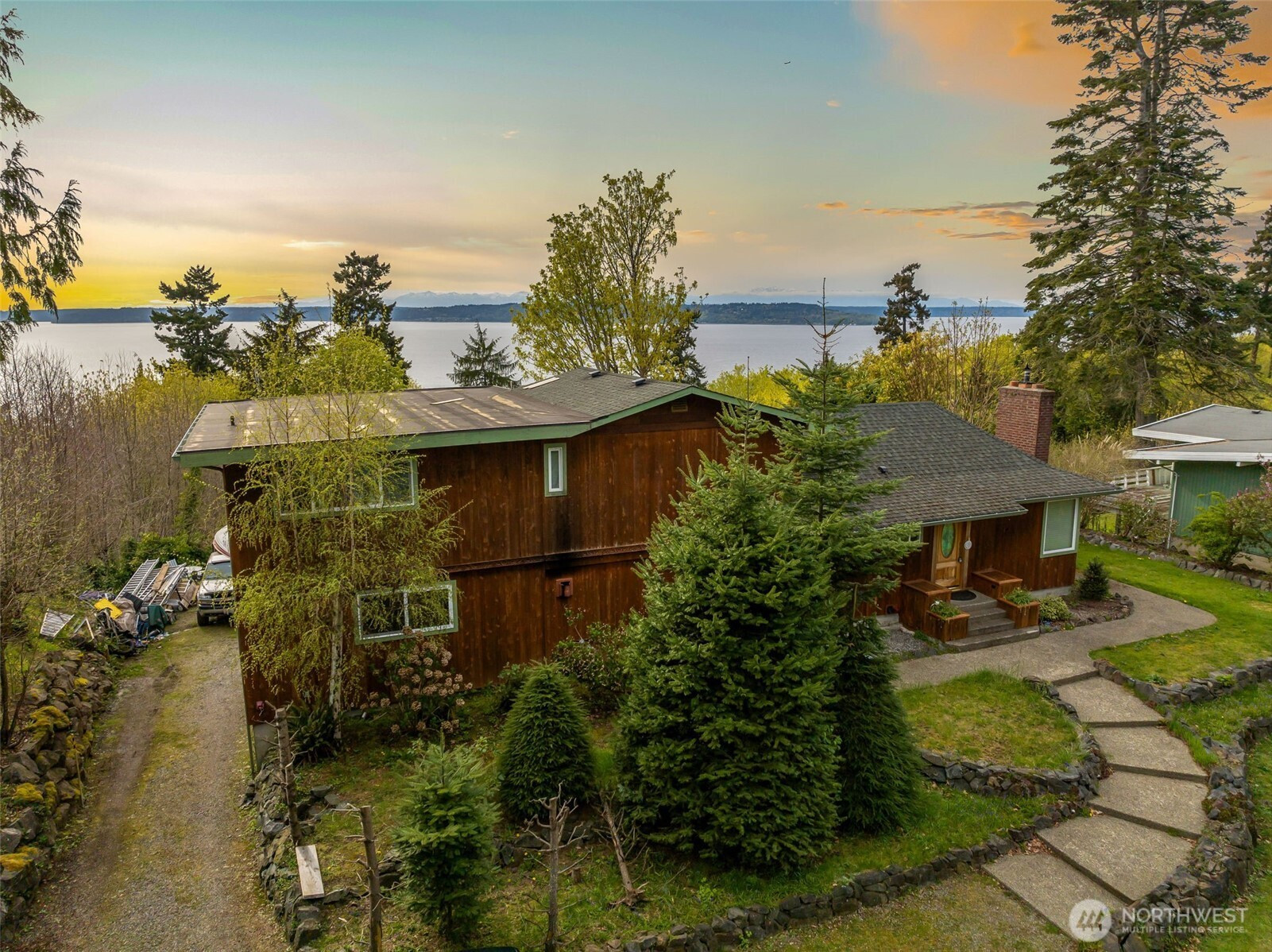 Rare opportunity to create a one of a kind property on nearly an acre on a quiet, dead end street, offering sweeping water views and direct privacy backing to public land. The home is positioned on a dramatic, sloping site that enhances both outlook and seclusion, while naturally preserving sightlines and protecting the surrounding landscape. The existing residence is ready for a comprehensive renovation or reimagining, presenting an ideal canvas for builders, investors, or end-users with vision. While a portion of the lot is steep, the usable footprint offers ample space to design a custom view home that maximizes light, views, and indoor-outdoor connection. The lower level features a fully separate ADU with 1 bedroom and 1 bathroom, thoughtfully remodeled in 2021, perfect for rental income, guest quarters, or extended living during renovation. With captivating water views, a private natural setting, and significant upside potential, this is a rare opportunity to bring a truly special property to life.