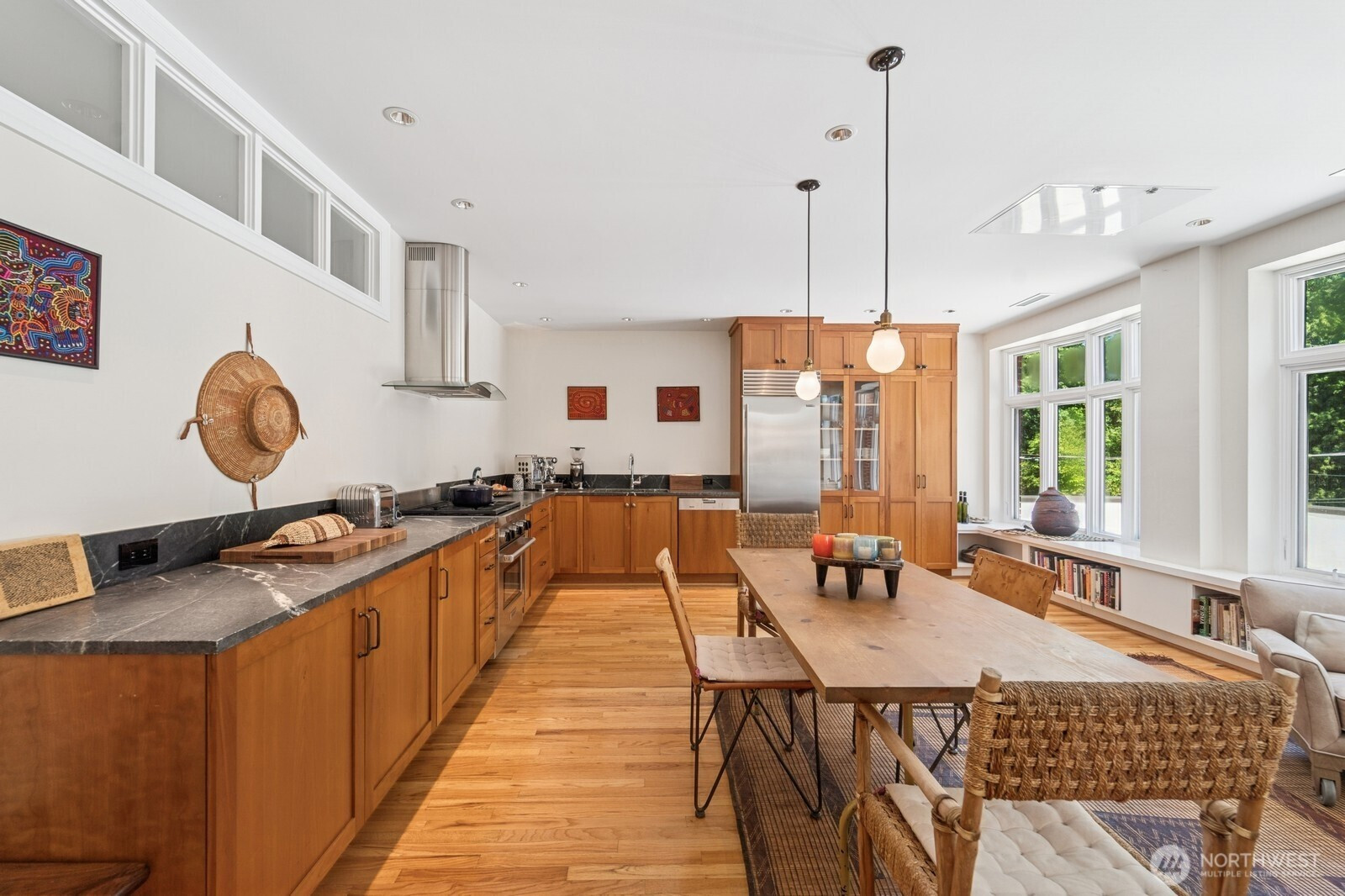 Designed & built in 1930 by renowned architect John Graham, this boutique 8-unit Art Deco building offers timeless character & rare exclusivity. Perched above Mt. Baker Park, this stunning home boasts sweeping urban green views & a flexible floorplan featuring custom built-ins, office nook, spacious walk-in w/custom cabinets, & tall ceilings incl a ridge triangular skylight that floods the space w/natural light. The kitchen is a showstopper, remodeled w/abundant cabinetry, soapstone counters, & premium appliances incl a Wolf range, Miele dishwasher, & Sub-Zero fridge. The location in the scenic Mt Baker neighborhood is unbeatable, steps from MioPosto, a Pilates studio, parks, Lake WA & more, w/quick access to Light Rail/transit. 1Prkg/1Strg
