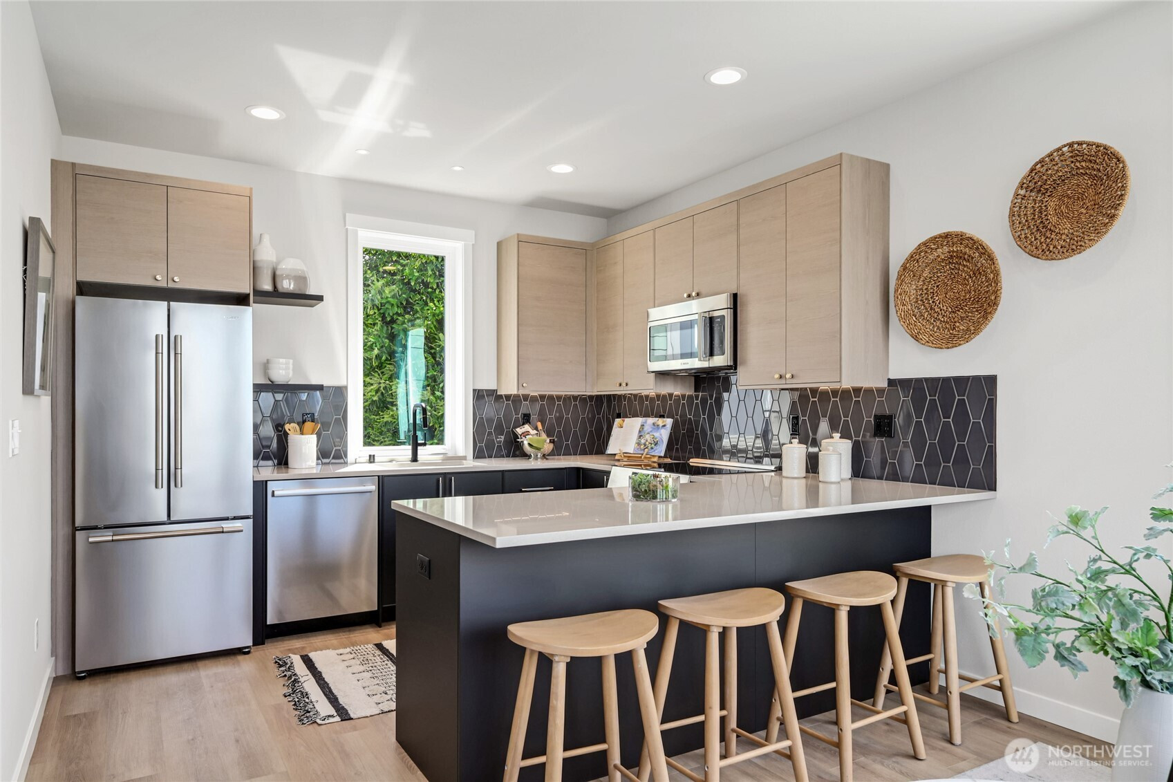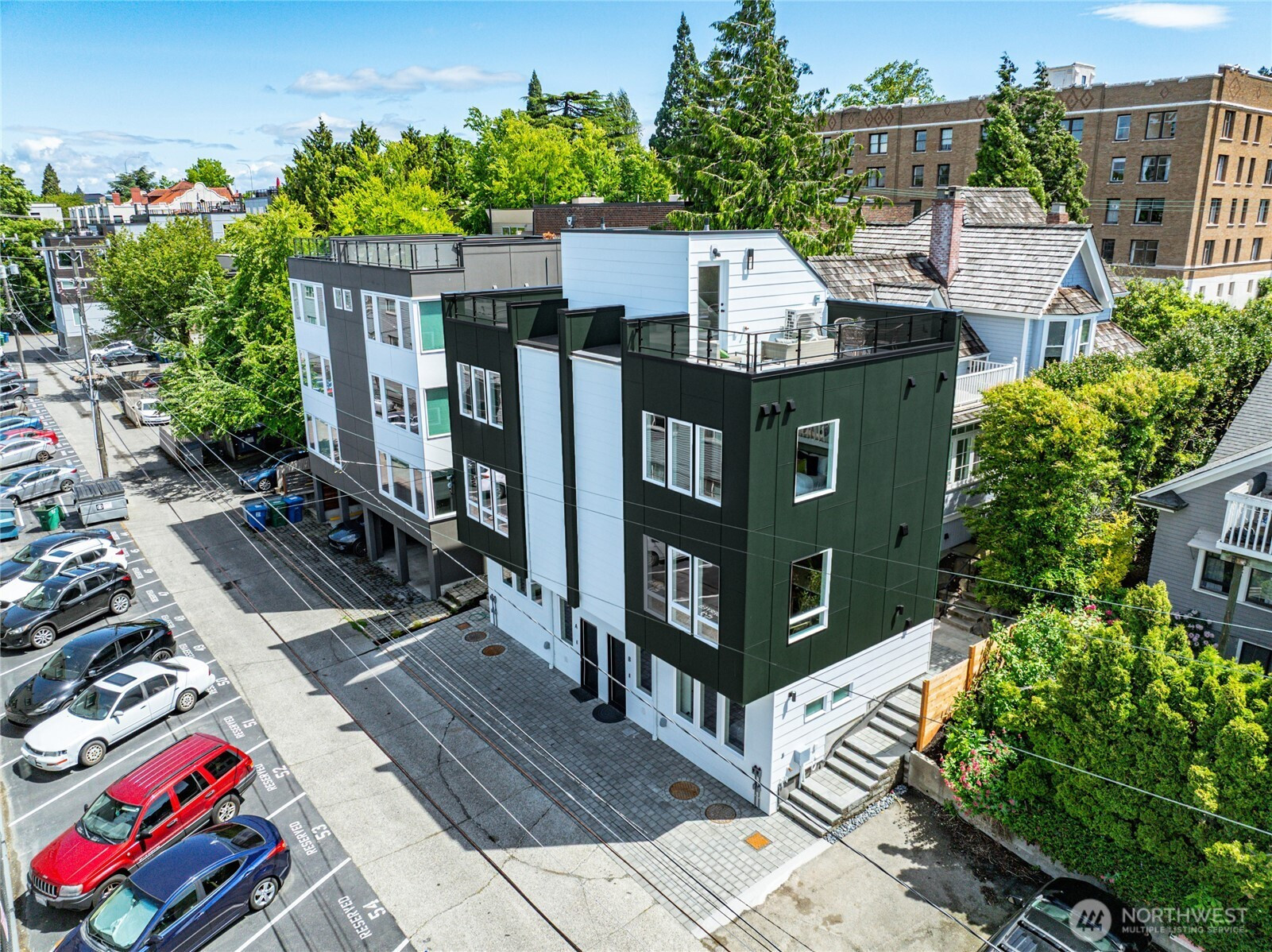 Wake up to sweeping views of Lake Union and the Space Needle from this brand-new Eastlake home, where thoughtful design meets modern efficiency. The open, light-filled layout features warm tones, refined finishes, and a chef’s kitchen with custom cabinetry, quartz countertops, and upgraded stainless appliances. Upstairs, the primary suite offers skyline views and a spa-like bath with radiant-heated floors and frame-less glass shower. Enjoy year-round comfort with high-efficiency systems and a hybrid water heater. Host or relax on the rooftop deck with panoramic views. Includes EV-ready parking. Steps to shops, cafes, parks, and minutes to SLU, UW, downtown, and I-5. No HOA—just elevated living in Eastlake.