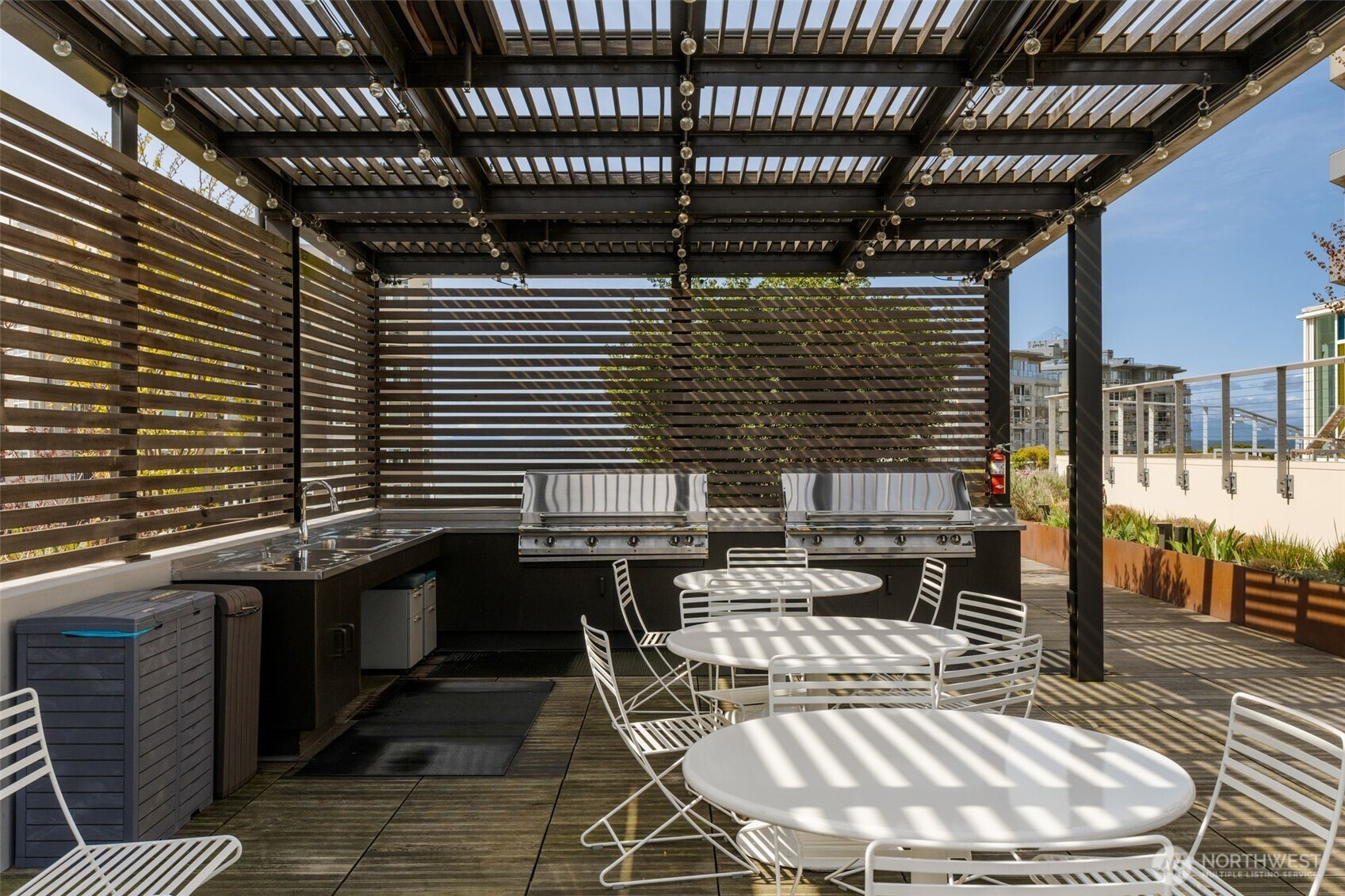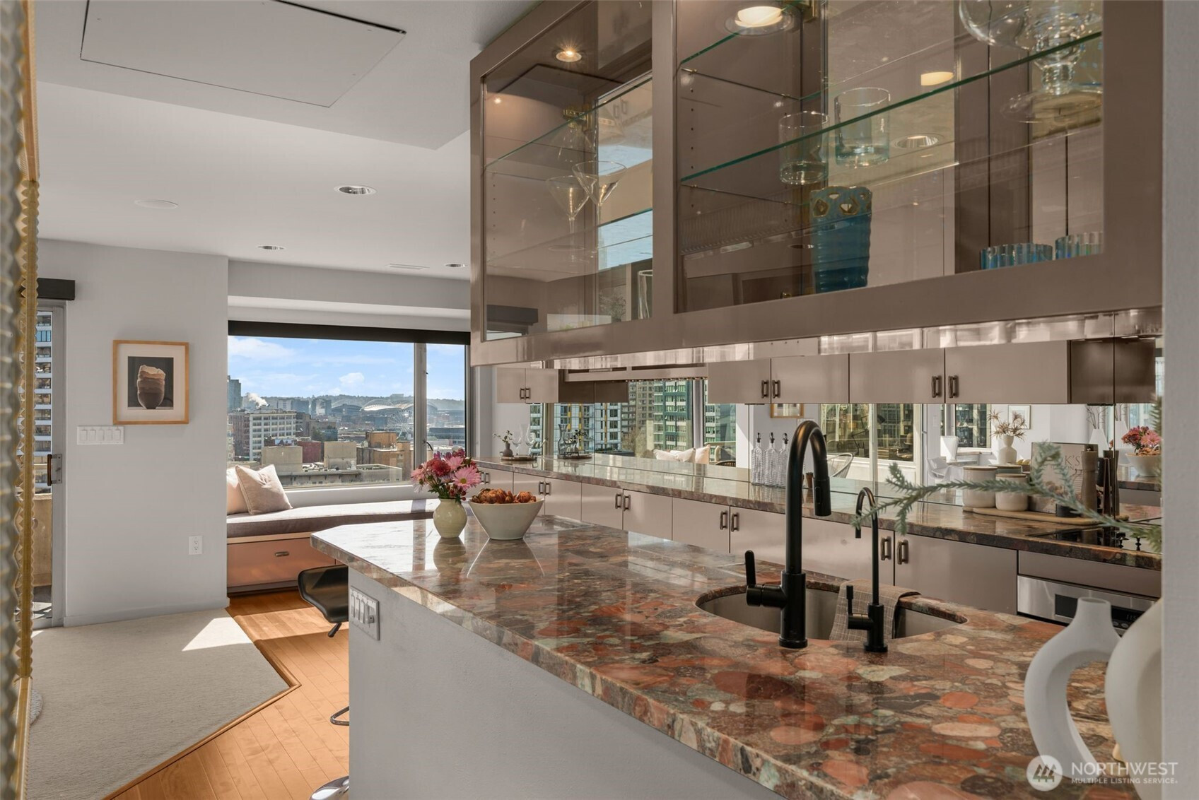 Welcome to Bay Vista and this light filled corner residence showcasing sweeping views from Lake Union and the Space Needle to Mt Rainier and Puget Sound. This 1302 sq ft single level, open concept, 1 Bedroom (could be converted to two bedrooms) 1.75 bath fully remodeled home features a spacious 5 piece primary en-suite with heated flooring, custom built-ins throughout, 30 feet of granite countertop, high end appliances, and so much more. Residents enjoy 24/7 concierge service, a dedicated parking space, and a private storage unite all within a close-knit community, supported by a strong HOA. A standout amenity is the spectacular 6th-floor plaza, featuring a walking path, pickleball court, community garden with raised beds, an outdoor BBQ kitchen with skyline views - the perfect place to enjoy New Year’s Eve Fireworks! This is the one you have been waiting for!