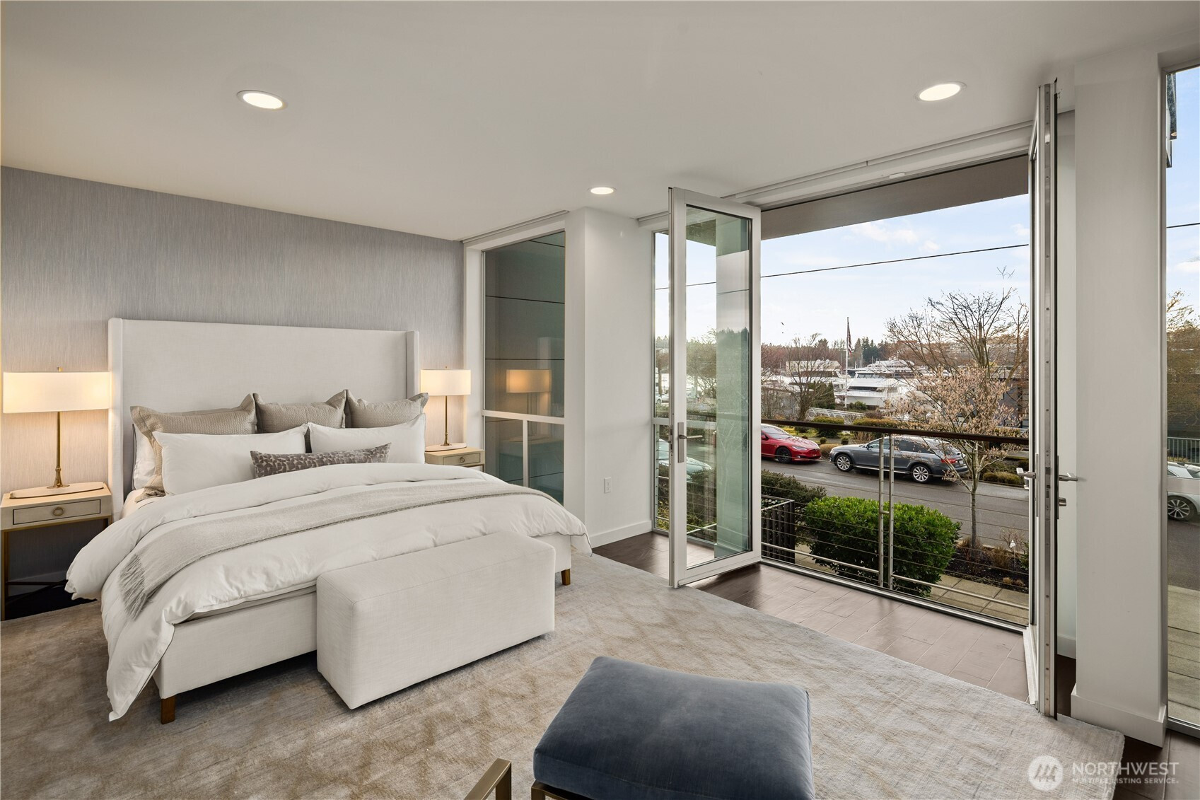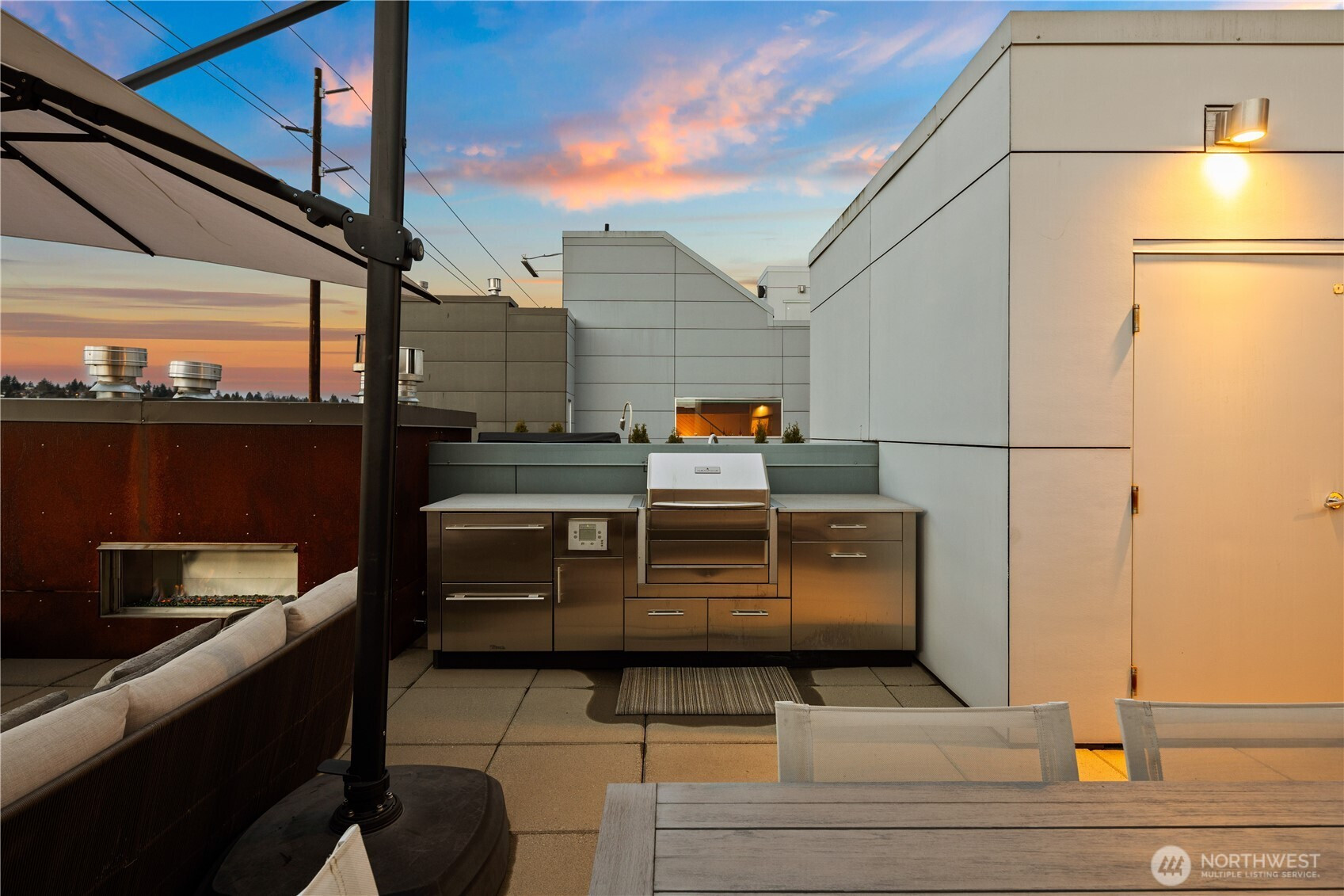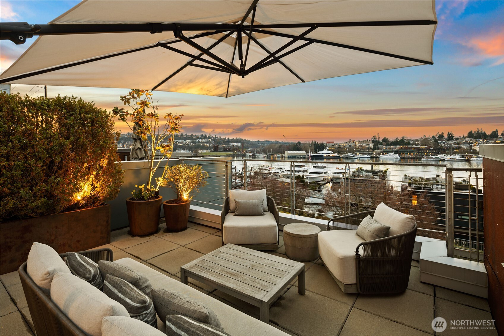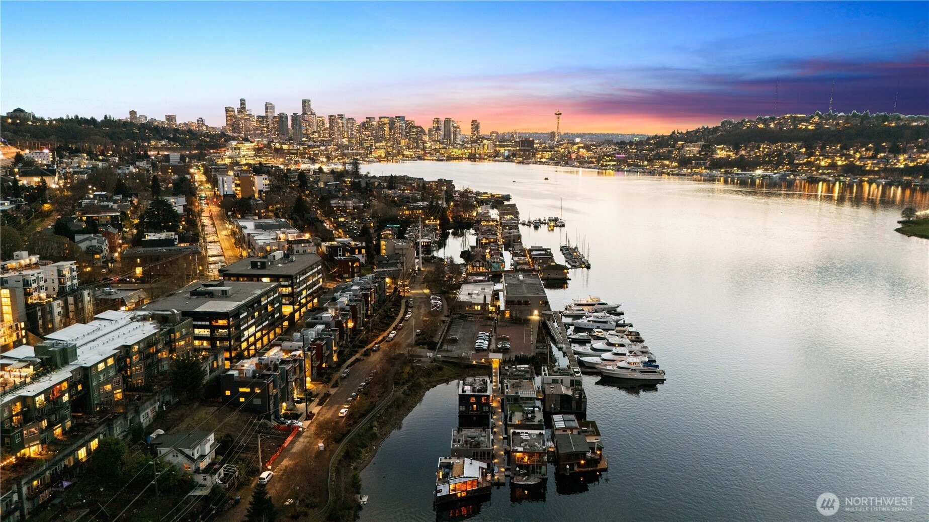 Enjoy sweeping views of Lake Union and the Seattle skyline. Thoughtfully designed from top to bottom by a local interior designer, the home showcases the highest level of finishes, custom lighting, and bespoke wallpaper throughout. The chef’s kitchen features commercial-grade appliances, Quartz countertops, and large island. The expansive living room is anchored by a striking metal-clad gas fireplace and opens to a balcony overlooking Lake Union, with space for dining and a beautifully appointed powder room. Private elevator provides access to every level, while auto blinds add effortless comfort to the living room and primary suite. The primary retreat offers a wall of windows, gas fireplace, private balcony, walk-in closet, and spa-inspired bath with heated floors. A guest suite with ensuite bath and patio provides privacy and comfort, while a flexible third room works perfectly as a home office or den. A stunning rooftop deck with built-in BBQ and fireplace captures unobstructed views of Lake Union and skyline. Low-voltage landscape lighting and irrigation enhance both the grounds and rooftop terrace. Residents enjoy access to Ward Cove Marina amenities including moorage, fitness center, bike storage, and guest suite. Perfect for full-time living or a seasonal retreat—embrace the ultimate “lock-and-walk” or “lock and sail” lifestyle in one of Seattle’s most vibrant waterfront communities with easy access to coffee shops, restaurants, UW, Amazon and Gasworks Park.