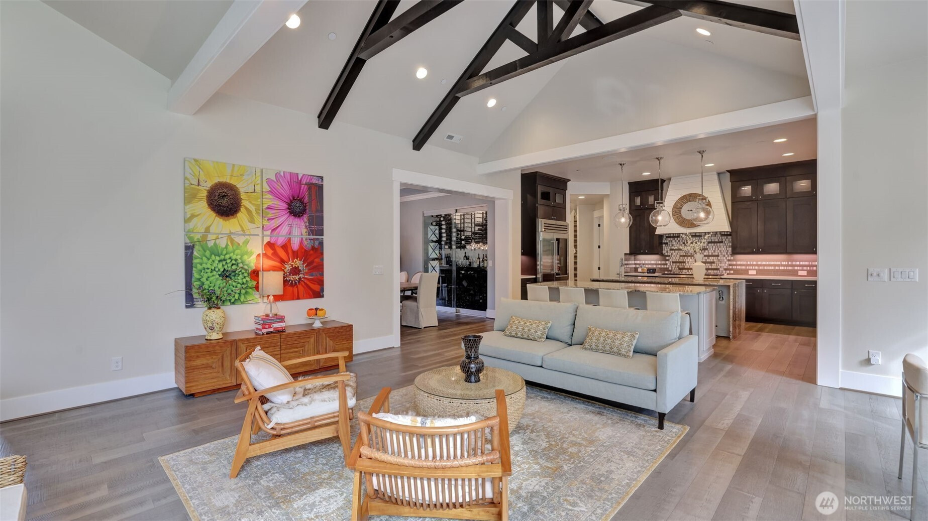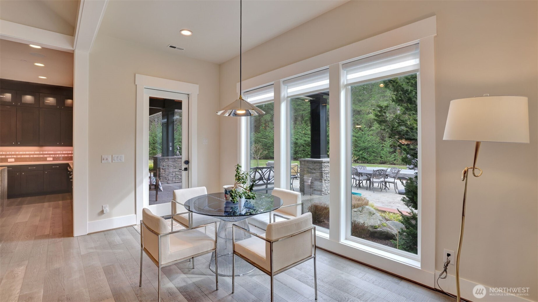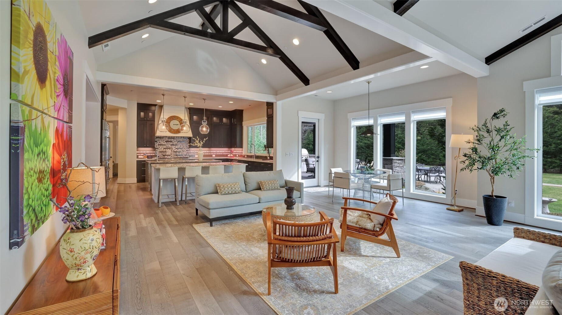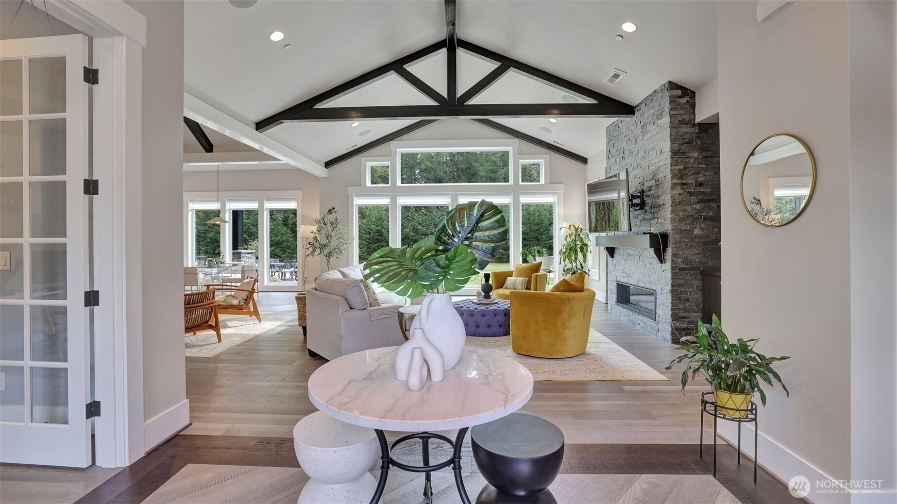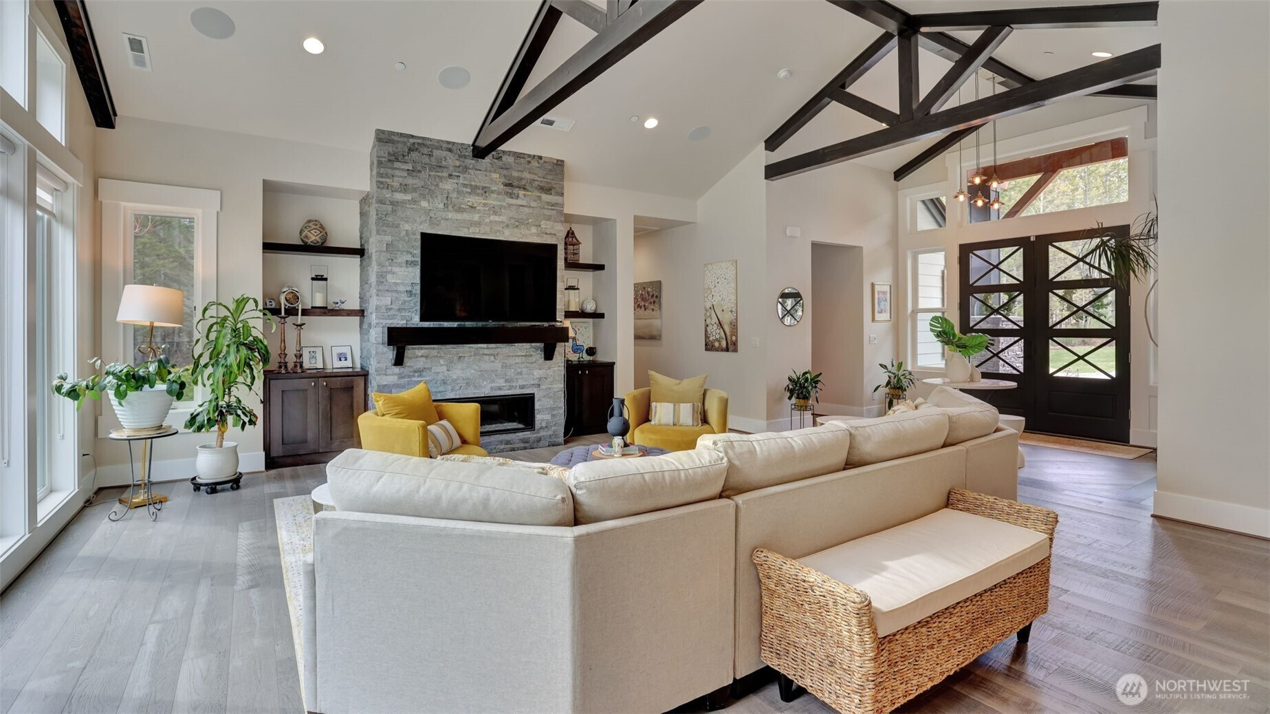 Set on nearly five acres of serene Pacific Northwest landscape, this 4,560 sq.ft. custom residence embodies contemporary elegance with a sense of arrival. A grand, surfaced drive leads to the home’s striking façade, where clean architectural lines hint at the sophistication within. Step into a breathtaking great room defined by vaulted ceilings, exposed wood beams, and floor-to-ceiling windows that frame a meticulously curated backyard oasis. The chef’s kitchen is a showpiece, appointed with Wolf appliances, dual prep and serving islands, and a Sub-Zero Pro refrigerator—an entertainer’s dream. A formal dining room with a temperature-controlled wine wall creates an unforgettable setting for gatherings. The primary suite offers true indulgence with a private fireplace and spa-inspired ensuite. Additional ensuite bedrooms, a flexible bonus room, and a spacious recreation room above the five-car garage provide exceptional versatility. Outdoor living reaches resort caliber with a swim spa, hot tub, and a covered, heated kitchen designed for year-round enjoyment. This is a sanctuary for those who value privacy, refinement, and amenities crafted to the highest standard.