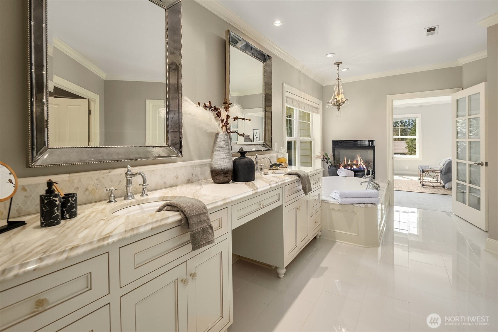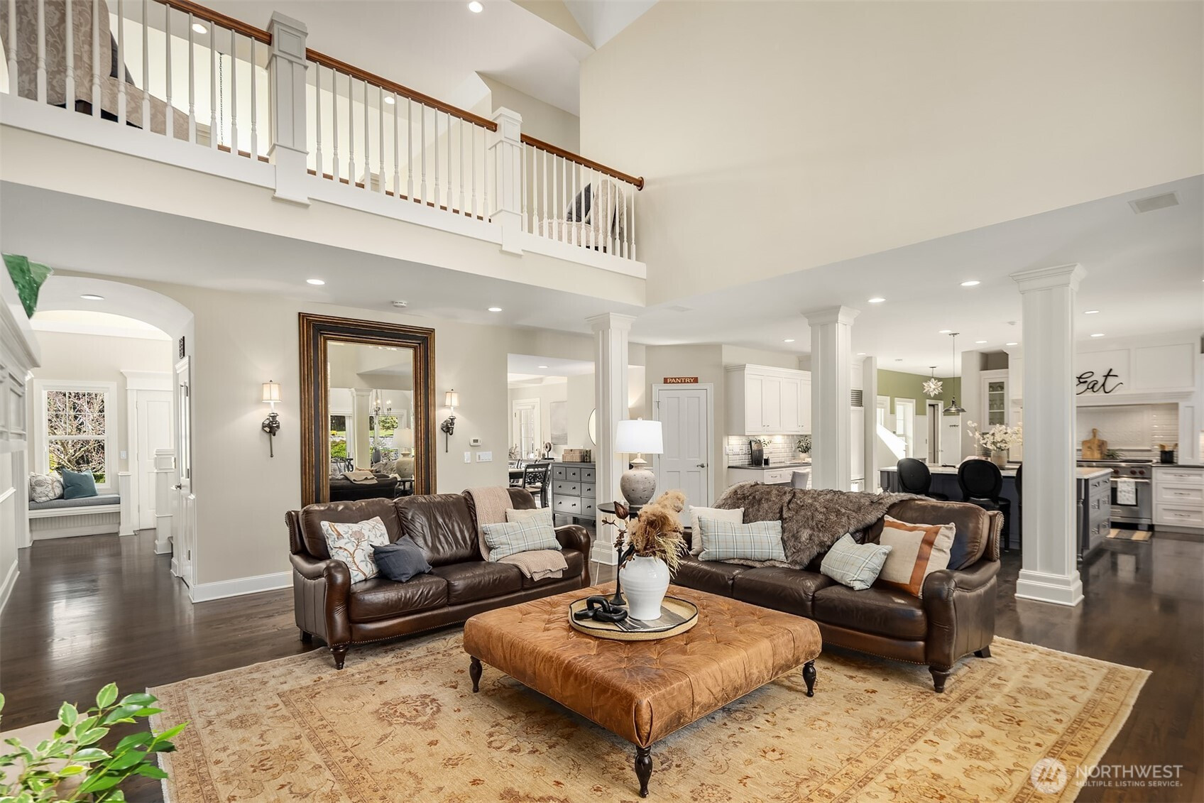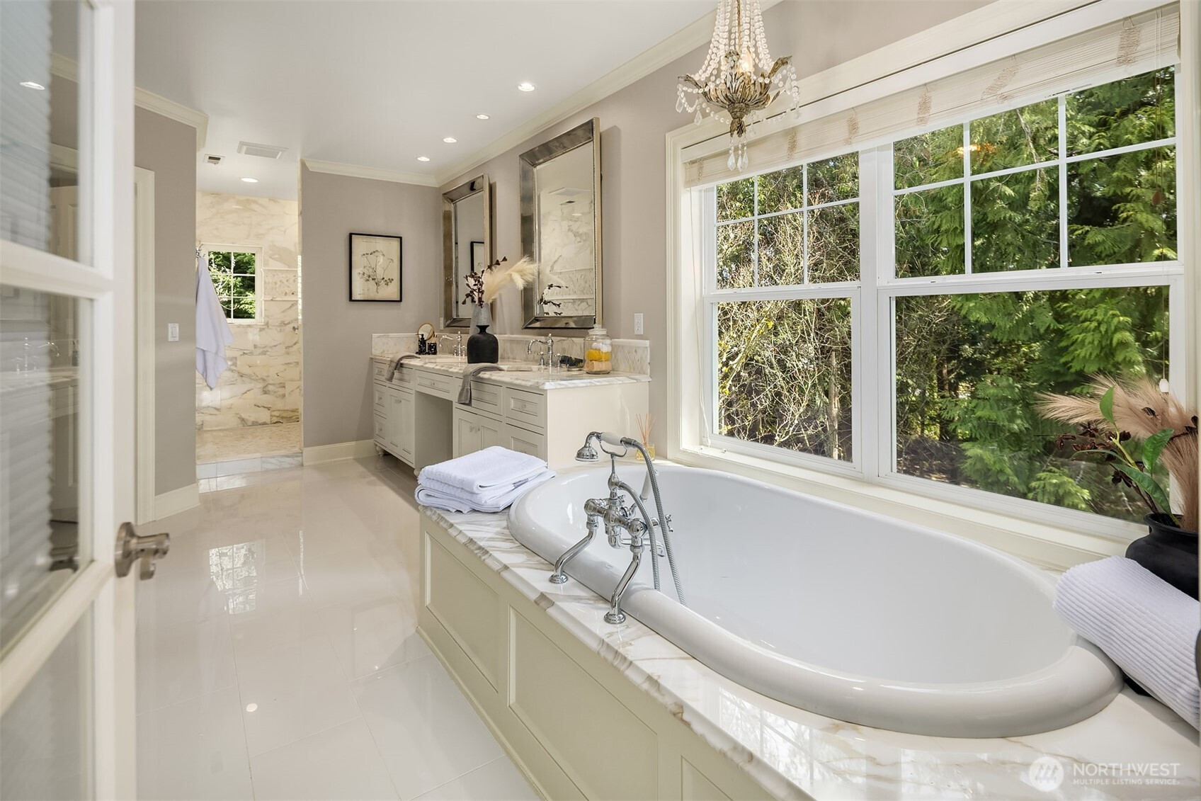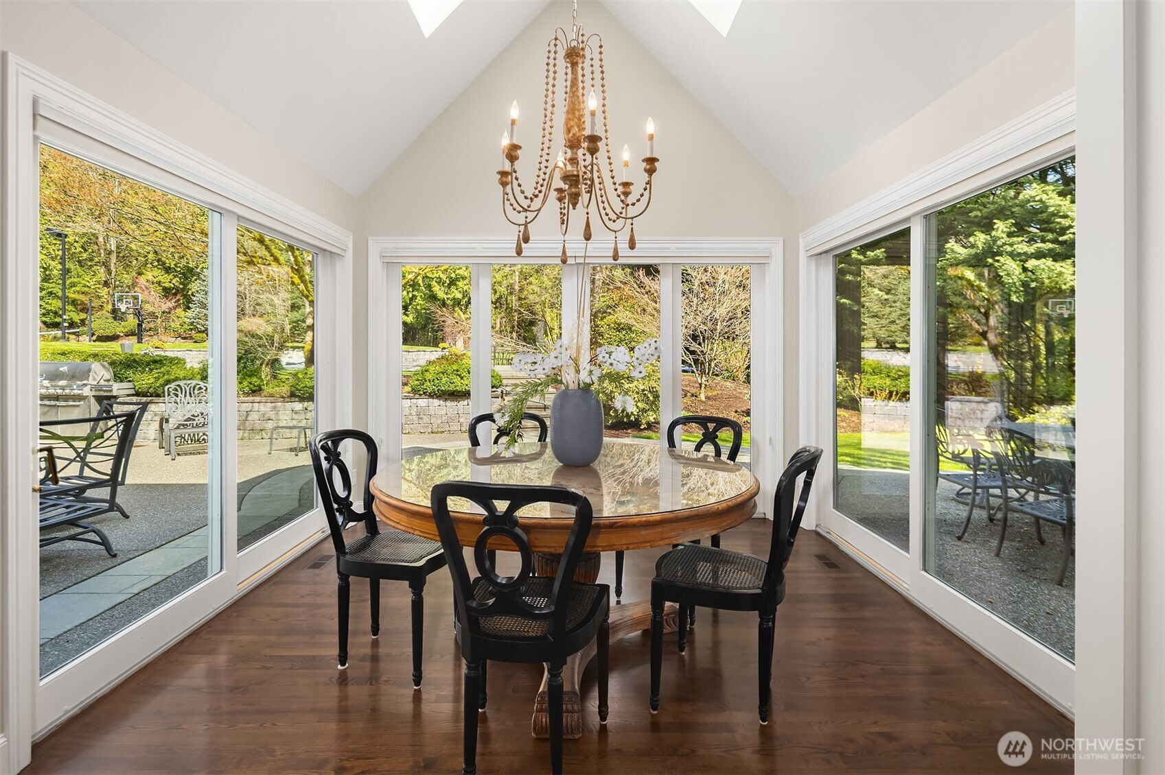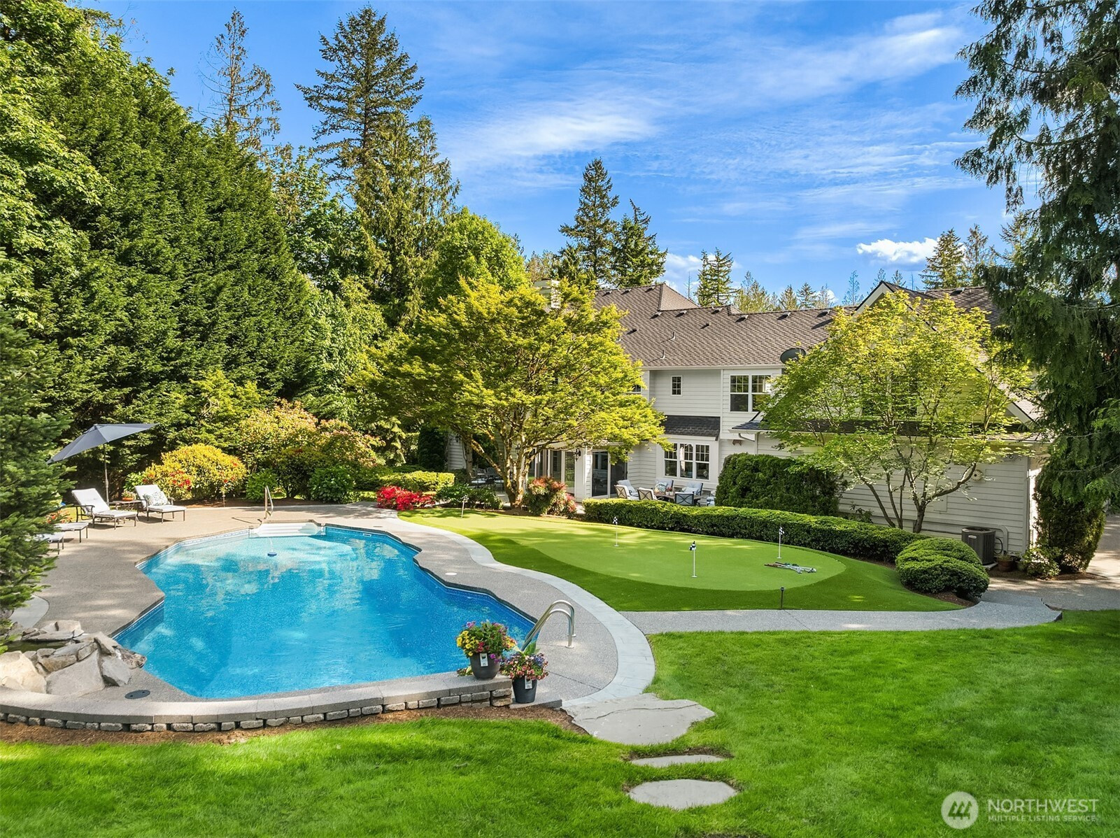 Timeless elegance awaits at Blakely Woods, set on a pristine 1.5-acre estate offering exceptional privacy and beautifully manicured grounds. This remarkable property features resort-style amenities including a sparkling in-ground pool, sport court, putting green, and expansive outdoor spaces designed for both relaxation and recreation. From the moment you enter, the home showcases impeccable craftsmanship and character. A dramatic clerestory entry welcomes you into interiors defined by rich hardwood flooring and extensive use of Calcutta Gold marble throughout. The gourmet kitchen is equipped with a premium Wolf range, an inviting eating nook, and flows seamlessly into a stunning great room highlighted by a floor-to-ceiling fireplace. The main level also includes a private den, formal living and dining rooms, a ¾ bath, and an additional powder room—perfect for both everyday living and entertaining. Upstairs, the luxurious primary suite offers a serene retreat with fireside seating, abundant natural light, and a spa-inspired five-piece marble bath with high-end finishes. Three additional bedrooms feature beautifully updated bathrooms, while a spacious recreation room and dedicated theater room provide endless opportunities for leisure and entertainment. This exceptional property truly offers something for everyone—refined living, modern comfort, and resort-like amenities all in one extraordinary home.