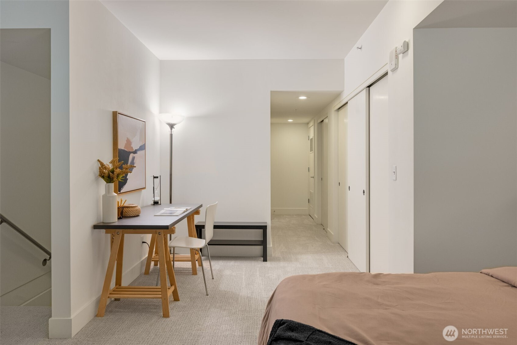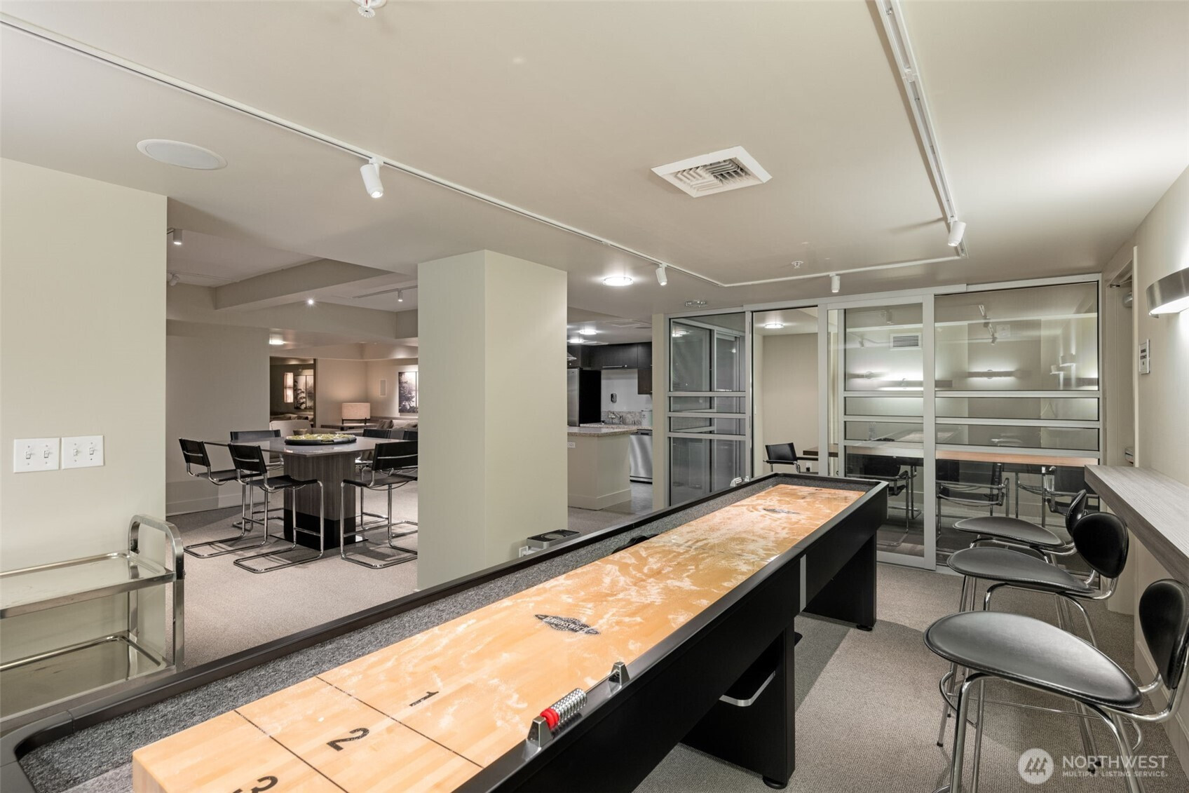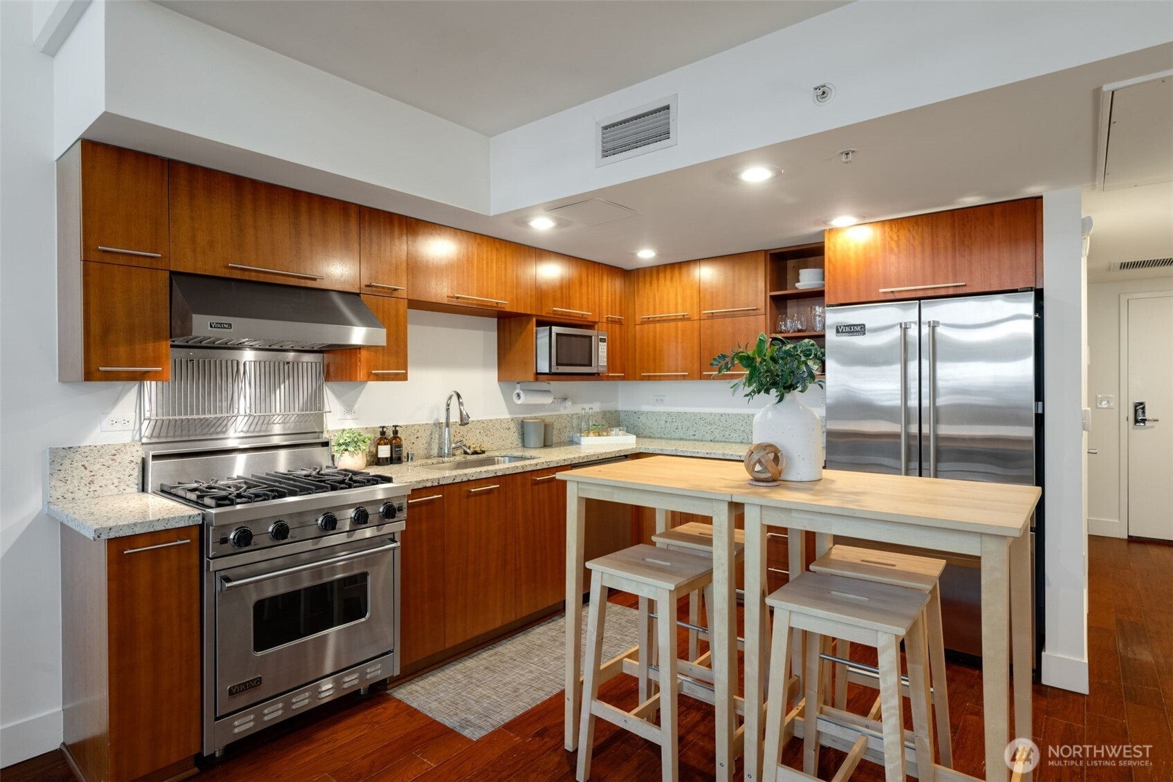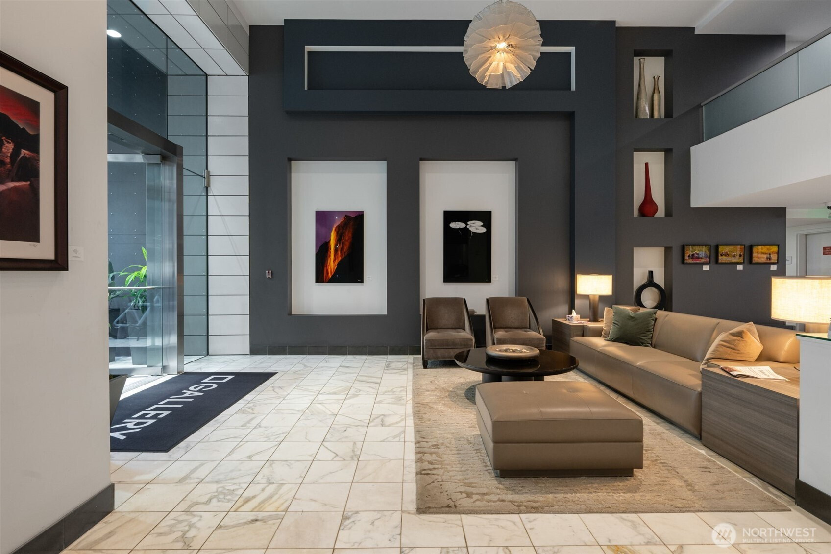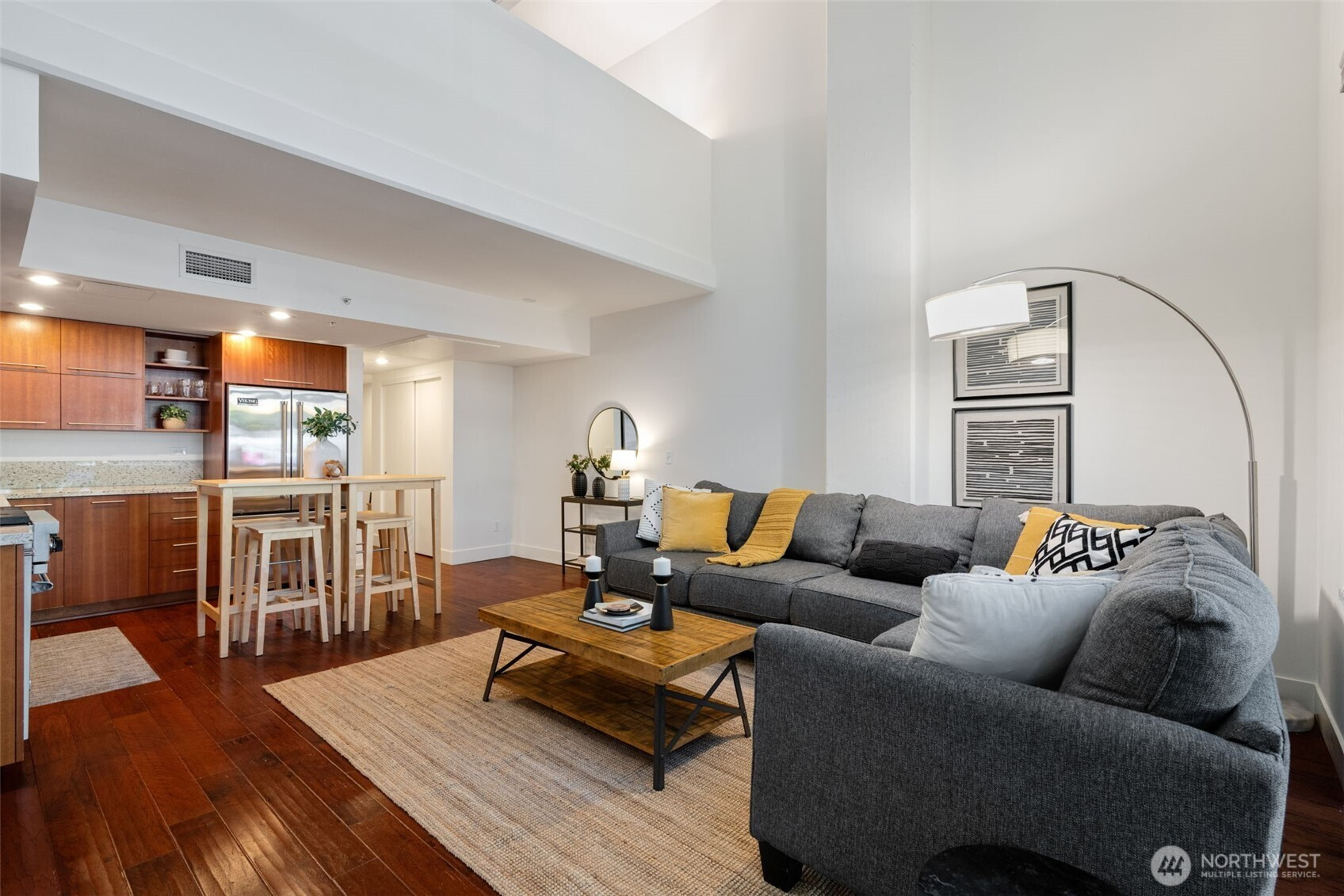 Luxury loft at Gallery Condominiums in Belltown. Only one of four Live/Work opportunities in this amenity rich community perfectly positioned near Seattle’s iconic landmarks. Convenience and quality shine with a double height window wall and two entrances into this spacious two level open living layout. Street level entry with a gated patio surrounded by lush foliage. Soaring ceiling height and a dramatic window wall show off this impeccably maintained one bedroom loft with motorized shades, hard surface flooring on the main level and A/C throughout. Large open kitchen with tons of cabinet storage, slab counters, Viking appliances and room for a prep island and eating bar are the backbone of this gracious living space. Entertain, relax, work from home, do it all in this flexible floorplan with a convenient half bath and interior entry on the main level too. Upstairs lofted bedroom has plenty of space for a king size bed and desk, double closets, w/d, and an ensuite double vanity bath. Garage parking and storage included. Gallery offers first class amenities that include 24/7 concierge, rooftop decks, owner’s lounge, fitness center, fido washing/relief zone and 2 guest suites. Ideally located near the new Waterfront Park, Sculpture Garden, Pike Place Market, Space Needle, Climate Pledge Arena; with tons of food, drink and services at your doorstep.