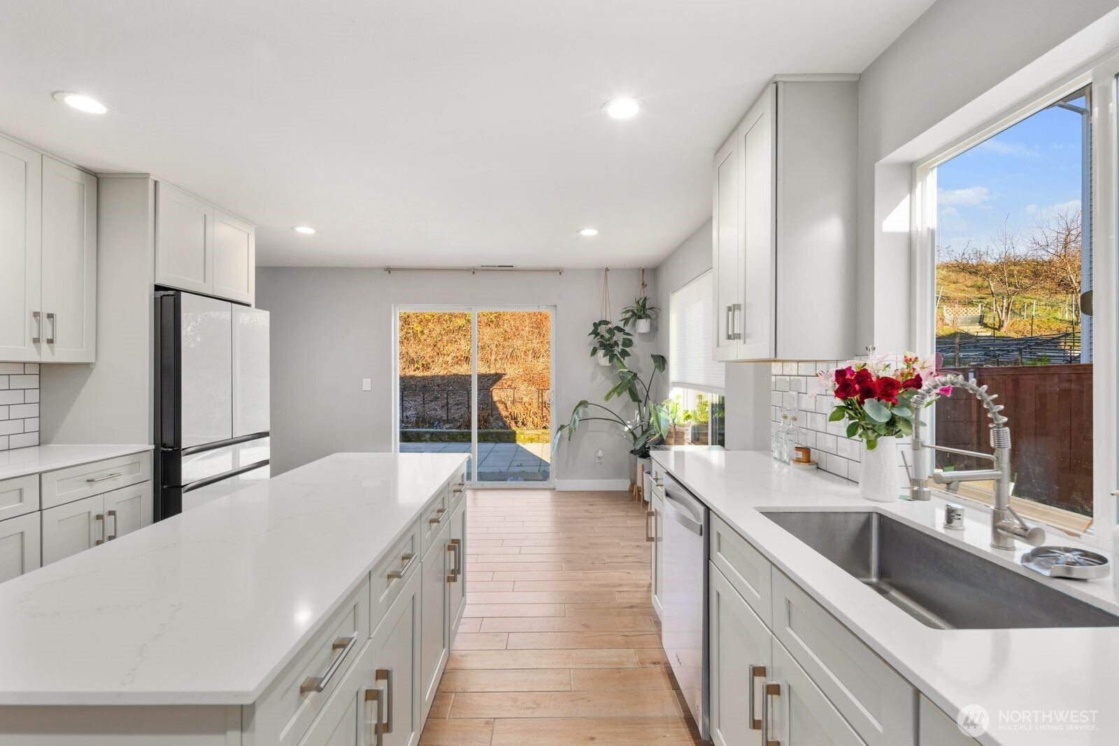 What a find in Liberty Ridge! A refreshed & renewed home awaits you with newer modern-styled island kitchen, backsplash tiling, cabinets & stainless appliances. Updated doors, trim, lighting, and fixtures throughout. You're greeted by a spacious & bright living room w/ gas fireplace, durable & stylish tile flooring, overlooking the large backyard. Expansive primary with large ensuite and walk-in closet. 2 additional bedrooms upstairs and a shared bath. Generous pantry and laundry pass through to the 3 car garage prepped for EV charging. Large greenbelt protected private backyard with room for gardening, a patio for a firepit, dog run & an added bonus: a fully powered & heated shed, great for an office-home workout. This is a gem!
