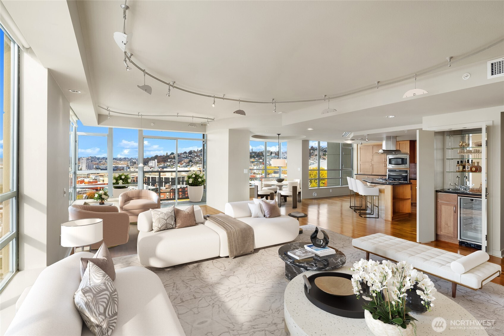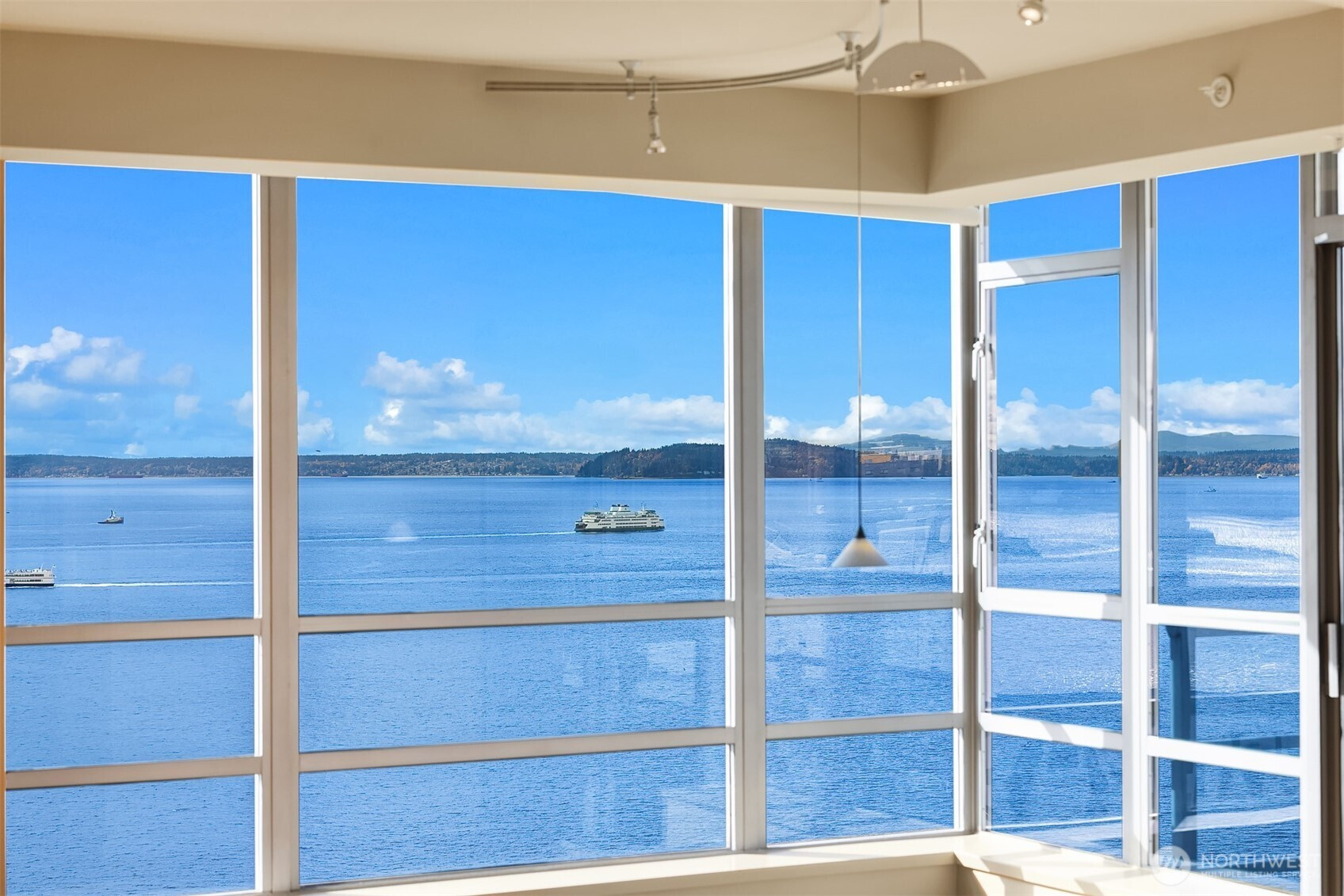 Commanding the prized NW corner, this remarkable residence impresses from the moment you arrive! Walls of glass frame jaw-dropping Puget Sound views — ferries gliding by & dramatic sunsets that light up the sky! A premier concrete-and-steel building, The Concord offers secure concierge entry, 24-hour staff, state-of-the-art fitness center, spa, sauna, guest suite, owners’ lounge & a rooftop terrace w/ sweeping views of the Sound & Space Needle. Pet-friendly, no rental cap, TWO secure parking spaces & storage. Steps to Seattle’s reimagined Waterfront — the city’s most dynamic transformation & surrounded by award-winning restaurants & culture. A front-row seat to nature's most stunning show, w/ views that inspire! Unit is virtually staged!