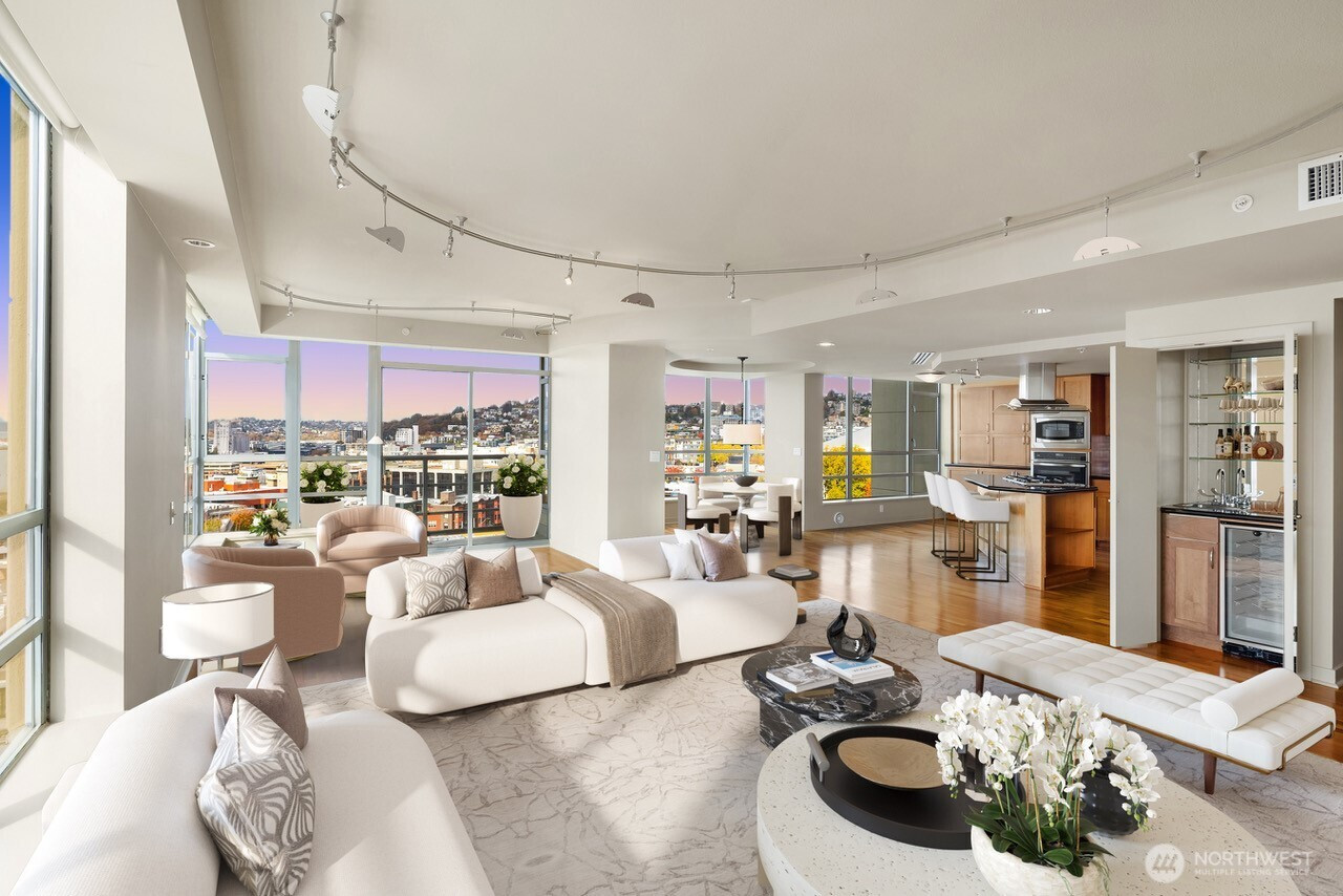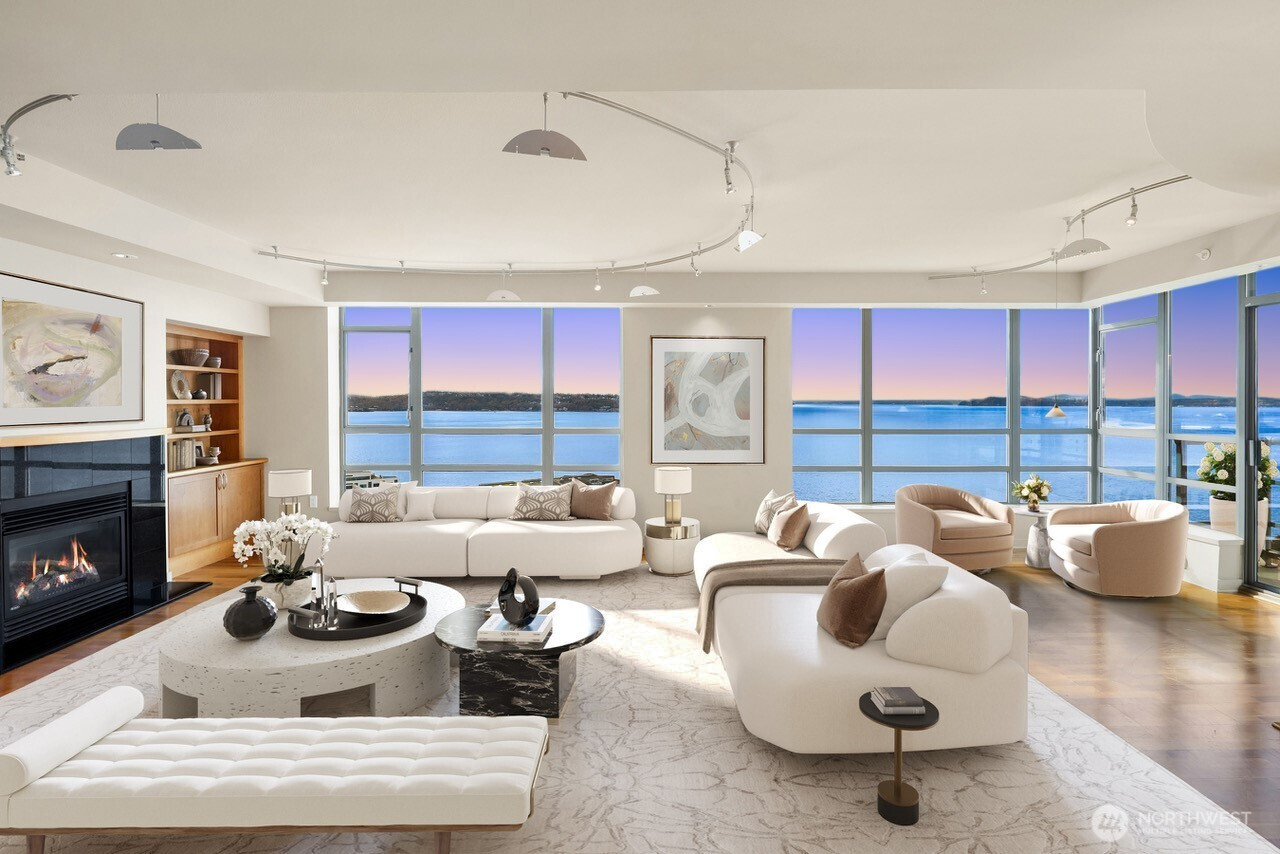 Commanding the coveted northwest corner at The Concord, this exceptional residence is oriented toward dramatic western sunsets! Evening light fills the interiors as the horizon unfolds in layered color. Constructed in concrete and steel, The Concord delivers full-service living with secure concierge entry, 24-hour staff, fitness center, spa, sauna, guest suite, owners’ lounge, and a rooftop terrace overlooking the Sound and Space Needle. Pet-friendly with no rental cap, two secure parking spaces, and dedicated storage — a refined balance of ease and flexibility. Steps to Seattle’s reimagined Waterfront and moments to the Olympic Sculpture Park and Pike Place Market, this residence is positioned at the center of art, culture, celebrated cuisine, and effortless lock-and-leave living! Defined by light, location, and lifestyle. (Virtually staged.)