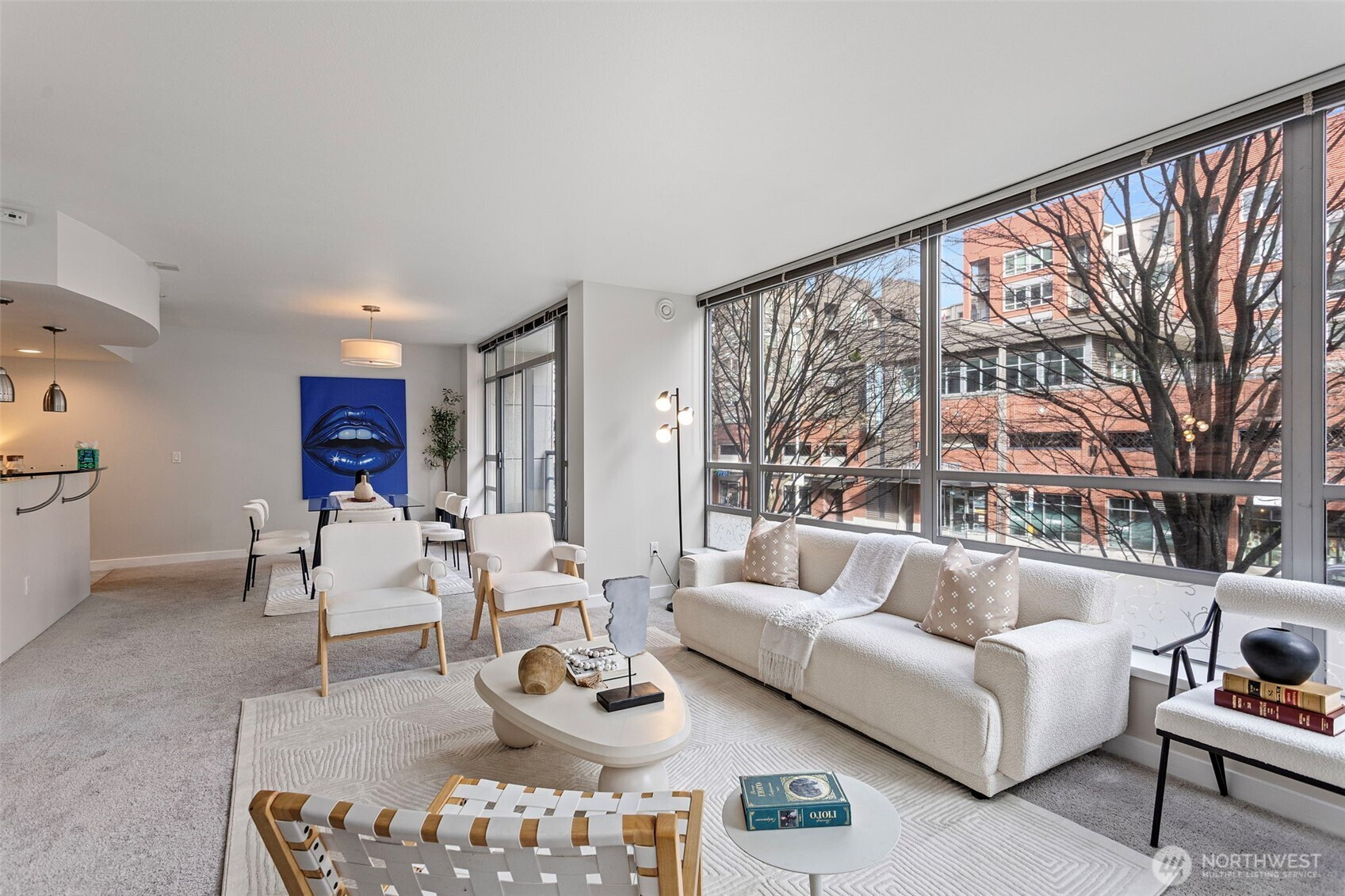 Best price for this type of Condo!! Luxurious Belltown 2 Bed 1.75 Bath Condo with Central AC and 2 patios Located In The Heart Of Downtown Seattle. The Concord offers the ultimate Seattle living experience with direct access to Seattle’s iconic destinations e.g. Seattle Center, Climate Pledge Arena, Space Needle, Olympic Sculpture Park, Pike Place Market, Lower Queen Anne, SLU & the revitalized waterfront! Enjoy living in the vibrant neighborhood of Belltown known for its urban energy, artistic community, and convenient location, making it a notable part of Seattle's landscape. Surrounded by top-tier dining, lively nightlife & an unmatched cultural scene, all just outside your front door. This modern unit has owner's suite with built-in closet system, ensuite bath, 2nd large bedroom with walk-in closet & full guest bath. Open light-filled floor plan boasts spacious living room with cozy gas fireplace & floor to ceiling windows for tons of natural light. Chef's kitchen offers gas cooking, stainless appliances, granite countertops, breakfast bar & ample cabinetry. New interior paint, smart thermostat, W/D in unit! Enjoy luxury resort-style amenities including 24/7 concierge, spa, sauna & jacuzzi, fitness room, owner's lounge, business center, rooftop deck with Puget Sound views, two expansive patios with BBQ's, & a guest suite for your visitors. No rental cap, pet friendly, 1 secure garage parking spot, 1 secure storage unit & HODs include water, sewer, garbage & gas.