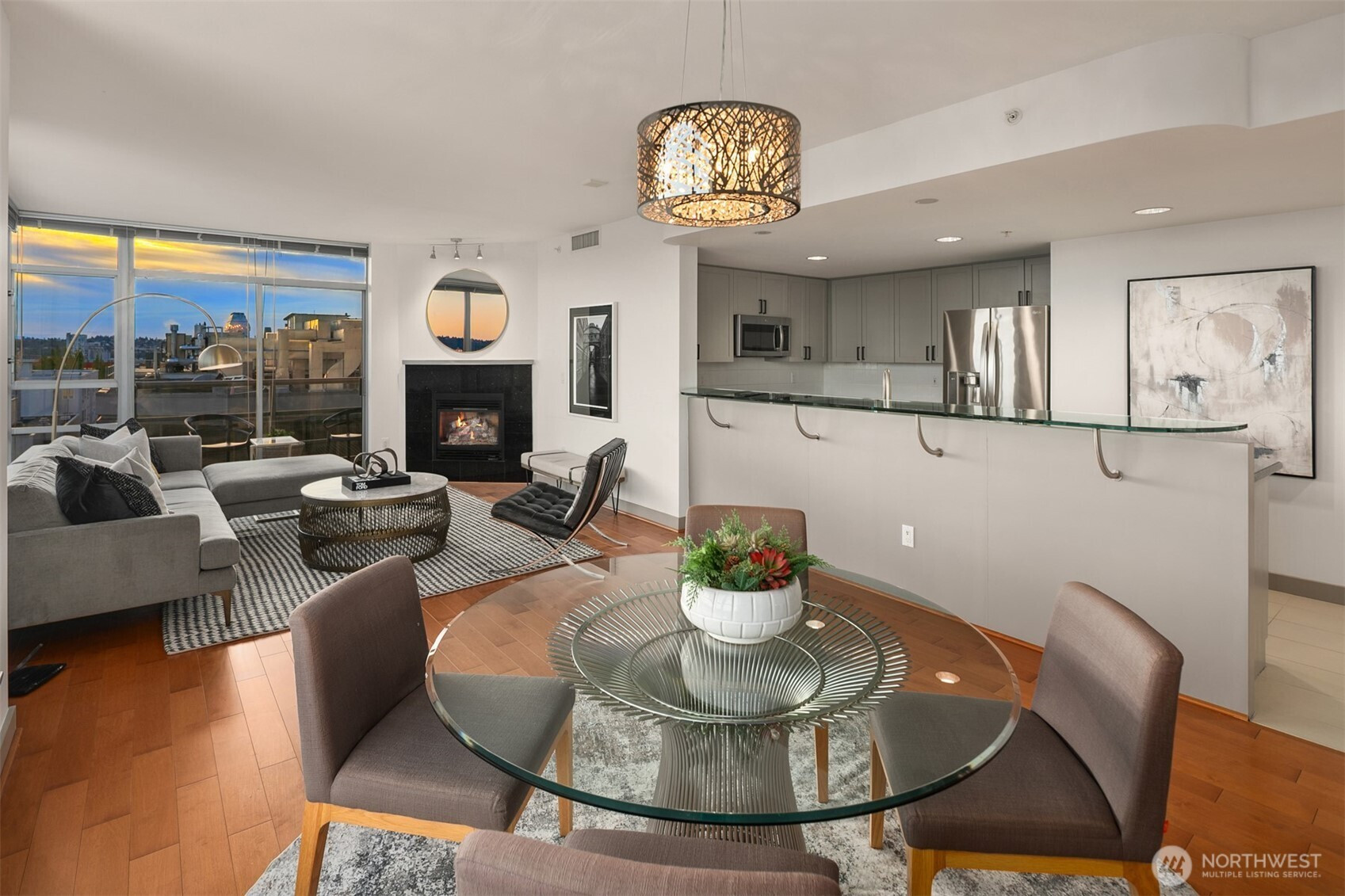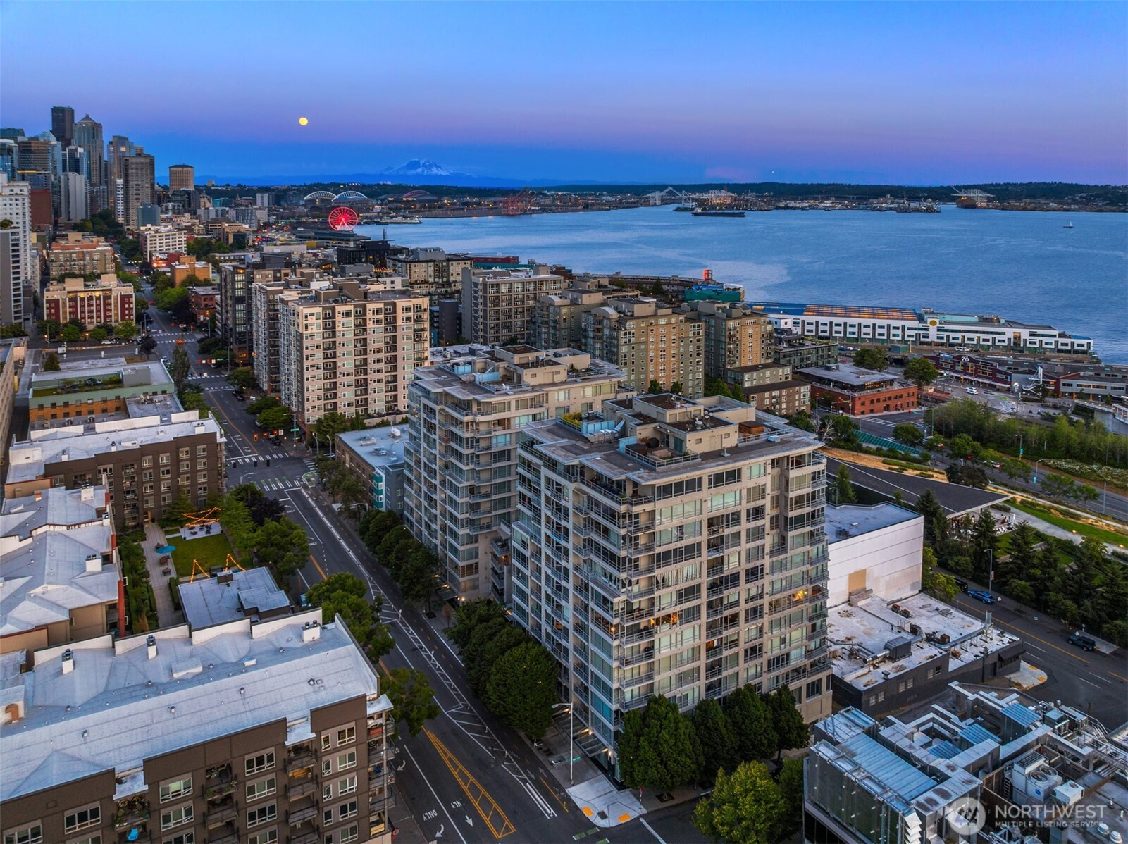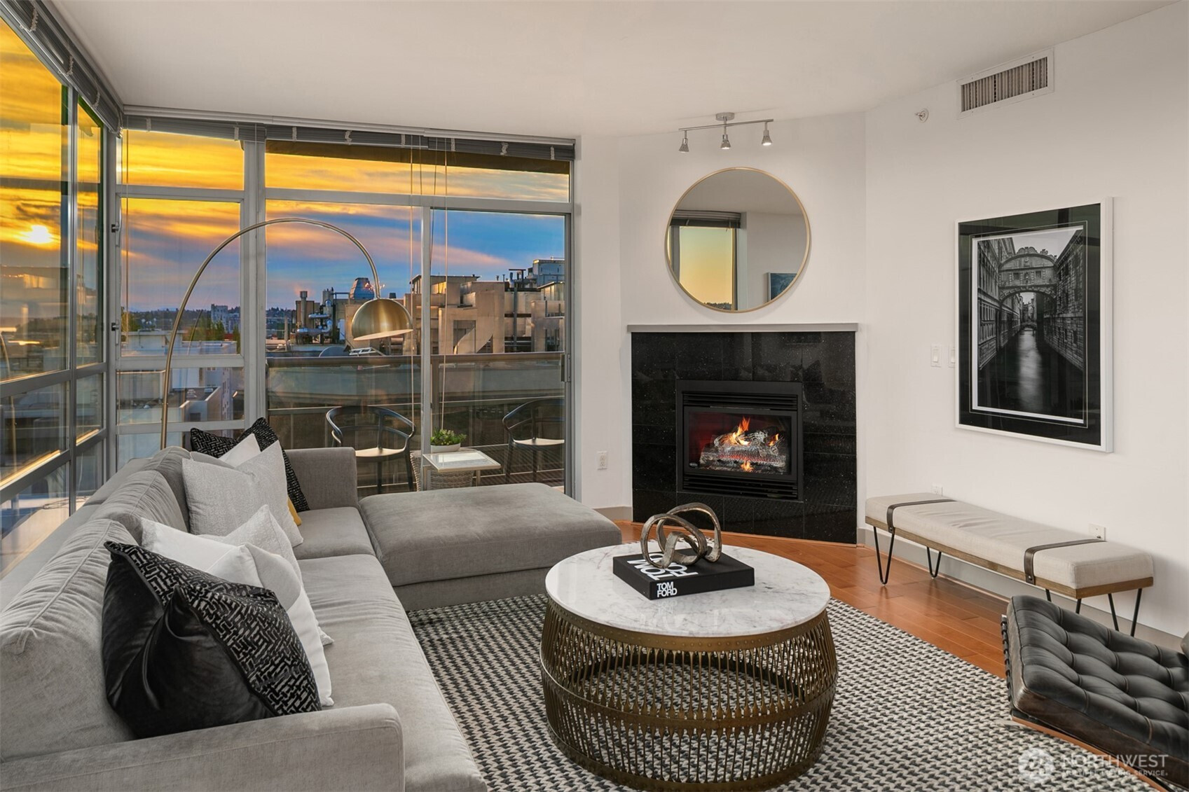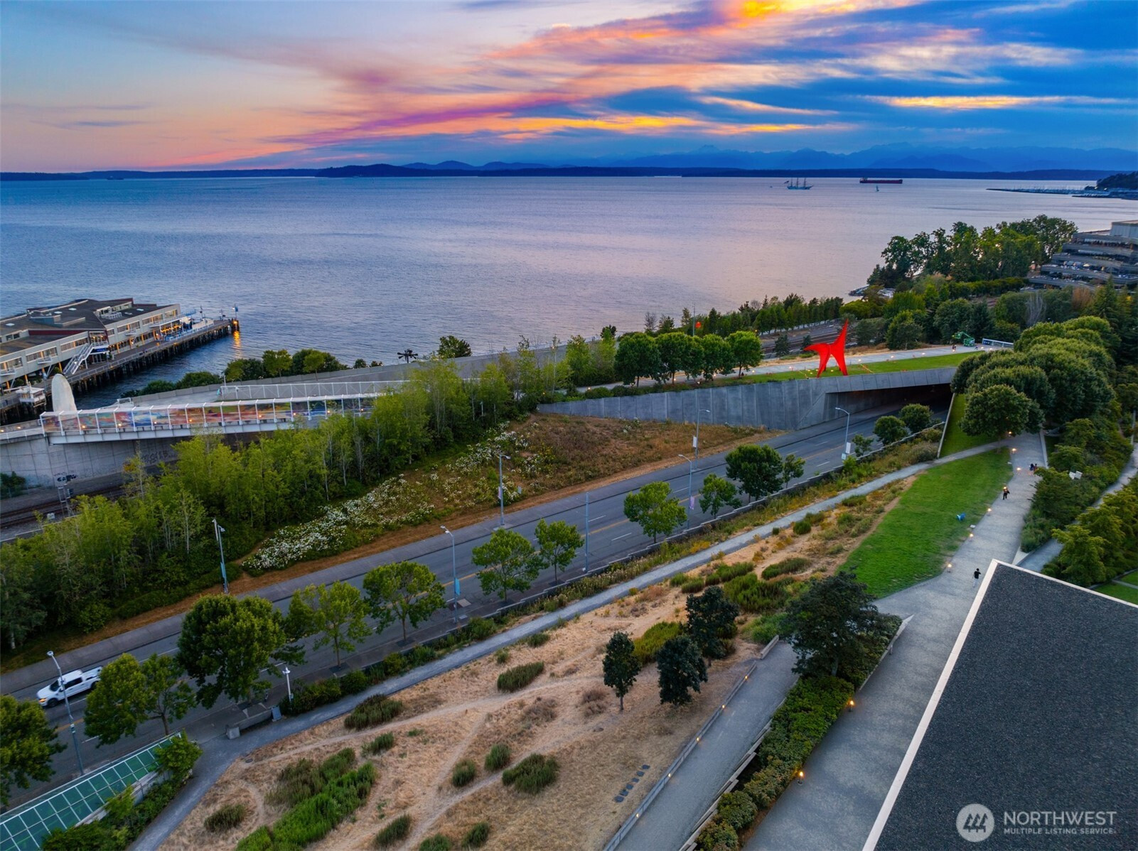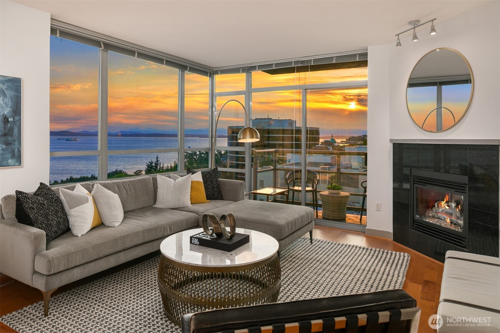Commanding panorama of Elliott Bay + Olympics highlight this sophisticated 2BR Belltown corner condo with 2 secured parking spaces. Natural light cascades thru floor-to-ceiling windows which dramatically frame views of sunsets, ferries + Sculpture Park. Open floor plan offers optimal modern living with great entertainment potential. Bright LR features distinctive FP, chic hardwoods + access to deck. Proseries stainless appliances and slab granite counters help define modern kitchen. Stunning glass breakfast bar adds style & function. Expansive vistas also found in spacious bedrooms with owner’s BR including ensuite + California closet. Elevate your lifestyle in one of city’s hippest neighborhoods with dining, parks + nightlife just outside.