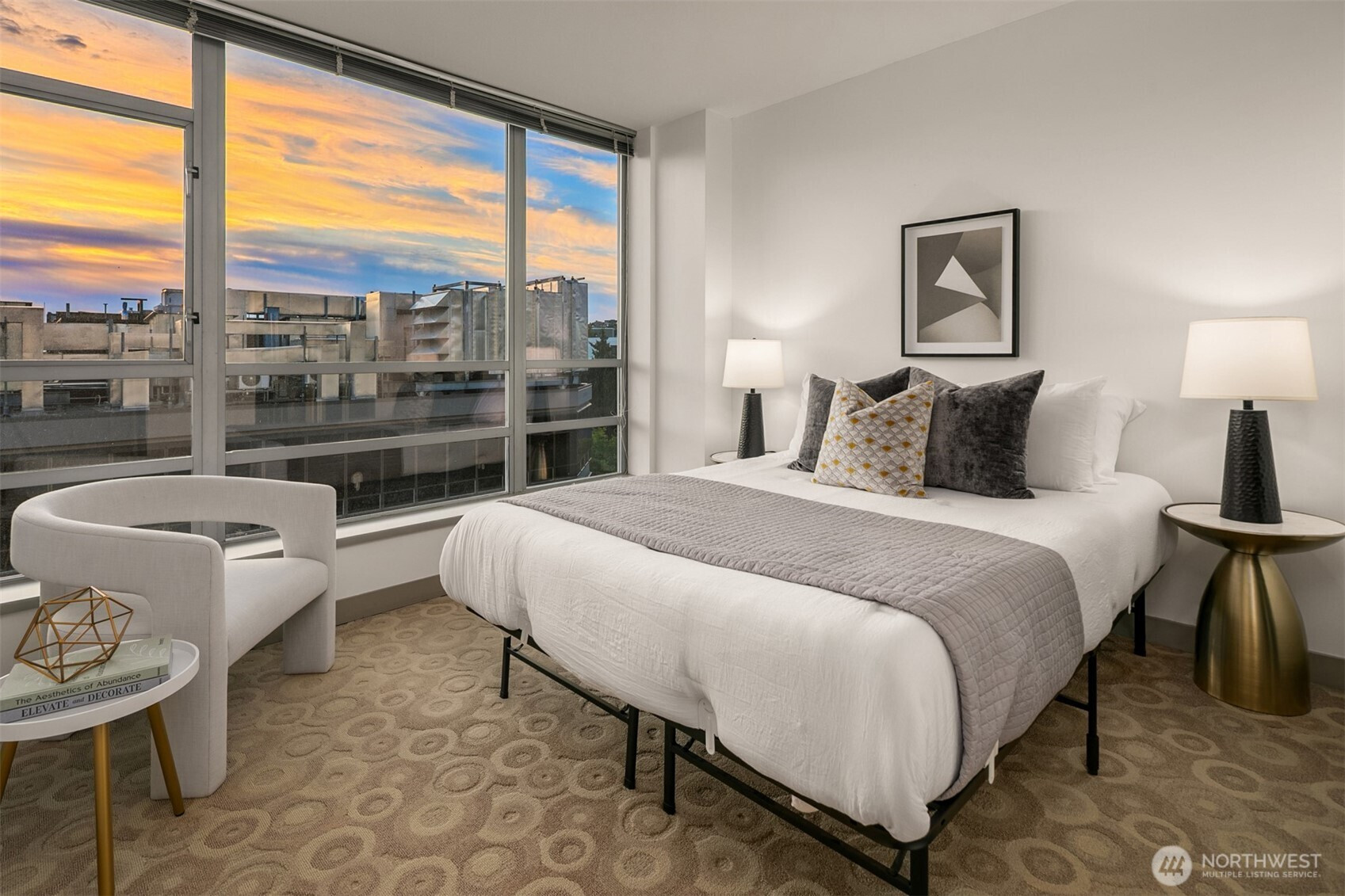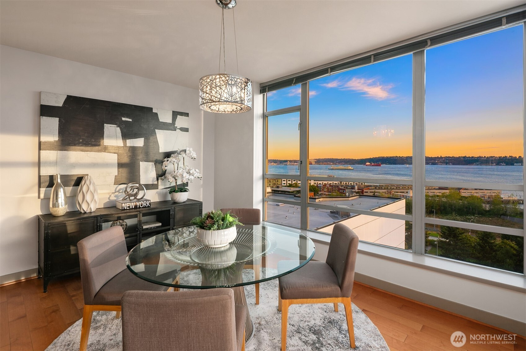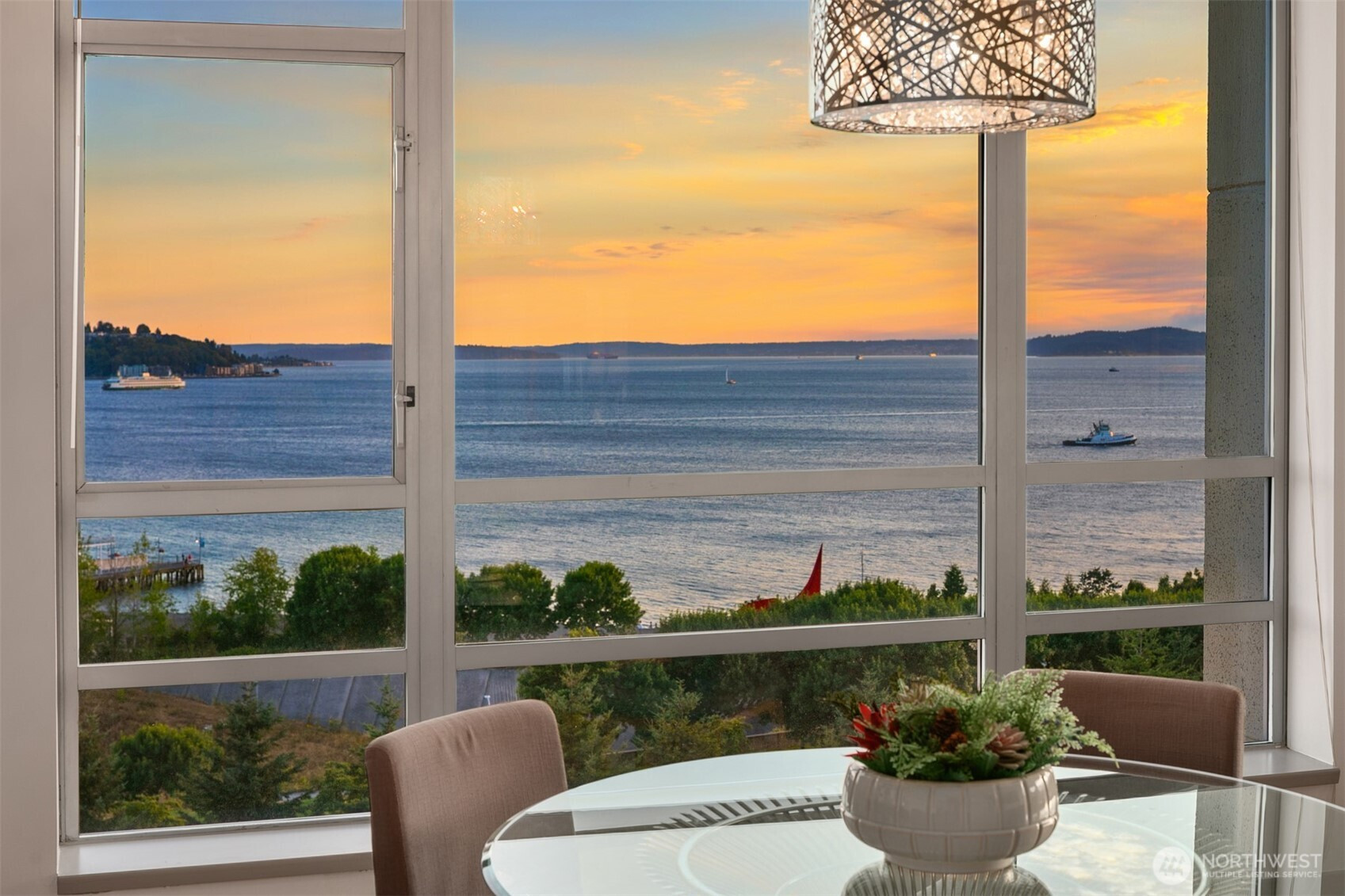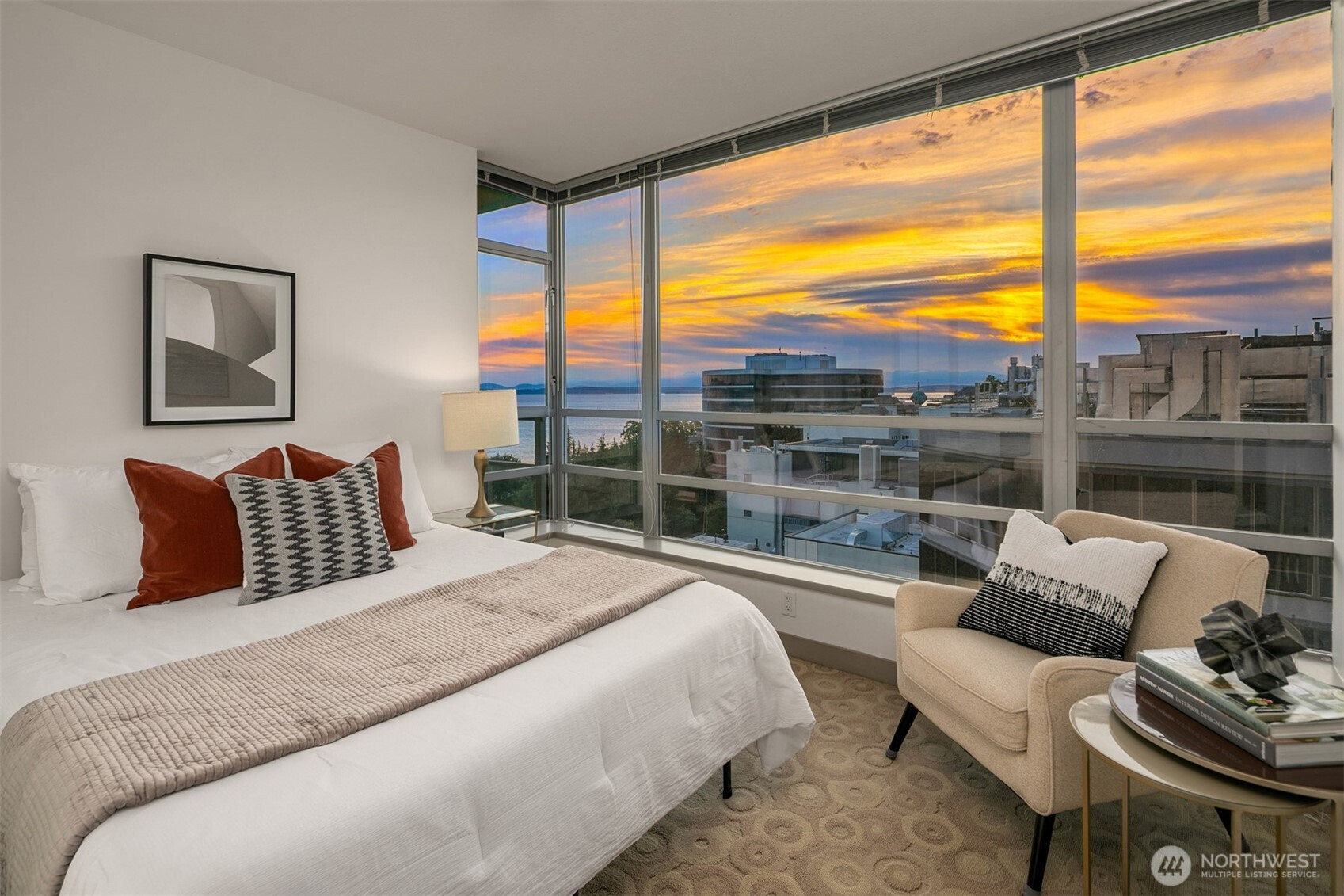Commanding panorama of Elliott Bay + Olympics highlight this sophisticated 2BR Belltown corner condo with 2 secured parking spaces. Natural light cascades thru floor-to-ceiling windows which dramatically frame views of sunsets, ferries + Sculpture Park. Open floor plan offers optimal modern living with great entertainment potential. Bright LR features distinctive FP, chic hardwoods + access to deck. Proseries stainless appliances and slab granite counters help define modern kitchen. Stunning glass breakfast bar adds style & function. Expansive vistas also found in spacious bedrooms with owner’s BR including ensuite + California closet. Elevate your lifestyle in one of city’s hippest neighborhoods with dining, parks + nightlife just outside.