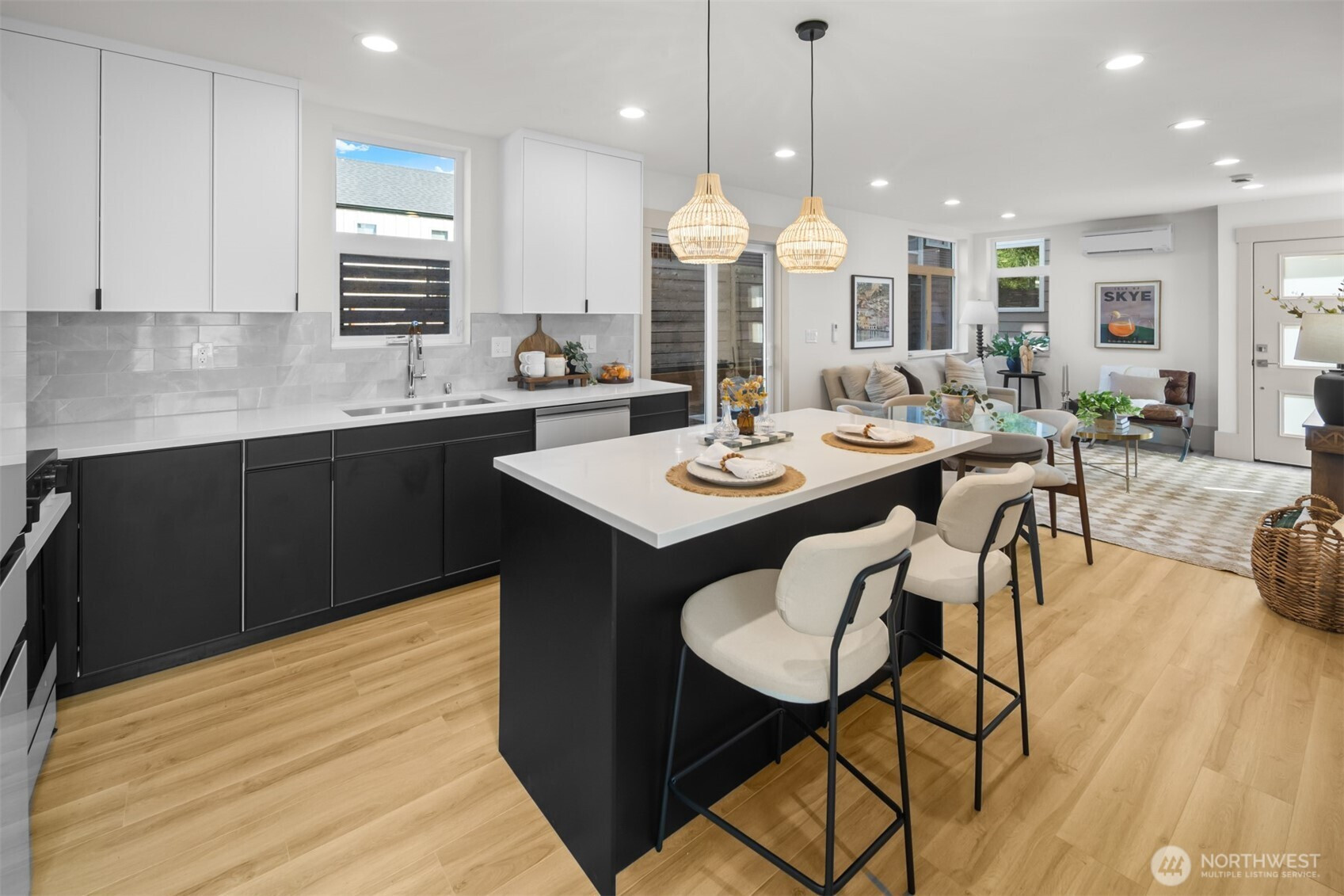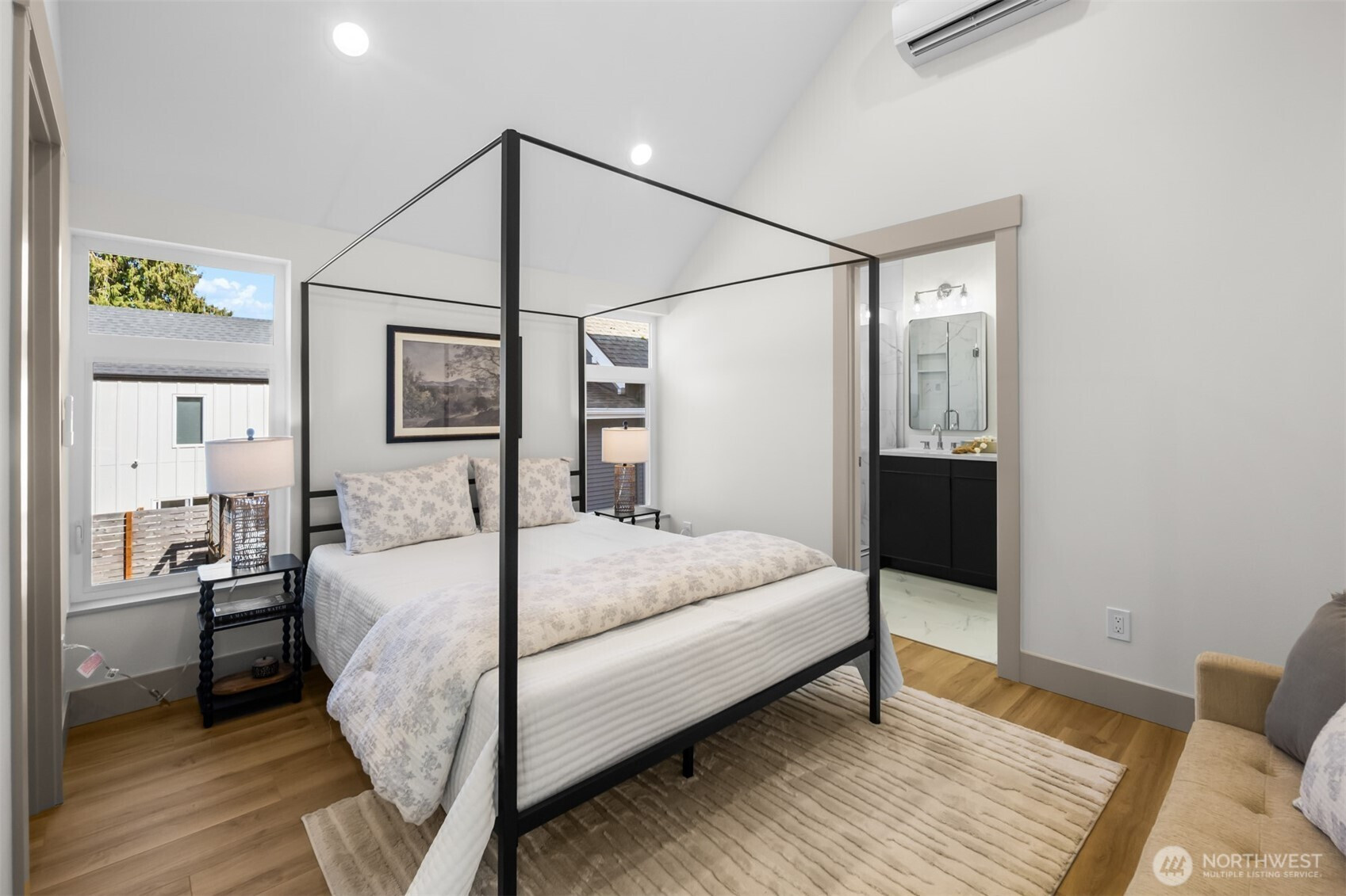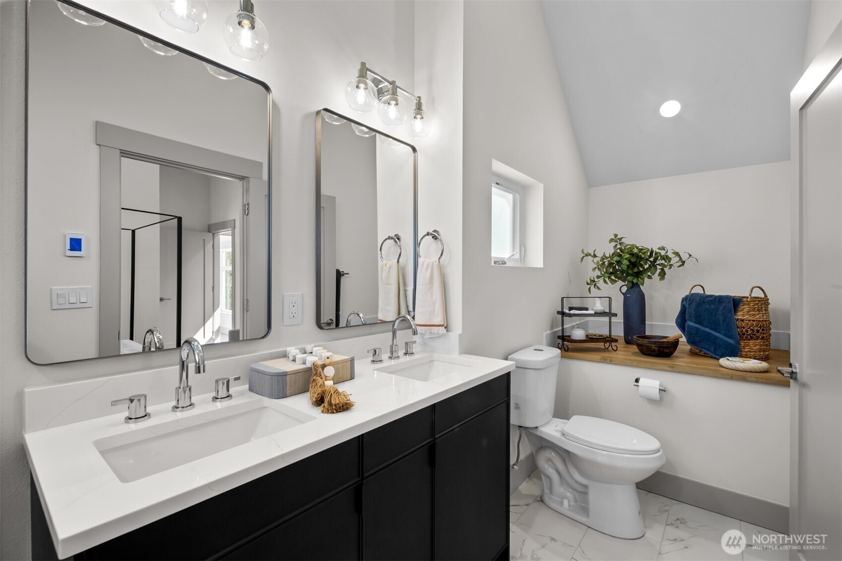 Quality construction meets intentional design in this brand-new stand-alone cottage by Accessory Dwellings, nestled in the highly desirable Belvidere neighborhood of West Seattle. The open-concept main floor delivers from the moment you walk in, with flat-panel cabinetry, a clean-lined island with quartz counters, stainless appliances, and warm luxury vinyl plank floors throughout. A powder room off the kitchen and sliding door to a private yard add seamless convenience. Upstairs, both bedrooms enjoy their own ensuite bathrooms. The primary suite features a walk-in closet and a spa-worthy bath with dual sinks, quartz counters, and a frameless glass shower. Radiant heated floors in the primary bath add a welcome touch of luxury. The spacious secondary bedroom is equally well-appointed with its own private bath. Dedicated off-street EV-ready parking completes the package. The location is a genuine West Seattle gem. Lady Jaye, Little Donkey, and the beloved Met Market are all just minutes away, with Belvedere Park offering sweeping views of the Seattle skyline and Elliott Bay, and Alki Beach just down the hill. This is West Seattle living at its best.