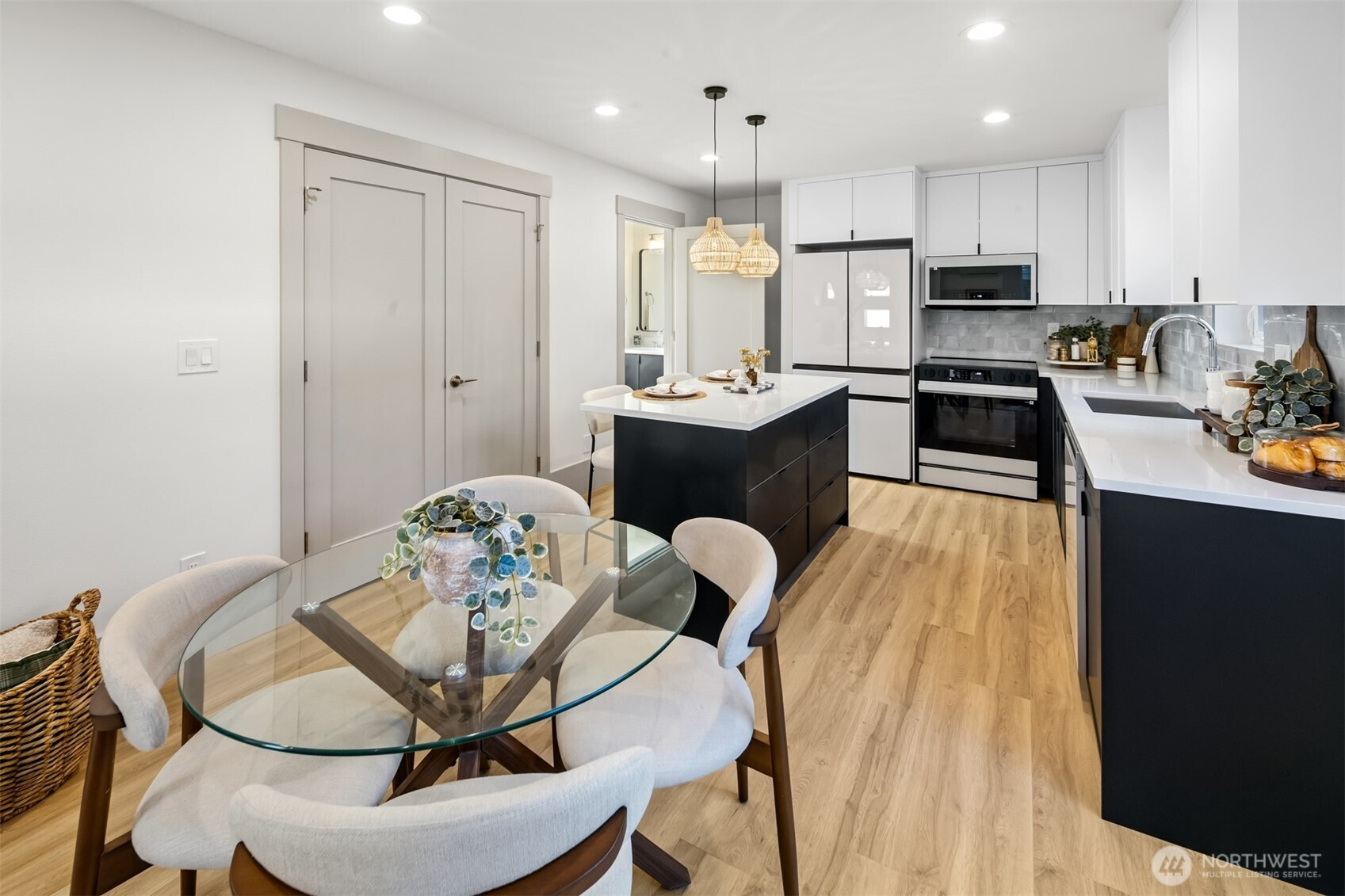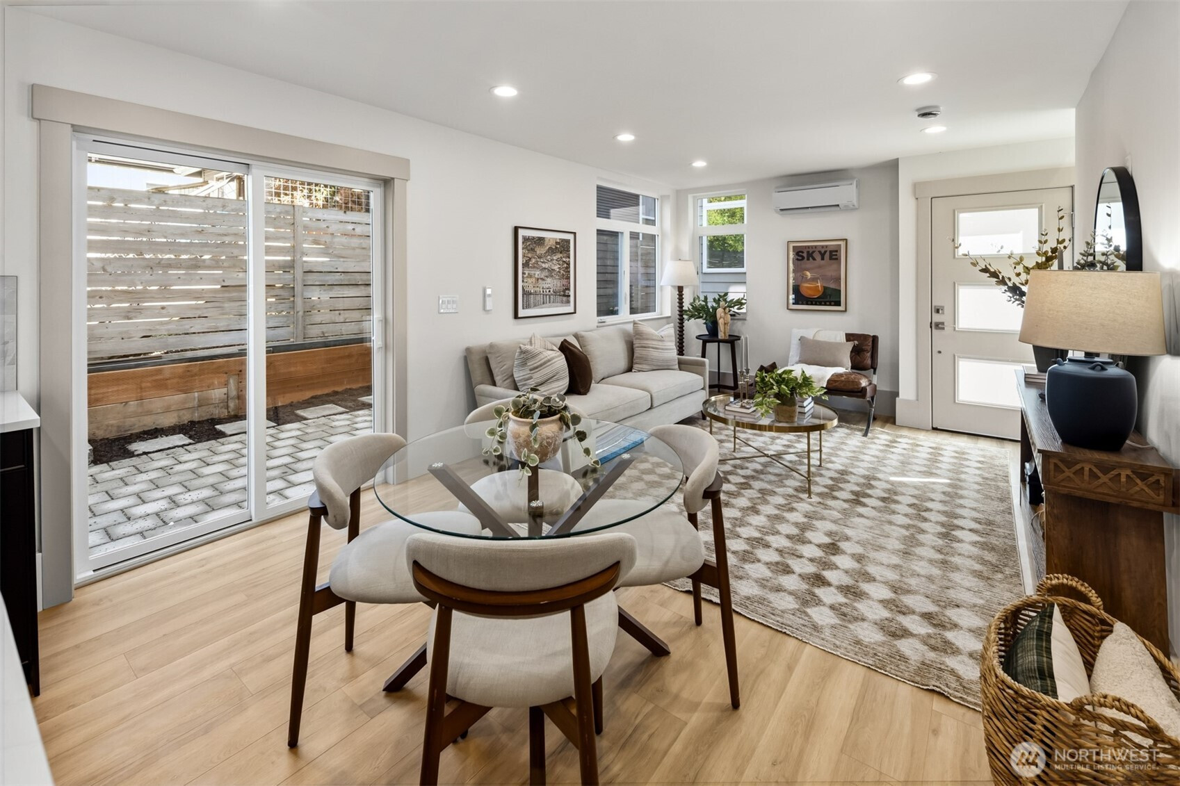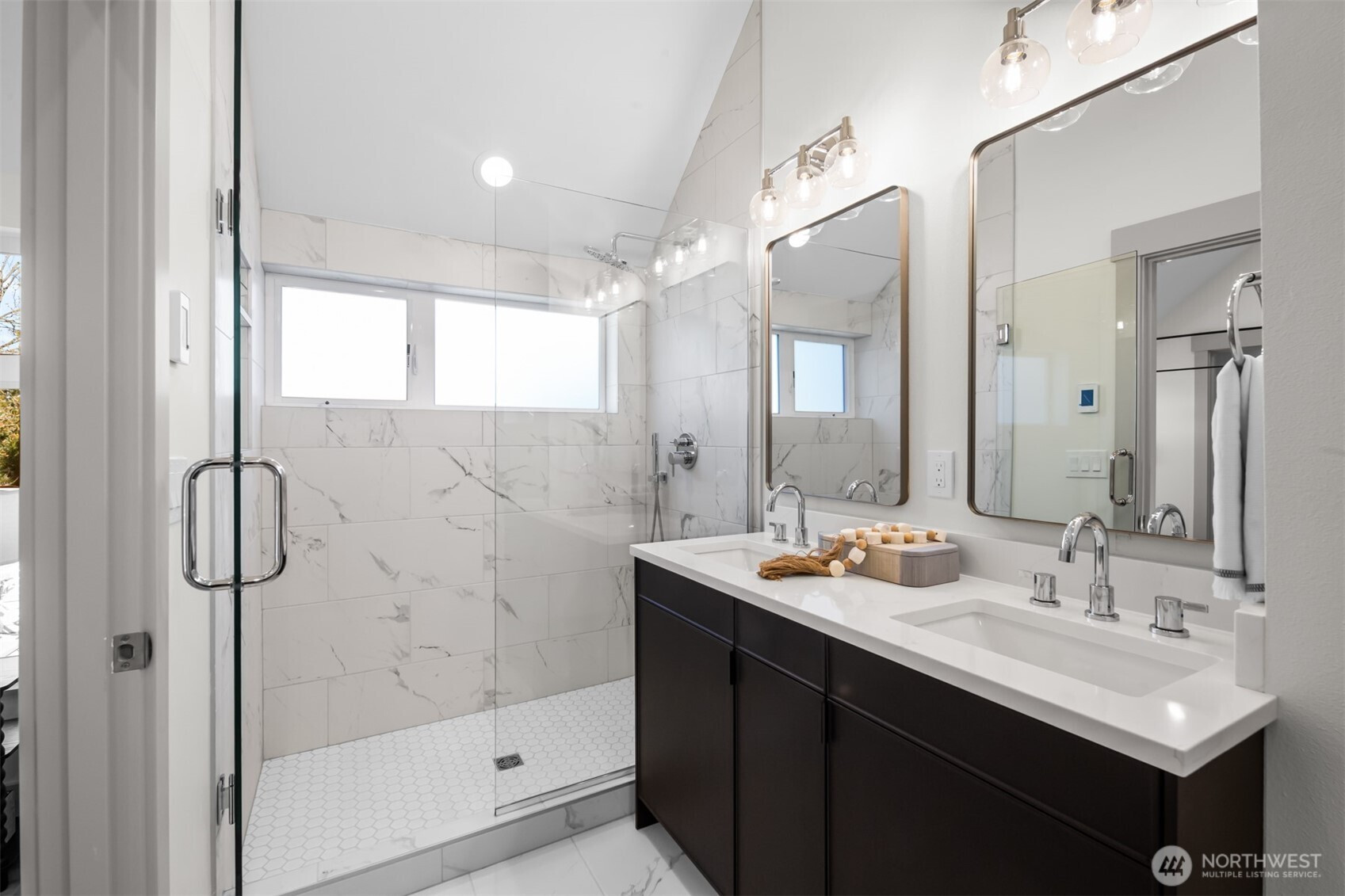 Quality construction meets intentional design in this brand-new stand-alone cottage by Accessory Dwellings, nestled in the highly desirable Belvidere neighborhood of West Seattle. The open-concept main floor delivers from the moment you walk in, with flat-panel cabinetry, a clean-lined island with quartz counters, stainless appliances, and warm luxury vinyl plank floors throughout. A powder room off the kitchen and sliding door to a private yard add seamless convenience. Upstairs, both bedrooms enjoy their own ensuite bathrooms. The primary suite features a walk-in closet and a spa-worthy bath with dual sinks, quartz counters, and a frameless glass shower. Radiant heated floors in the primary bath add a welcome touch of luxury. The spacious secondary bedroom is equally well-appointed with its own private bath. Dedicated off-street EV-ready parking completes the package. The location is a genuine West Seattle gem. Lady Jaye, Little Donkey, and the beloved Met Market are all just minutes away, with Belvedere Park offering sweeping views of the Seattle skyline and Elliott Bay, and Alki Beach just down the hill. This is West Seattle living at its best.