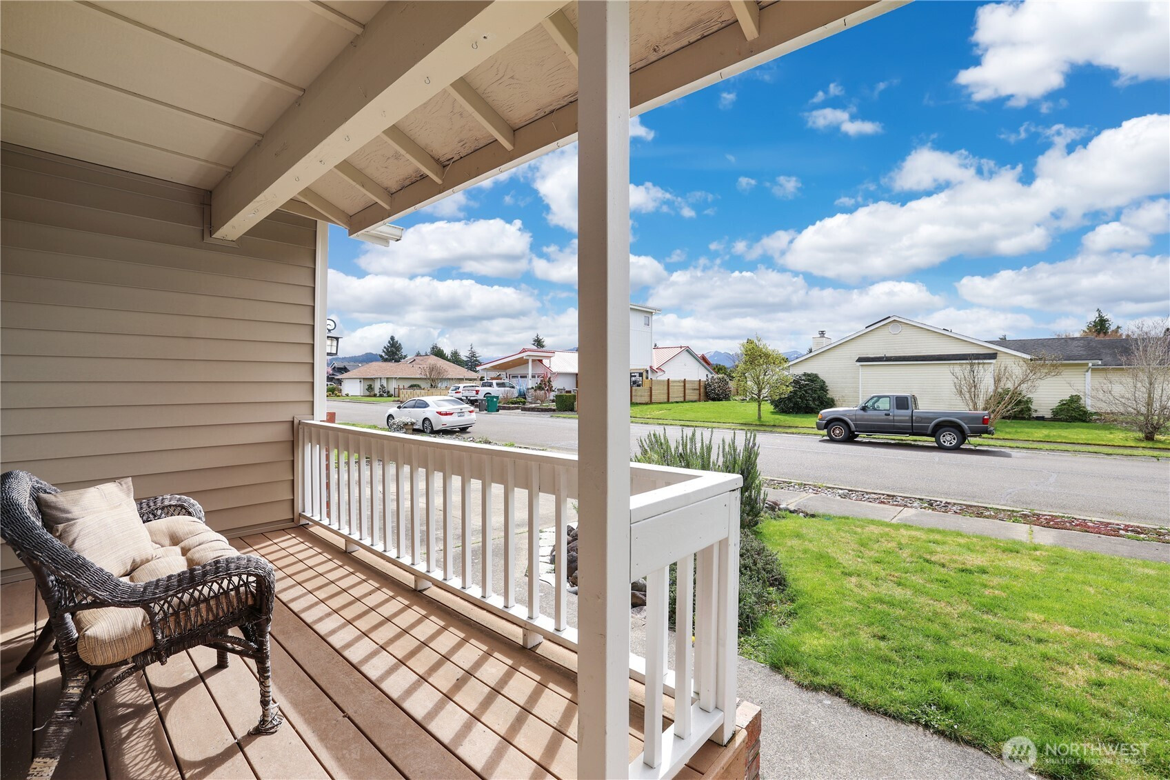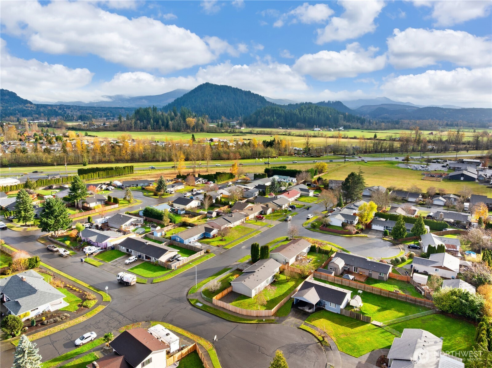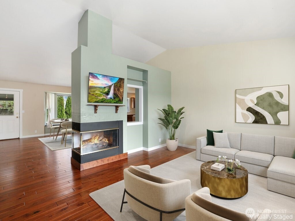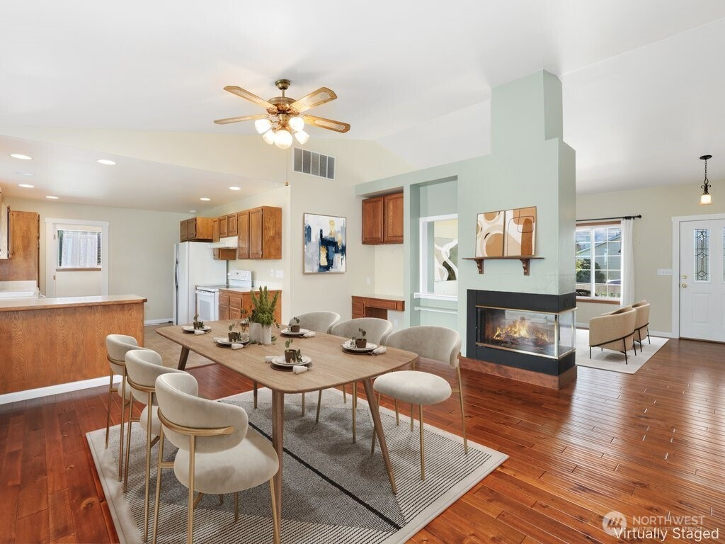 Enjoy Mt. Rainier views from this beautifully maintained, move-in ready 3-bedroom, 1.75-bath rambler home in desirable Berilla Estates. This light-filled residence features an open-concept kitchen and living area with vaulted ceilings and rich hardwood floors, creating an inviting and spacious atmosphere. The vaulted living and dining rooms are anchored by a shared see-thru gas fireplace insert, perfect for cozy gatherings and seamless entertaining. The well-appointed kitchen flows effortlessly into the main living space. The private primary suite offers a relaxing retreat with its own bath and a full wall of closets for ample storage. Two additional bedrooms provide flexibility for guests, work, or hobbies. Step outside to a large side yard with garden space and room for potential RV parking. The covered front porch with durable Trex-style decking adds charm and a welcoming outdoor space to enjoy year-round. Complete with a 2-car garage and located in a peaceful Enumclaw setting!