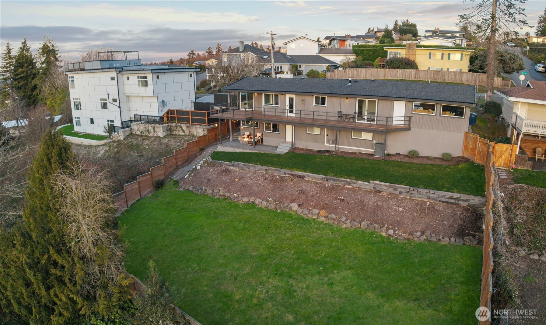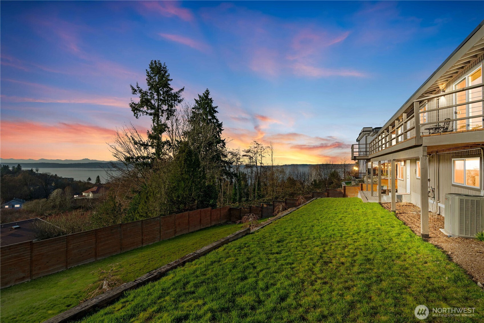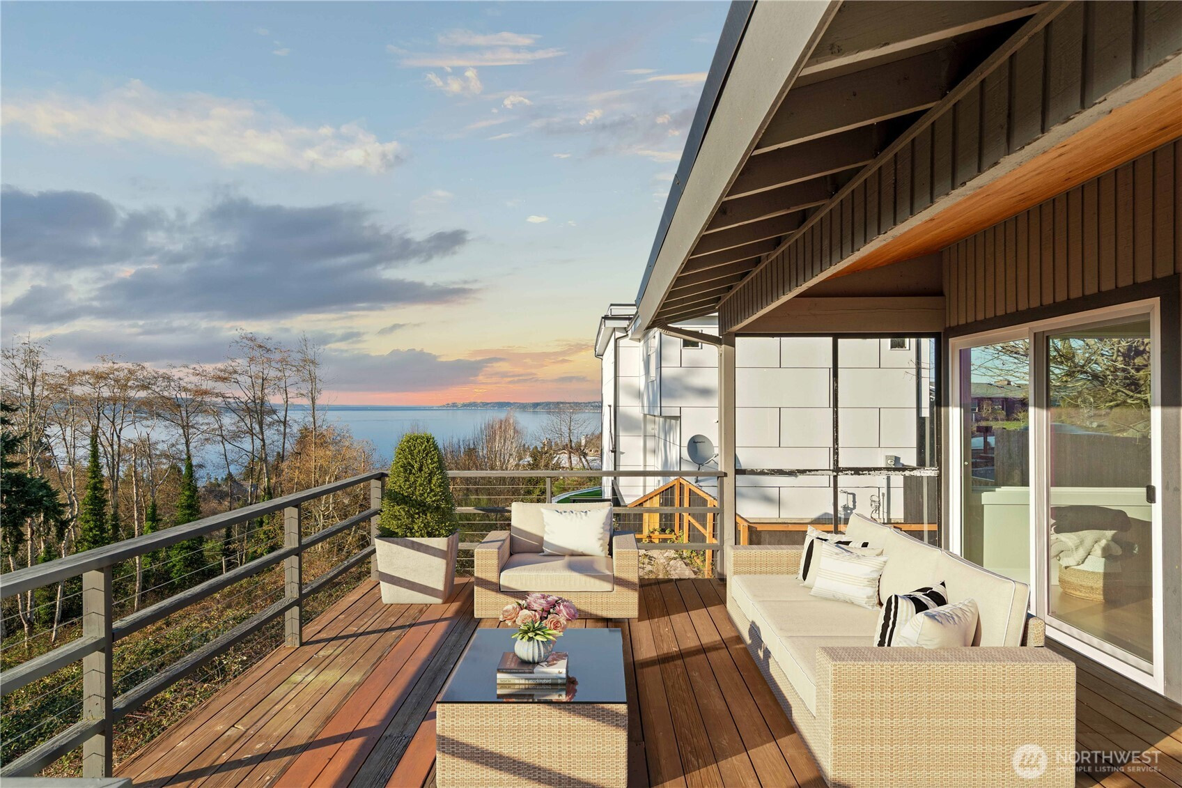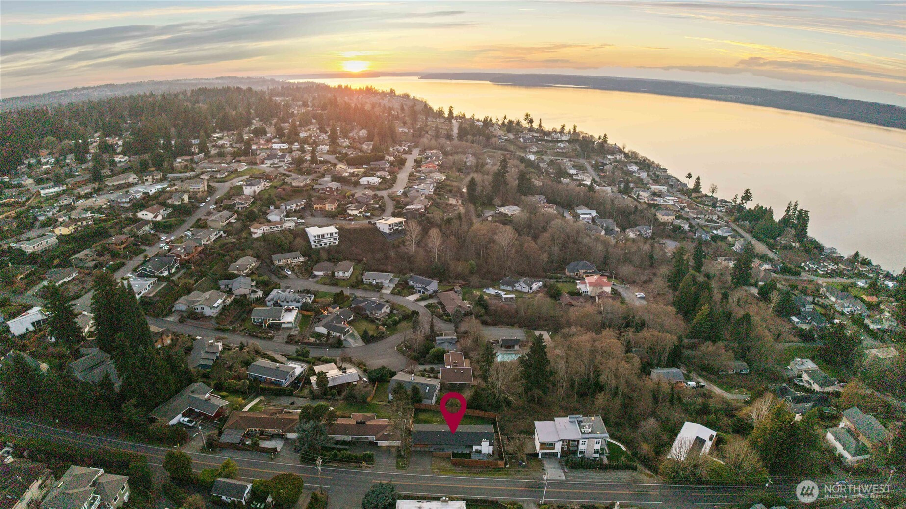 Welcome to this exceptional contemporary Mid-Century Modern home showcasing panoramic Puget Sound views and breathtaking Pacific Northwest sunsets. Clean architectural lines, expansive windows, and refined curb appeal define this luxury coastal retreat. Inside, light-filled living spaces create seamless indoor-outdoor flow ideal for modern living and entertaining. The chef’s kitchen features quartz countertops, custom cabinetry, designer tile backsplash, and an oversized island with abundant storage, blending function and sophistication. The adjacent dining area offers a built-in buffet, creating an elegant setting for intimate gatherings and holiday celebrations. The main-level primary suite is a private sanctuary with a spa-inspired bath, soaking tub, walk-in shower, and dual vanities. New gas fireplace inserts add warmth and ambiance throughout the home. The lower level offers a second primary suite with walk-in closet and an updated bath with designer tile and dual sinks, along with a spacious great room and convenient kitchenette perfect for guests, multi-generational living, or a media lounge. The fully remodeled backyard features a paver patio, custom gas fireplace, new lighting, and fresh landscaping. Layered outdoor living spaces capture stunning Sound views. Just minutes to Redondo Beach and the boardwalk, this is Pacific Northwest luxury living at its finest.