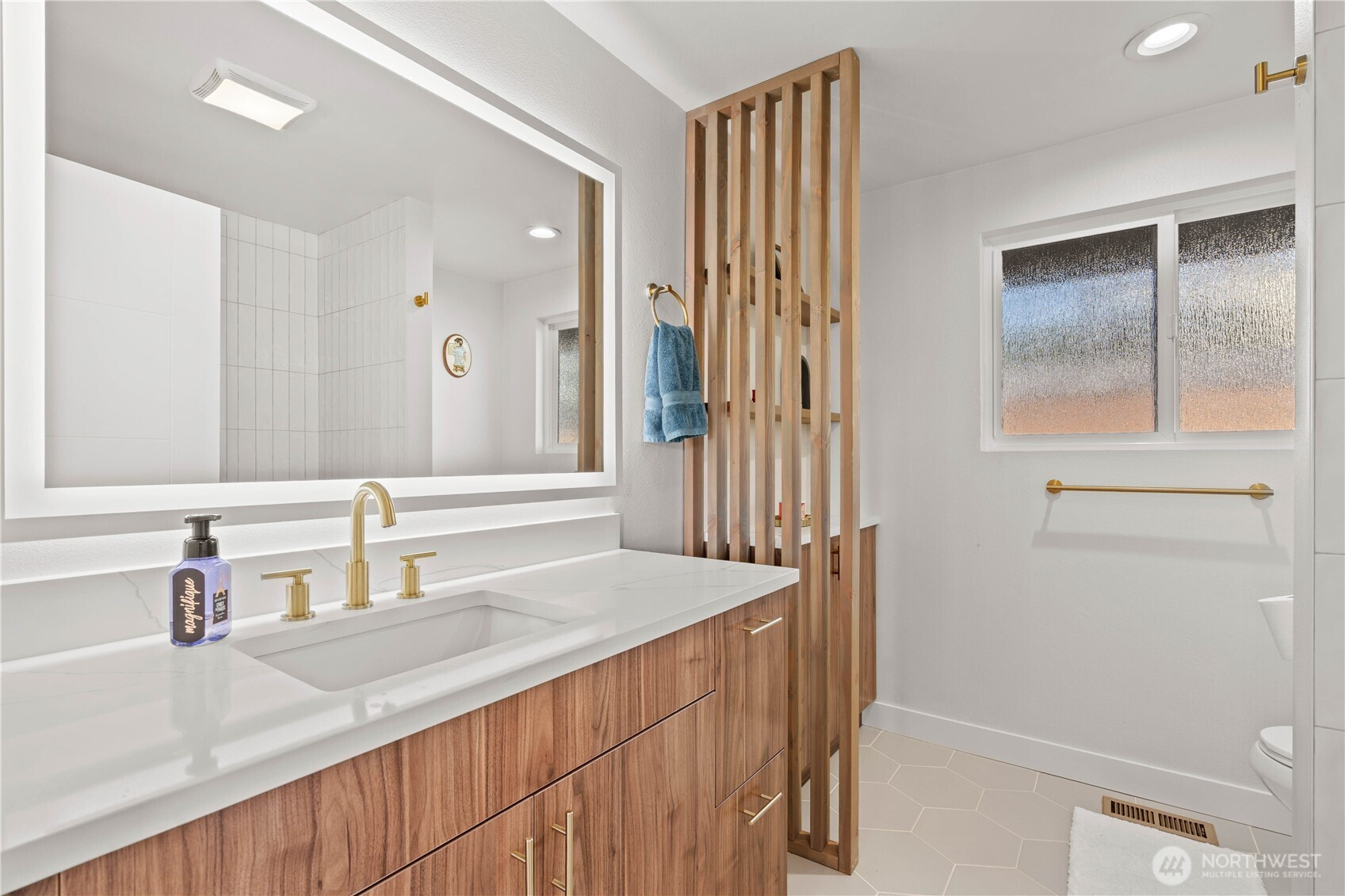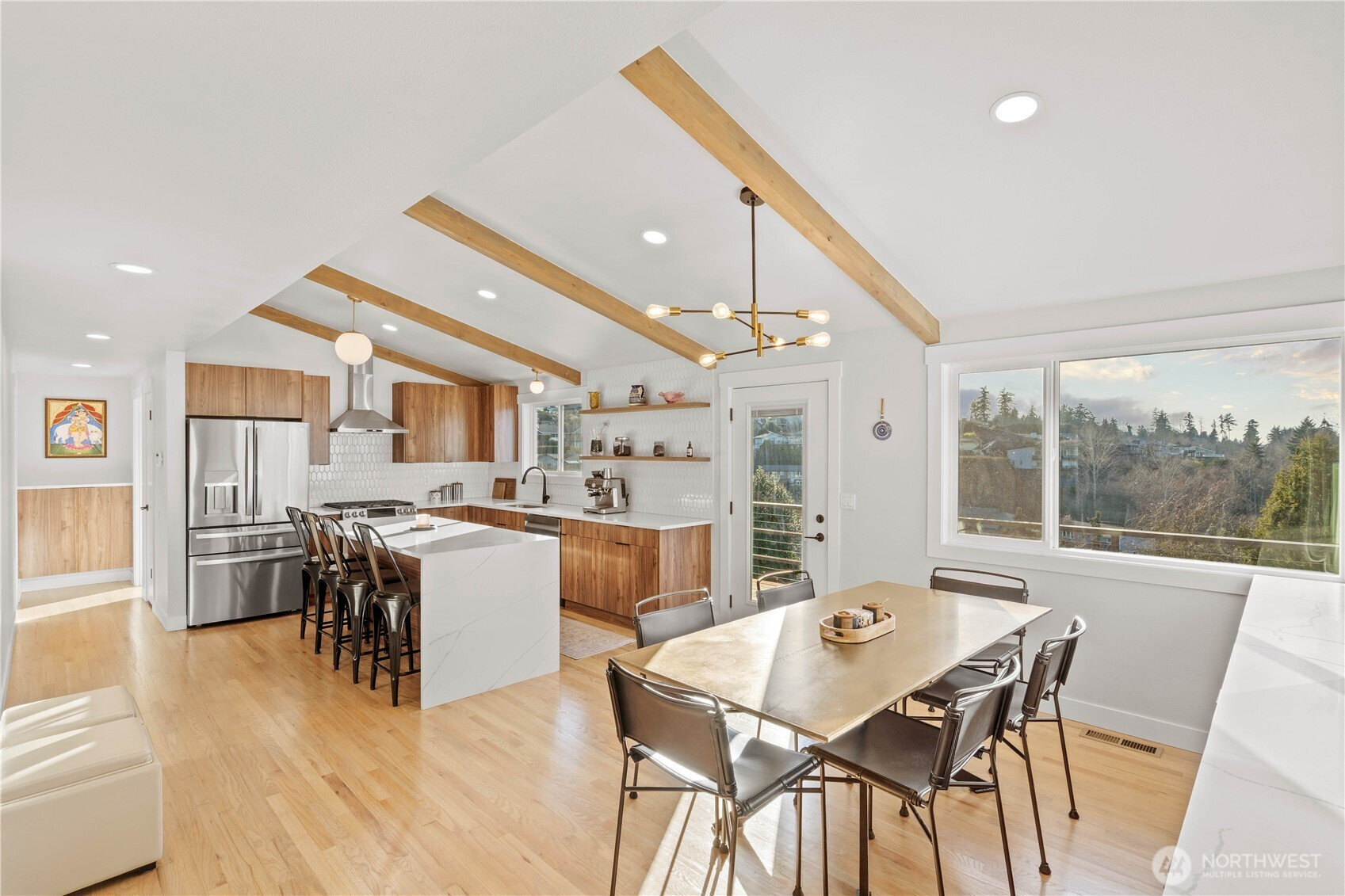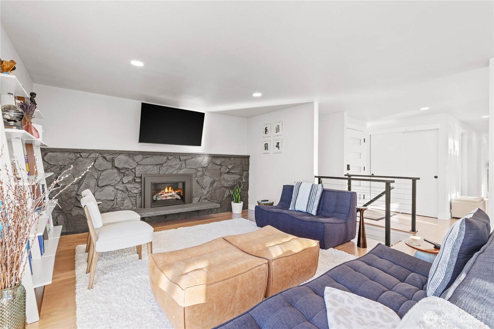 Welcome to this exceptional contemporary Mid-Century Modern home showcasing panoramic Puget Sound views and breathtaking Pacific Northwest sunsets. Clean architectural lines, expansive windows, and refined curb appeal define this luxury coastal retreat. Inside, light-filled living spaces create seamless indoor-outdoor flow ideal for modern living and entertaining. The chef’s kitchen features quartz countertops, custom cabinetry, designer tile backsplash, and an oversized island with abundant storage, blending function and sophistication. The adjacent dining area offers a built-in buffet, creating an elegant setting for intimate gatherings and holiday celebrations. The main-level primary suite is a private sanctuary with a spa-inspired bath, soaking tub, walk-in shower, and dual vanities. New gas fireplace inserts add warmth and ambiance throughout the home. The lower level offers a second primary suite with walk-in closet and an updated bath with designer tile and dual sinks, along with a spacious great room and convenient kitchenette perfect for guests, multi-generational living, or a media lounge. The fully remodeled backyard features a paver patio, custom gas fireplace, new lighting, and fresh landscaping. Layered outdoor living spaces capture stunning Sound views. Just minutes to Redondo Beach and the boardwalk, this is Pacific Northwest luxury living at its finest.