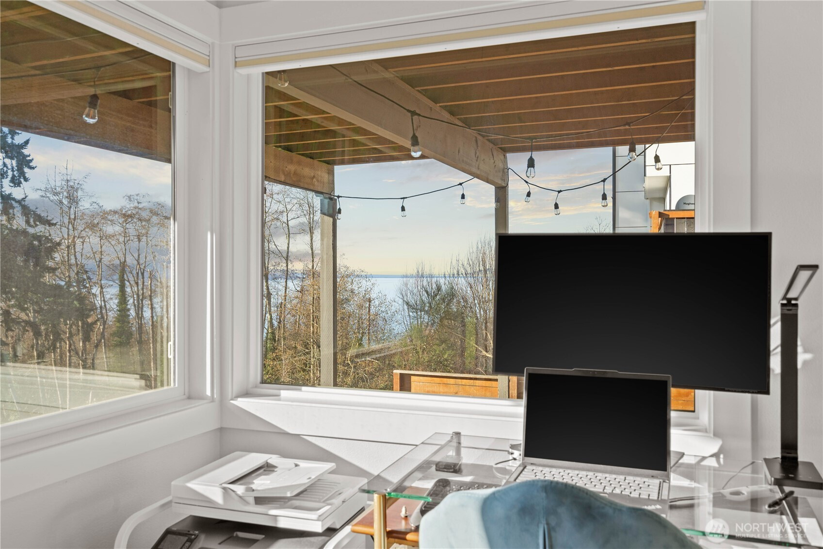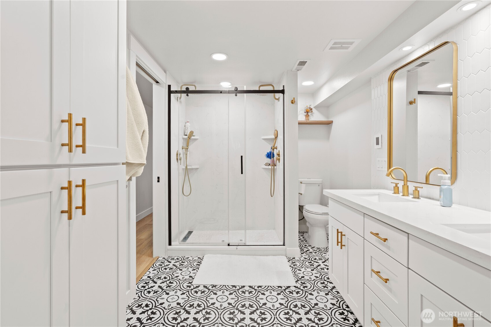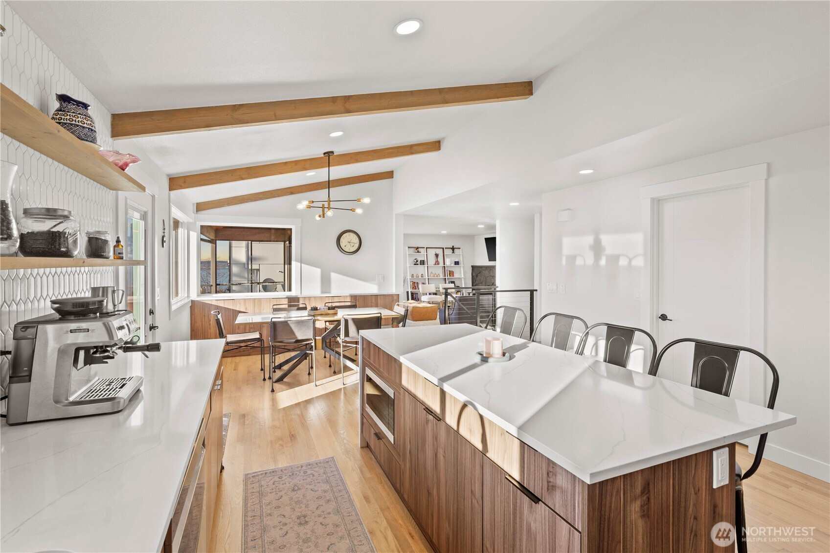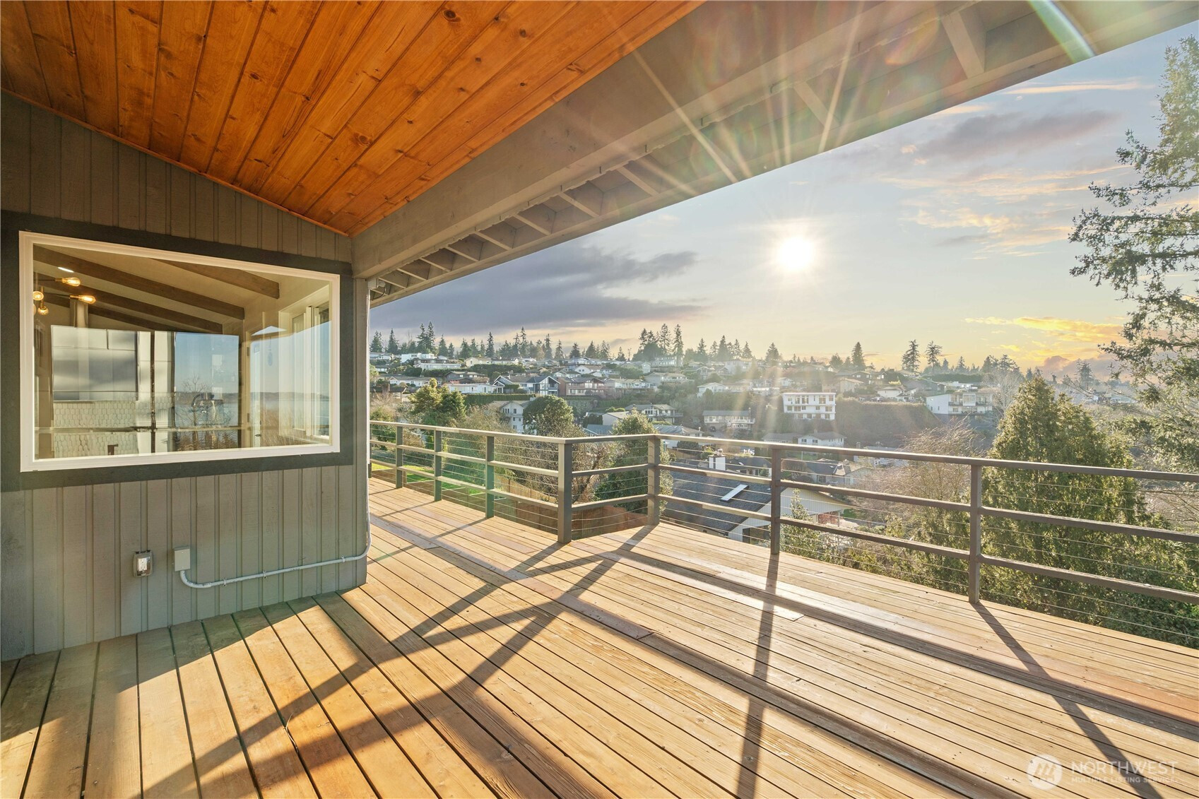 Welcome to this exceptional contemporary Mid-Century Modern home showcasing panoramic Puget Sound views and breathtaking Pacific Northwest sunsets. Clean architectural lines, expansive windows, and refined curb appeal define this luxury coastal retreat. Inside, light-filled living spaces create seamless indoor-outdoor flow ideal for modern living and entertaining. The chef’s kitchen features quartz countertops, custom cabinetry, designer tile backsplash, and an oversized island with abundant storage, blending function and sophistication. The adjacent dining area offers a built-in buffet, creating an elegant setting for intimate gatherings and holiday celebrations. The main-level primary suite is a private sanctuary with a spa-inspired bath, soaking tub, walk-in shower, and dual vanities. New gas fireplace inserts add warmth and ambiance throughout the home. The lower level offers a second primary suite with walk-in closet and an updated bath with designer tile and dual sinks, along with a spacious great room and convenient kitchenette perfect for guests, multi-generational living, or a media lounge. The fully remodeled backyard features a paver patio, custom gas fireplace, new lighting, and fresh landscaping. Layered outdoor living spaces capture stunning Sound views. Just minutes to Redondo Beach and the boardwalk, this is Pacific Northwest luxury living at its finest.