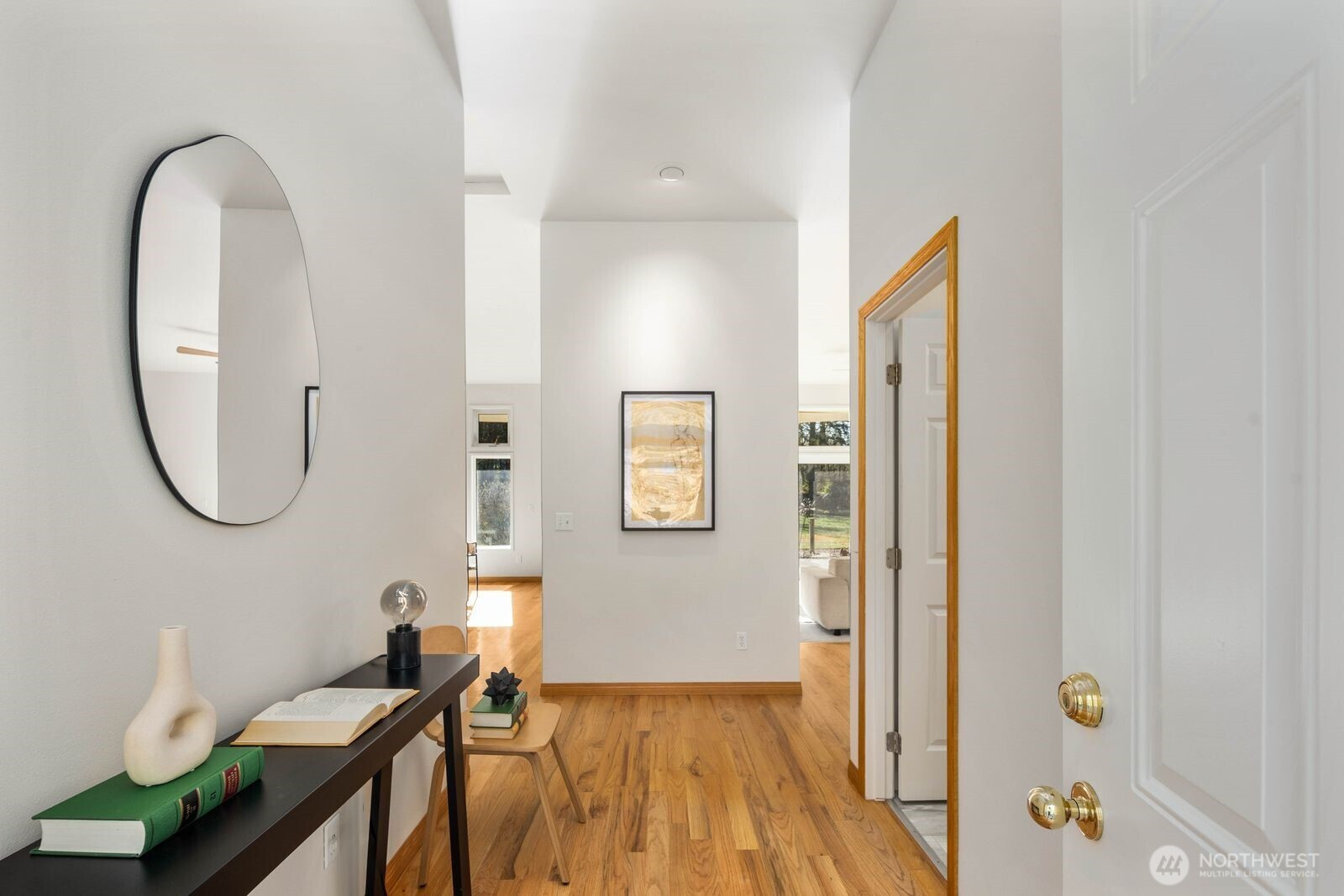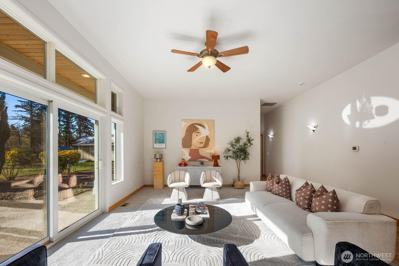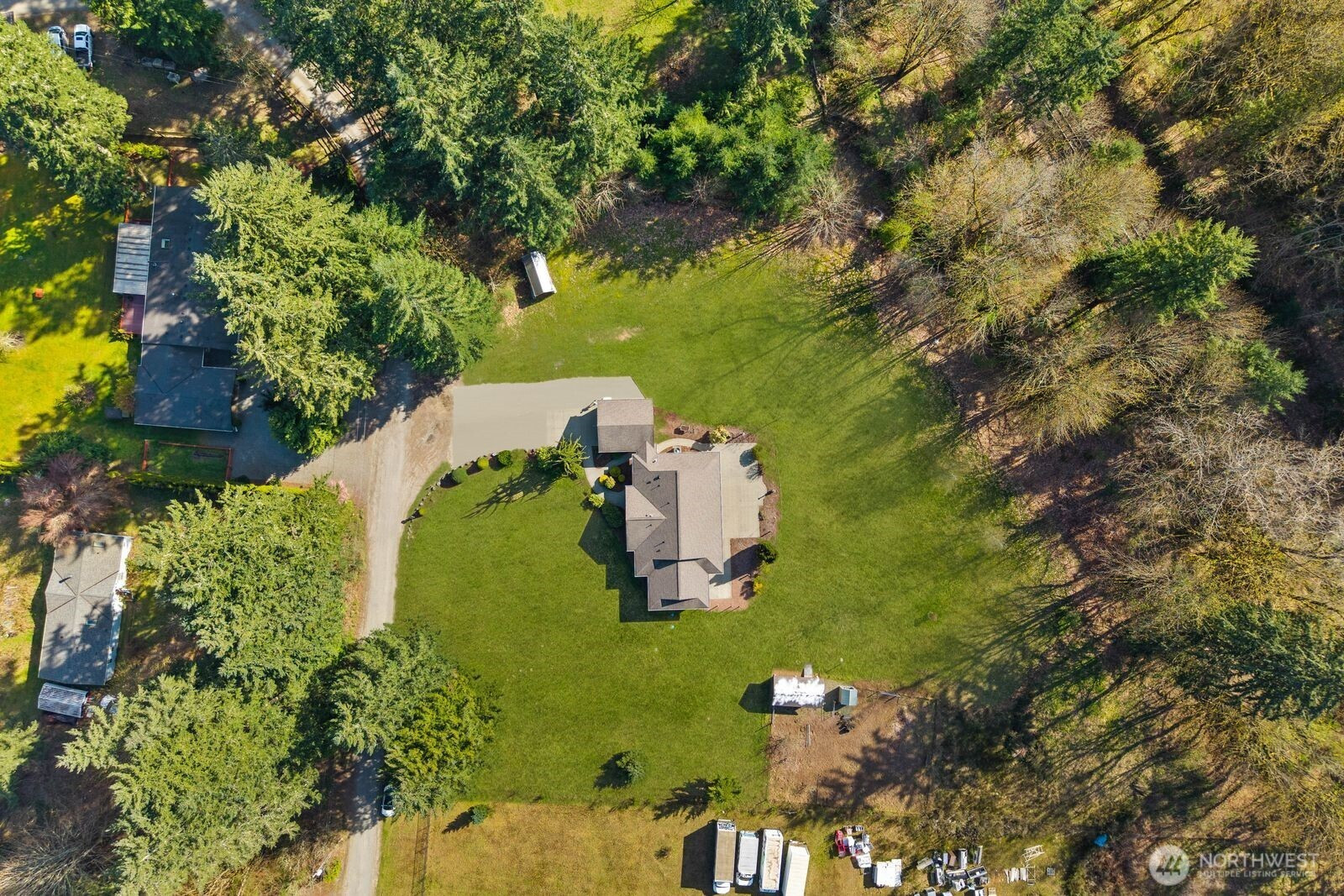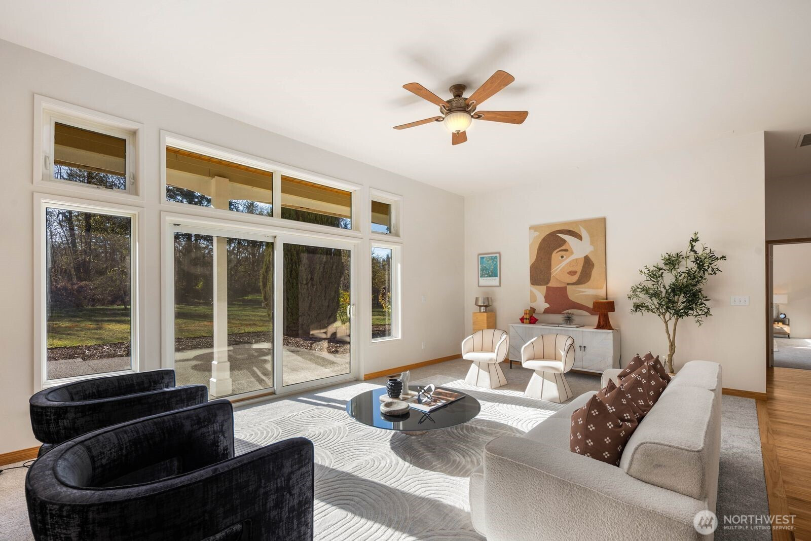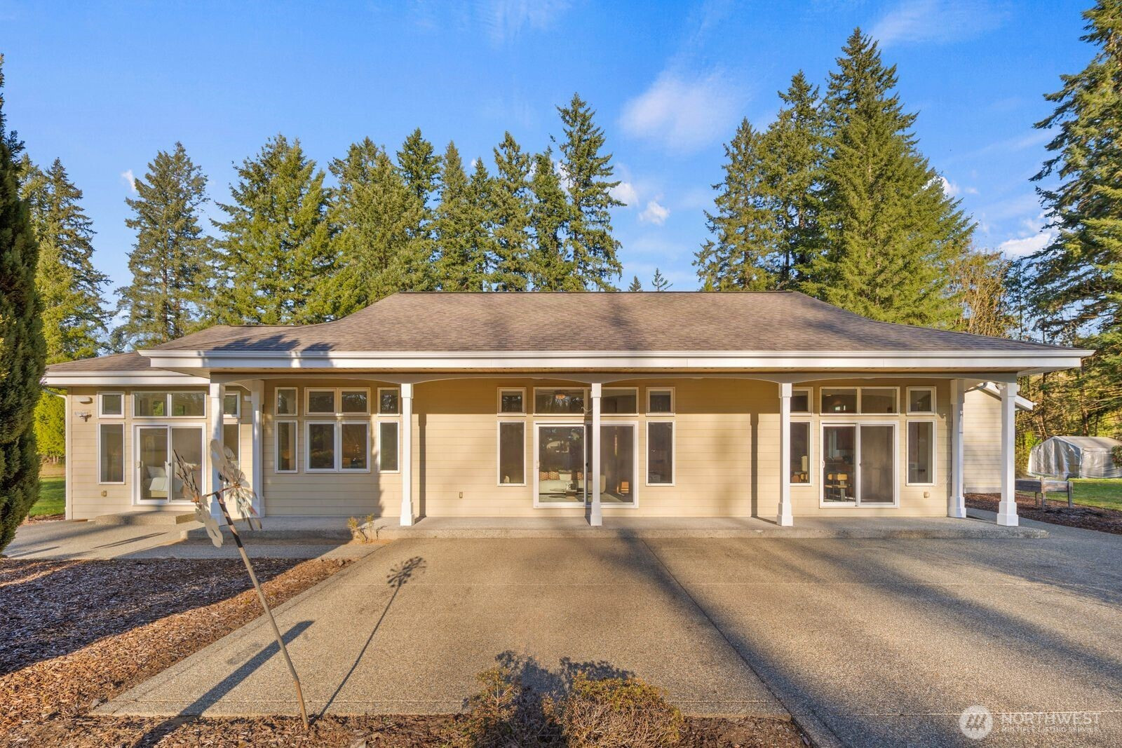 This 2,030-square-foot custom-built rambler features 3 bedrooms and 2 bathrooms, situated on a level 2.4-acre lot. The home has been livingly refreshed with new interior paint and brand-new carpet, complemented by floor-to-ceiling windows that provide natural light and views of the private lot. Hardwood floors run throughout the living spaces, leading to a kitchen finished with Viking appliances and solid surface countertops. The primary suite includes a large closet with custom built-ins, an attached full bath, and direct access to an expansive covered back patio with tongue and groove cedar soffits. Beyond the covered area, a large poured concrete patio features hot tub hookups, offering a significant footprint for outdoor living. The property includes a detached two-car garage with a shop, an additional storage shed, and a massive garden space with berry bushes and fruit trees ready for this year's planting. Essential infrastructure enhancements include an automatic whole-house generator and private well. Backing up to a protected greenbelt, this estate offers a private setting while maintaining efficient access to Highway 18 for commuters.
