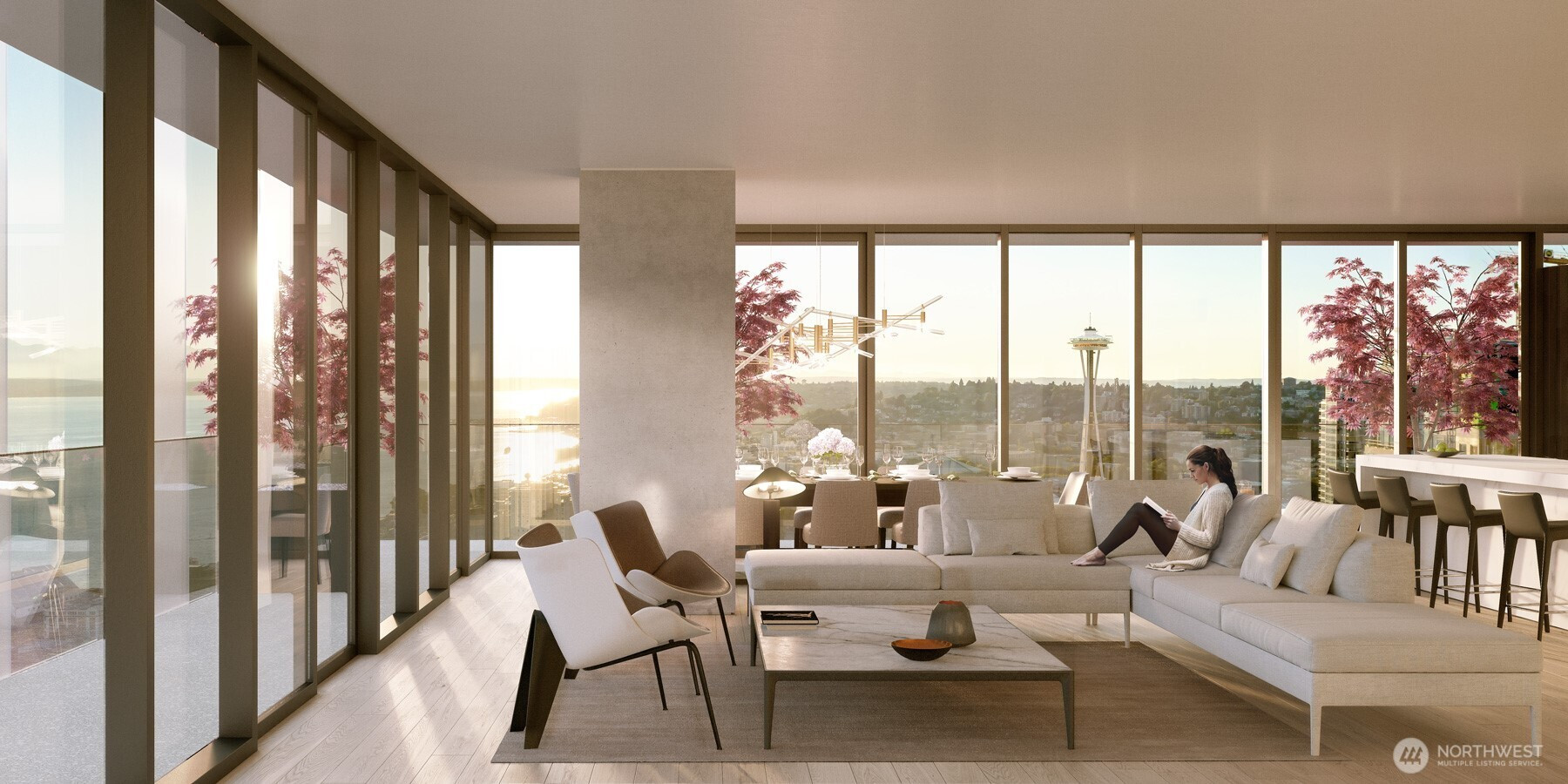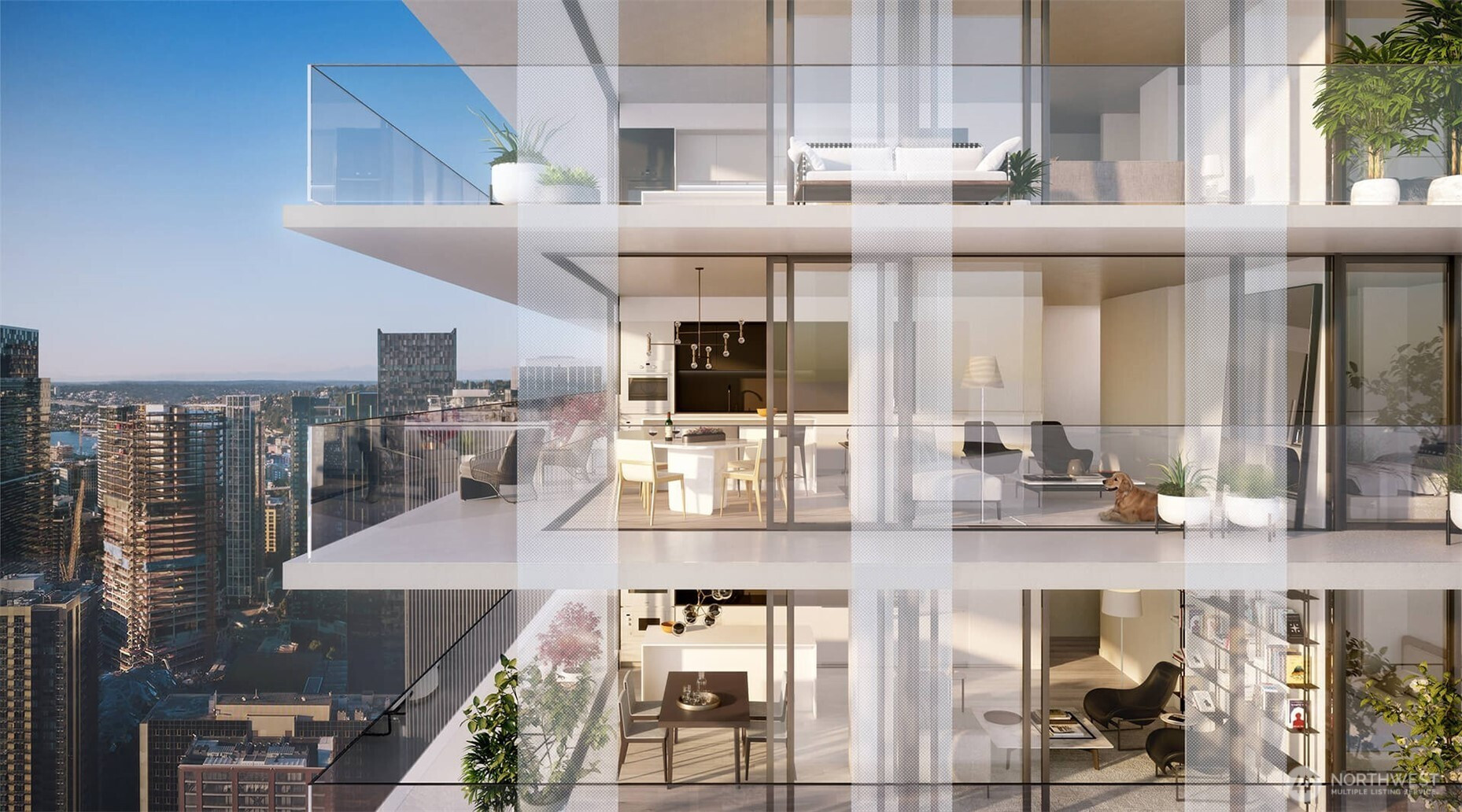 First Light, designed by architect James KM Cheng and glass artist John Hogan is Westbank’s latest residential tower in Downtown Seattle. This Northwest Urban 1 Bedroom Home offers an open, efficient layout, with a spacious balcony and one full bathroom. Floor-to-ceiling, triple-paned windows allow for spectacular views of Elliot Bay, and the Olympic Mountains. Each home features custom-designed interiors by the architect and includes custom B&B Italia cabinetry, light finishes with contrasting details, Kohler fixtures, Miele appliances, keyless entry and hardwoods throughout. Amenities include a 47th floor 25-meter rooftop sky pool & jacuzzies, a rooftop garden, fitness & wellness center, bike lounge, pet play area, spa & resident’s lounge