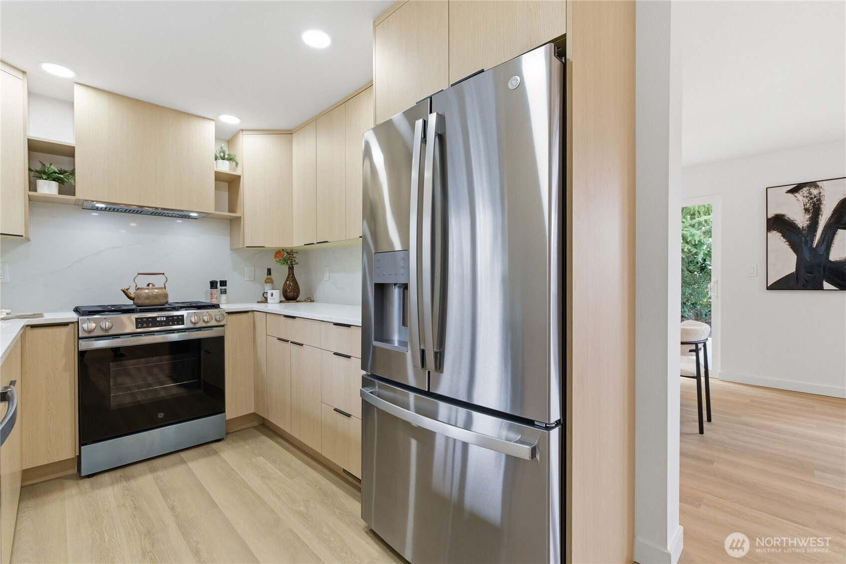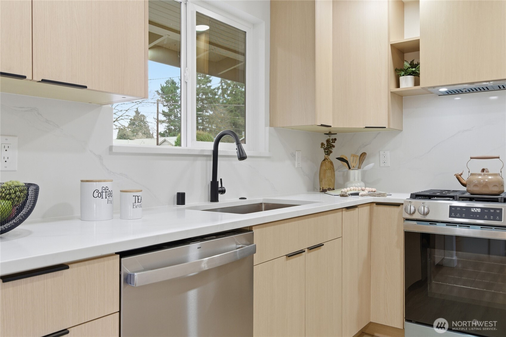 Beautifully updated single-level home offering modern style, functional living, and inviting outdoor space in a quiet Federal Way neighborhood. This 3-bedroom, 1.75-bath residence features a bright open layout with new flooring, fresh finishes, and abundant natural light throughout. The fully remodeled kitchen showcases sleek cabinetry, quartz countertops, and stainless-steel appliances, flowing seamlessly into the dining and living areas—perfect for everyday living and entertaining. Relax in the spacious living room with a contemporary fireplace feature wall, or unwind in the updated bathrooms with stylish vanities and designer touches. Generous bedrooms provide comfort and flexibility for guests, work-from-home needs, or hobbies. Outside, enjoy a large yard with a private deck and fire pit area ideal for gatherings year-round. The attached garage, ample driveway parking, and mature landscaping add both convenience and curb appeal. Move-in ready and thoughtfully upgraded, this home combines modern design with easy, single-level living close to schools, parks, shopping, and commuter routes.