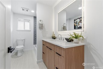 Beautifully updated single-level home offering modern style, functional living, and inviting outdoor space in a quiet Federal Way neighborhood. This 3-bedroom, 1.75-bath residence features a bright open layout with new flooring, fresh finishes, and abundant natural light throughout. The fully remodeled kitchen showcases sleek cabinetry, quartz countertops, and stainless-steel appliances, flowing seamlessly into the dining and living areas—perfect for everyday living and entertaining. Relax in the spacious living room with a contemporary fireplace feature wall, or unwind in the updated bathrooms with stylish vanities and designer touches. Generous bedrooms provide comfort and flexibility for guests, work-from-home needs, or hobbies. Outside, enjoy a large yard with a private deck and fire pit area ideal for gatherings year-round. The attached garage, ample driveway parking, and mature landscaping add both convenience and curb appeal. Move-in ready and thoughtfully upgraded, this home combines modern design with easy, single-level living close to schools, parks, shopping, and commuter routes.