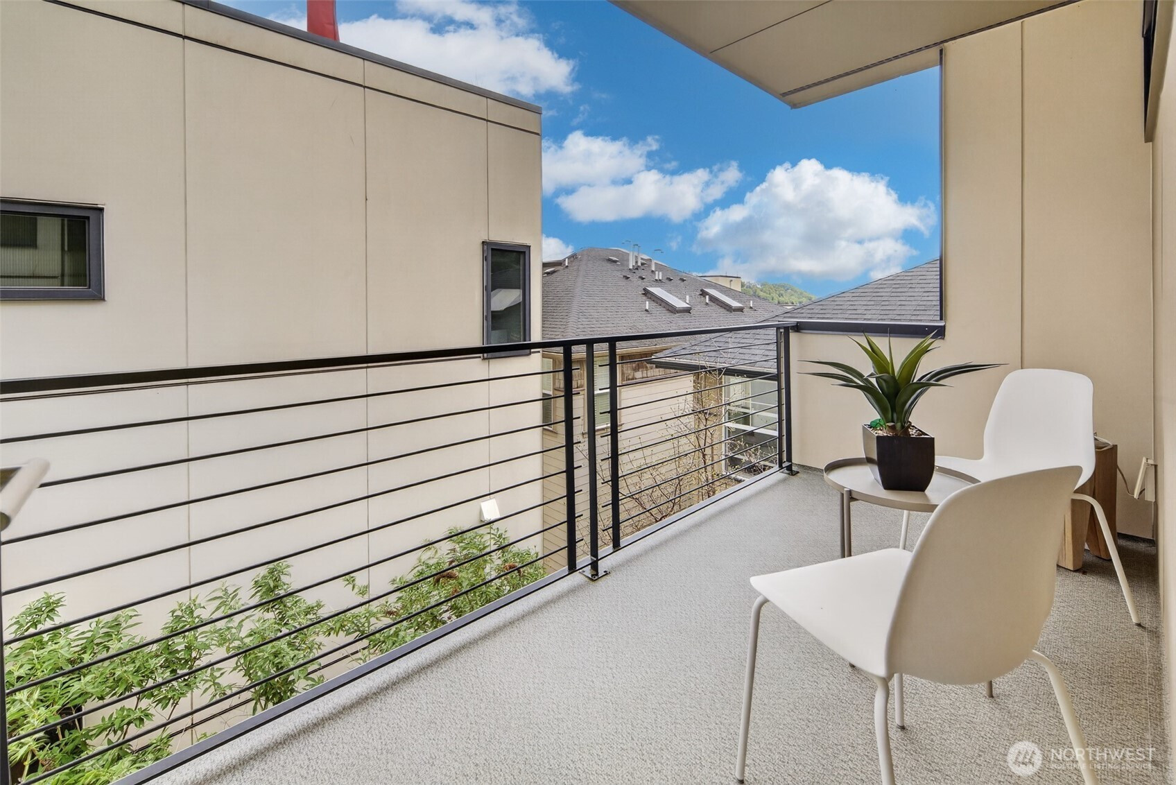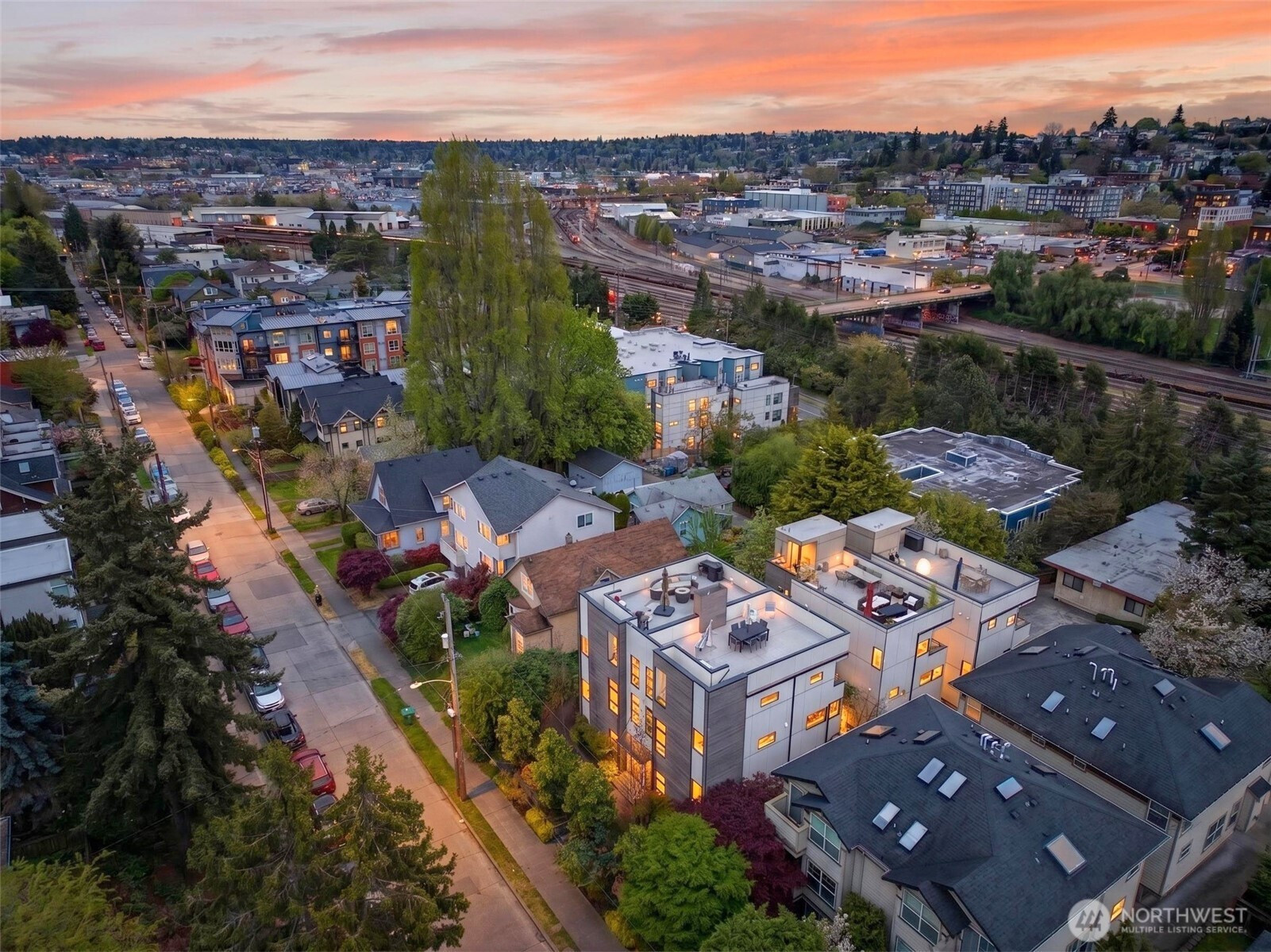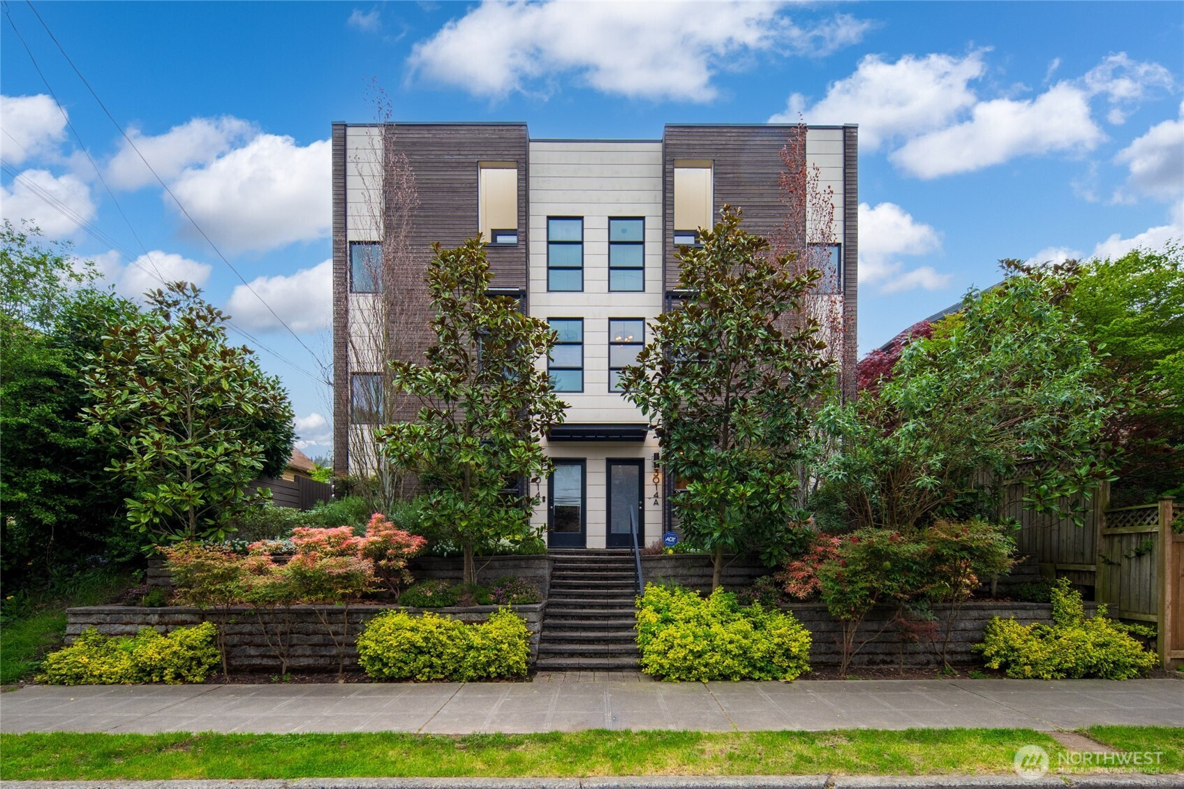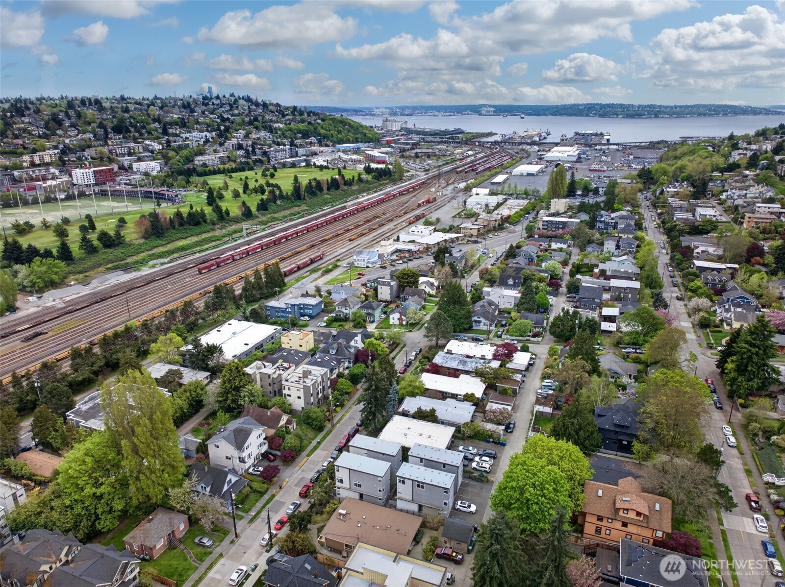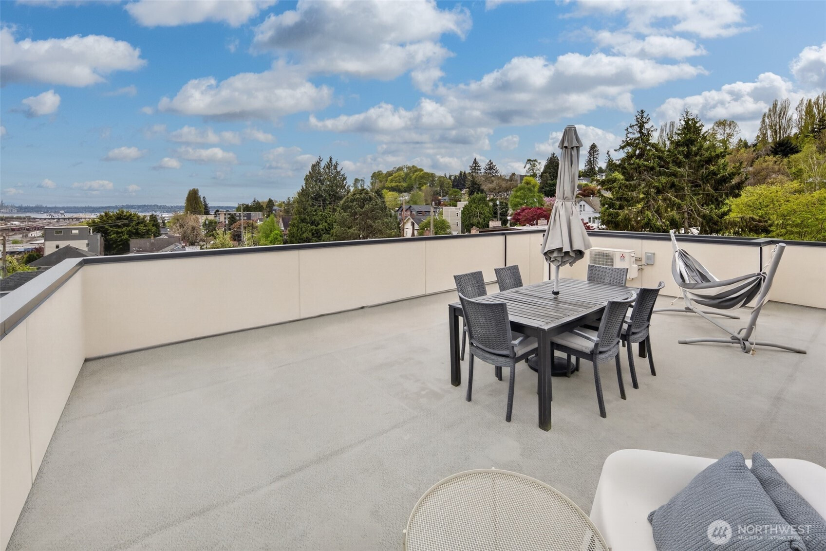 Discover Southeast Magnolia living from this architecturally distinctive 2015 townhome, where a soaring atrium rises the full height of the building, connecting all three levels through open steel-cable railings and tall windows that pull natural light deep into every floor. The entry level holds two bedrooms alongside a laundry room, keeping the main living level open for what it does best. Up one floor, the open plan is anything but generic. Corner windows facing east pour morning light across a main level designed with intention, a proper dining space alongside a distinct living area, anchored by a gas fireplace. Dark flat-panel cabinetry runs against white quartz counters and a clean island with bar seating. GE appliances and a Zephyr range hood complete a kitchen that is suited for weeknight dinners and weekend hosting. This is not your everyday townhome floor plan. The primary suite occupies the top floor with its own private balcony. The en-suite bath has a dual vanity, dark cabinetry, and a glass-enclosed shower and soaking tub. Above that, the rooftop deck delivers territorial and water views with real privacy from neighboring units. Step outside and you are choosing between a morning at Discovery Park, an afternoon at Chittenden Locks watching boats work through to Lake Union, or dinner at Chinook's with a view across the marina. Dedicated off-alley parking. This is the Magnolia lifestyle at its best. Come experience it.